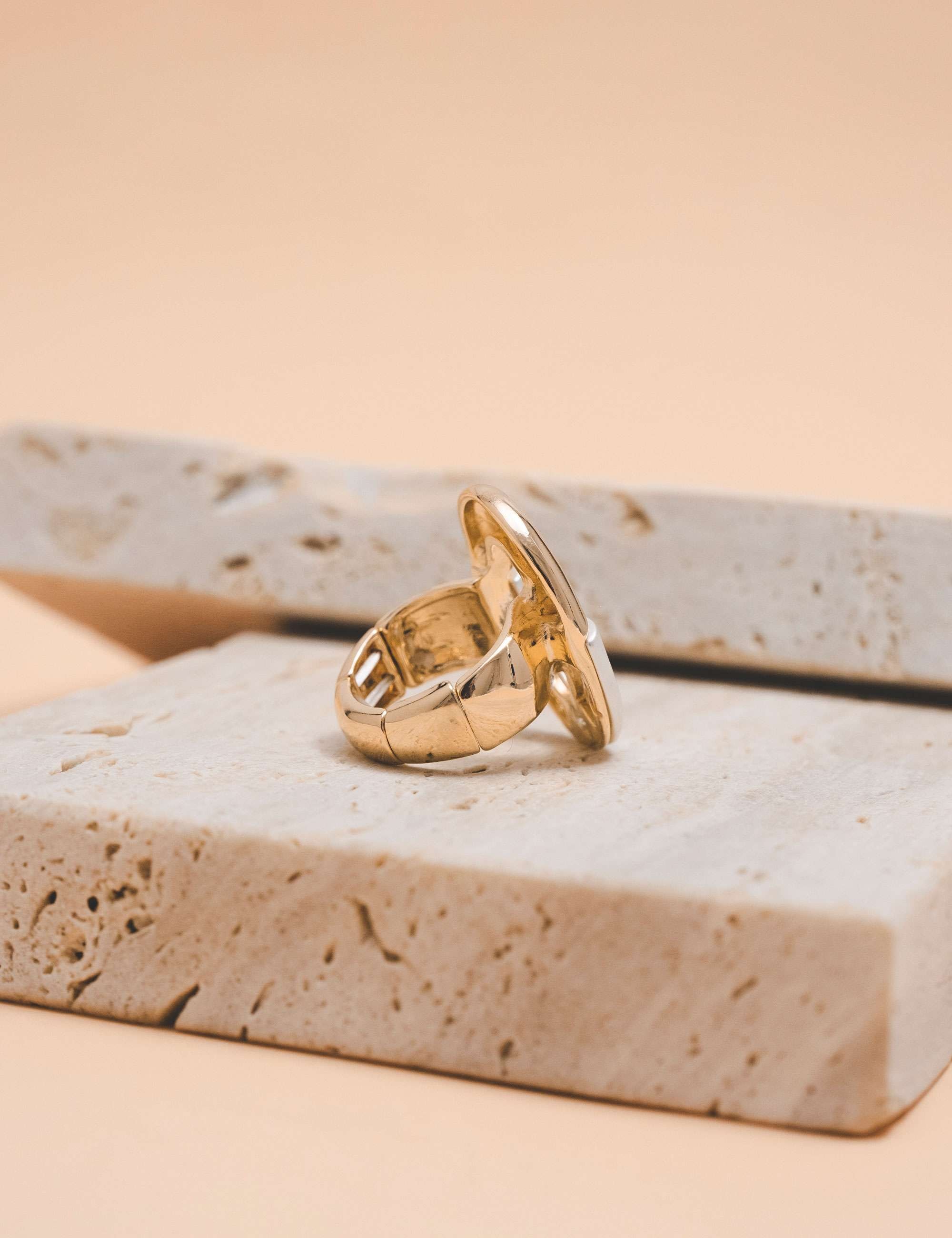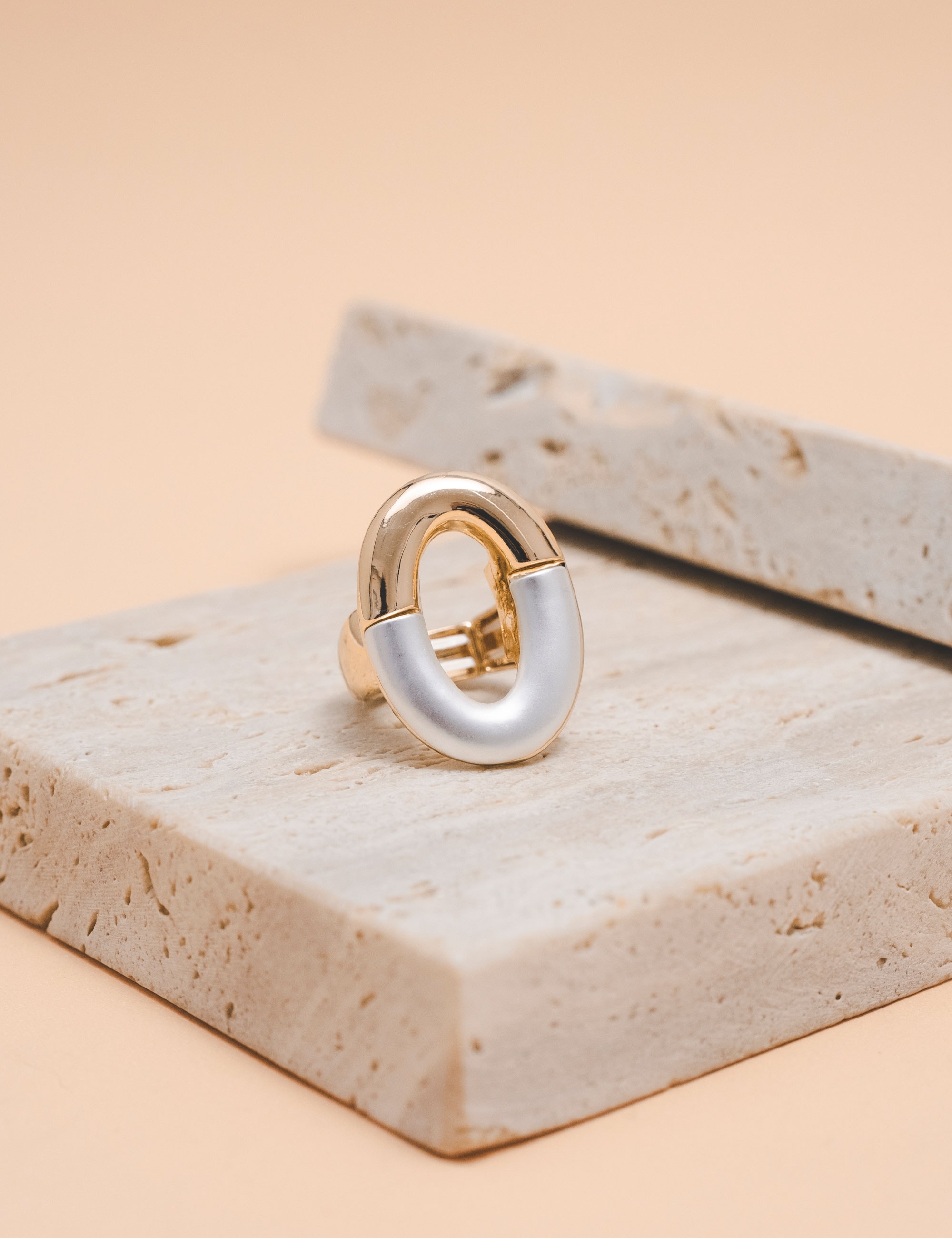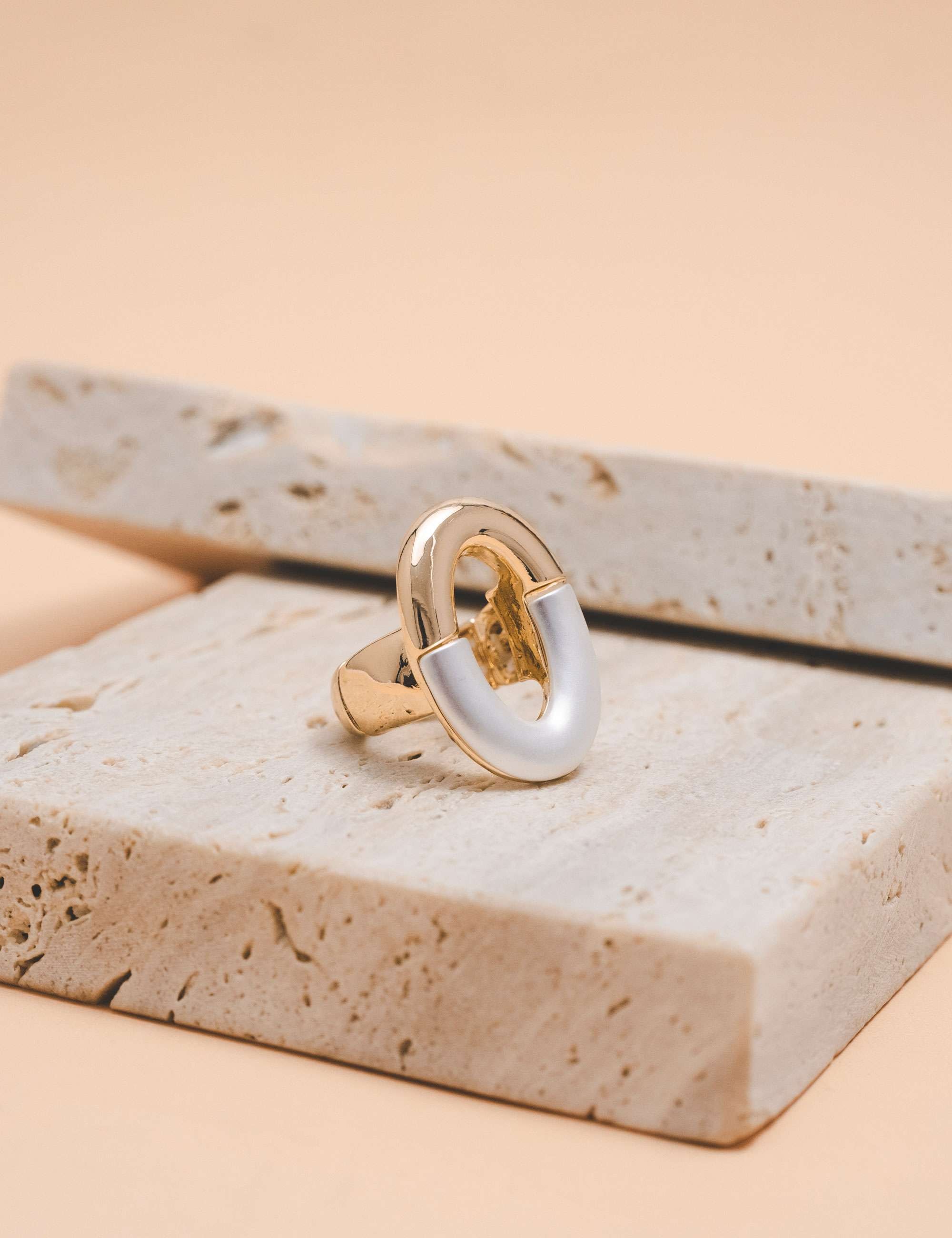 Peça: Um anel de Bianco fosco e Ouro duplo. Esta peça apresenta um acabamento fosco que adiciona uma elegância discreta e contemporânea ao seu estilo, sendo perfeito para quem busca um acessório sofisticado e versátil.