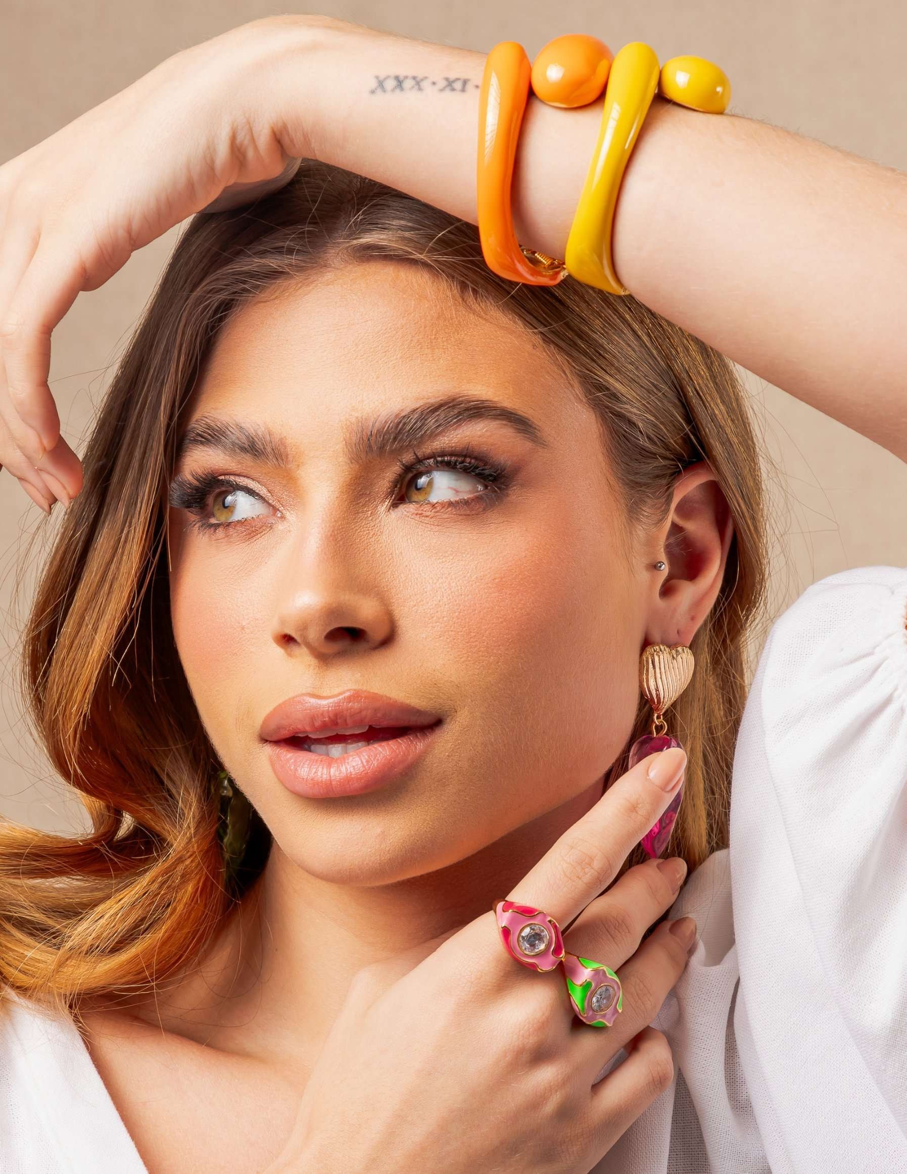 Todos os nossos metais são banhados a ouro, possuem camada protetiva para bijuterias finas e também possuem camada de metal precioso em sua composição. As bijuterias precisam de cuidados, limpe-as com flanela seca e macia, evite contato direto com cosméticos, areia, praia e piscina.