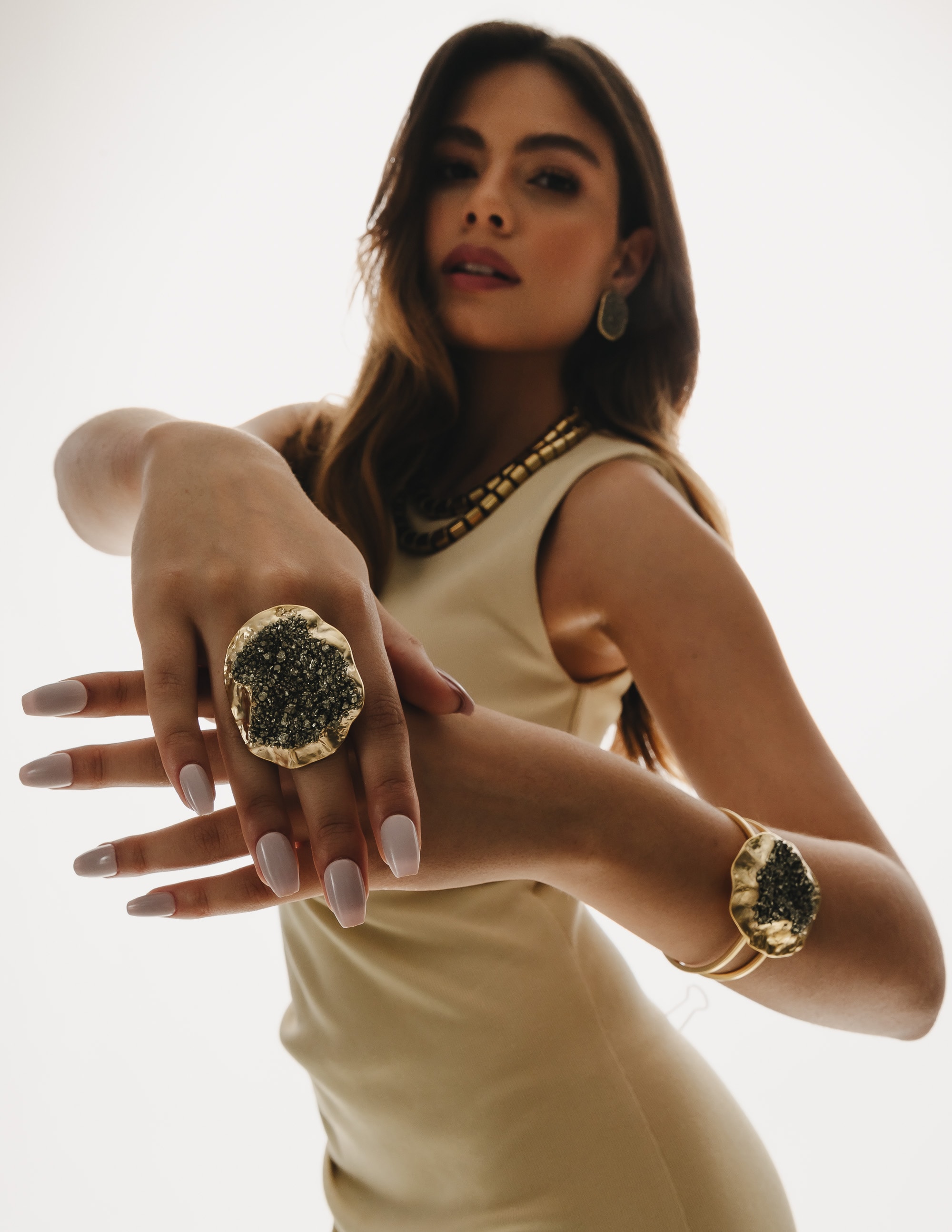 Todos os nossos metais são banhados a ouro, possuem camada protetiva para bijuterias finas e também possuem camada de metal precioso em sua composição. As bijuterias precisam de cuidados, limpe-as com flanela seca e macia, evite contato direto com cosméticos, areia, praia e piscina.