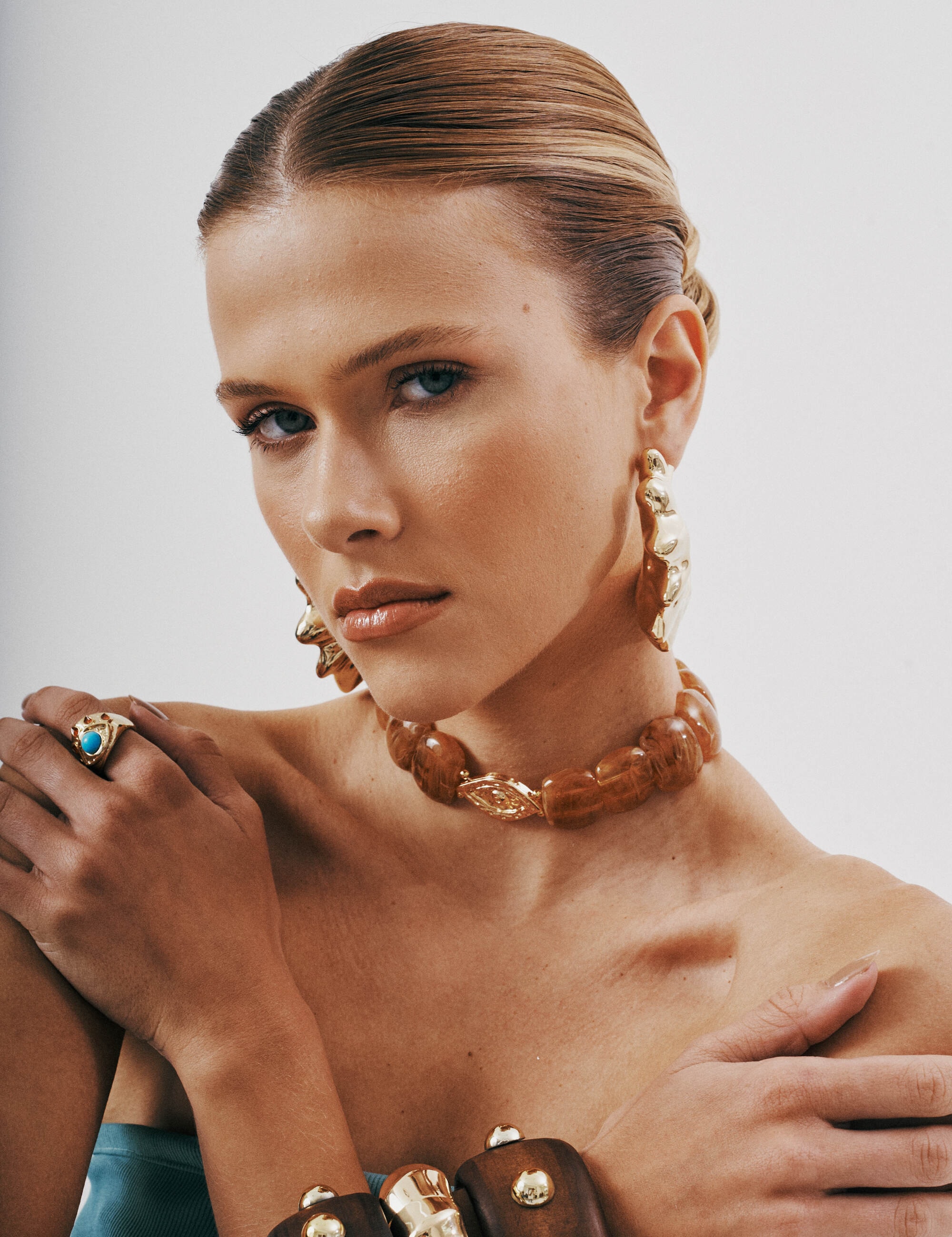 Todos os nossos metais são banhados a ouro, possuem camada protetiva para bijuterias finas e também possuem camada de metal precioso em sua composição. As bijuterias precisam de cuidados, limpe-as com flanela seca e macia, evite contato direto com cosméticos, areia, praia e piscina.
