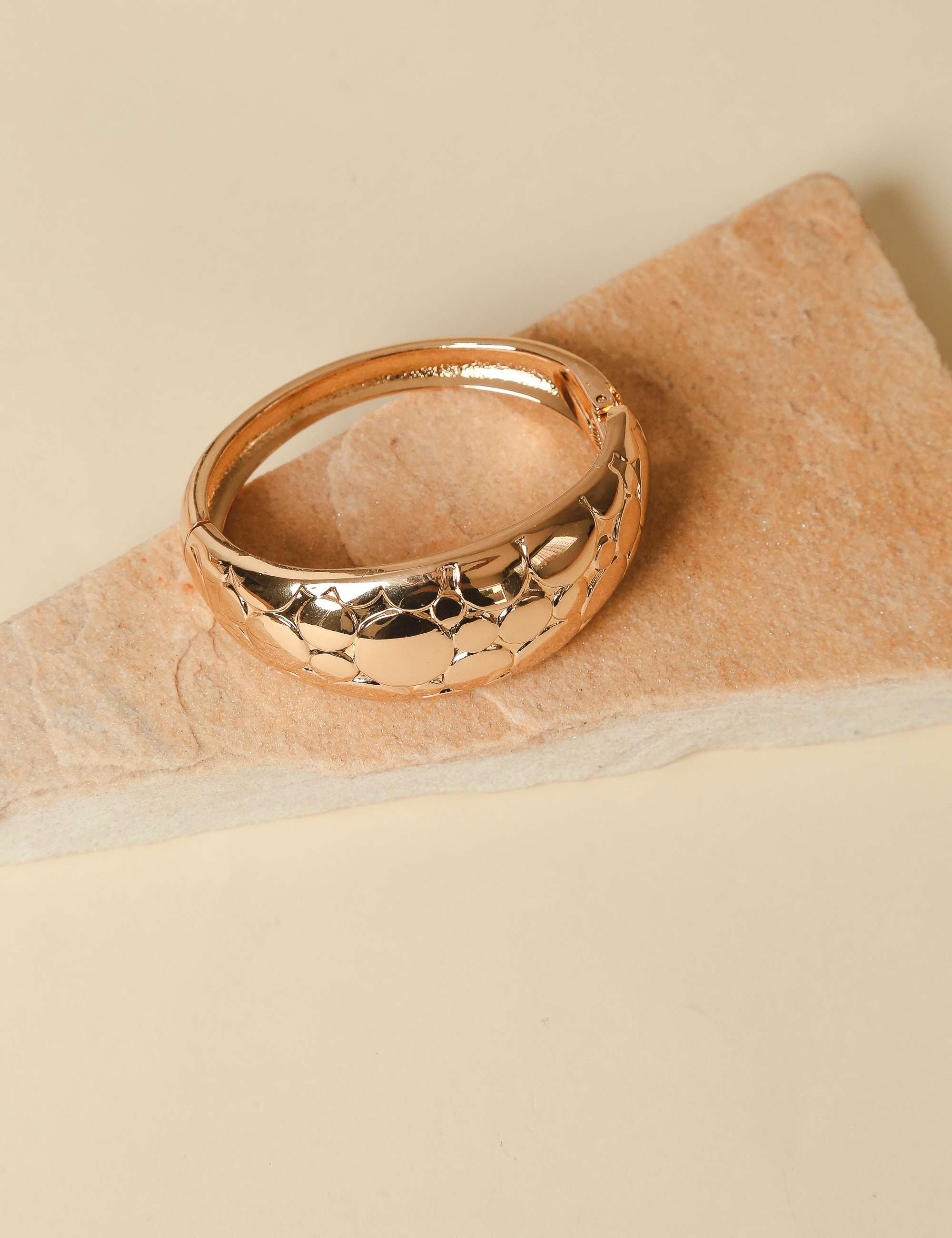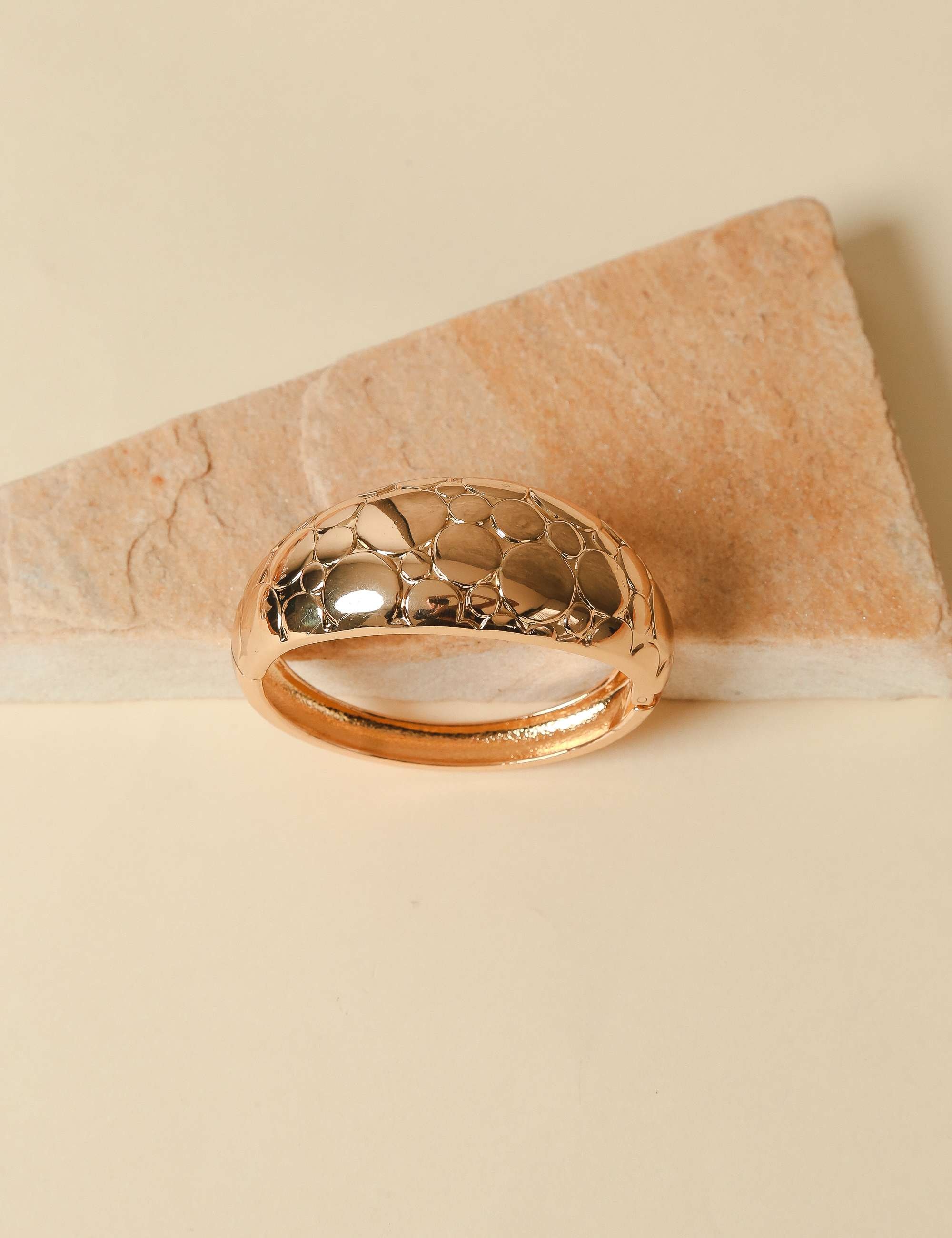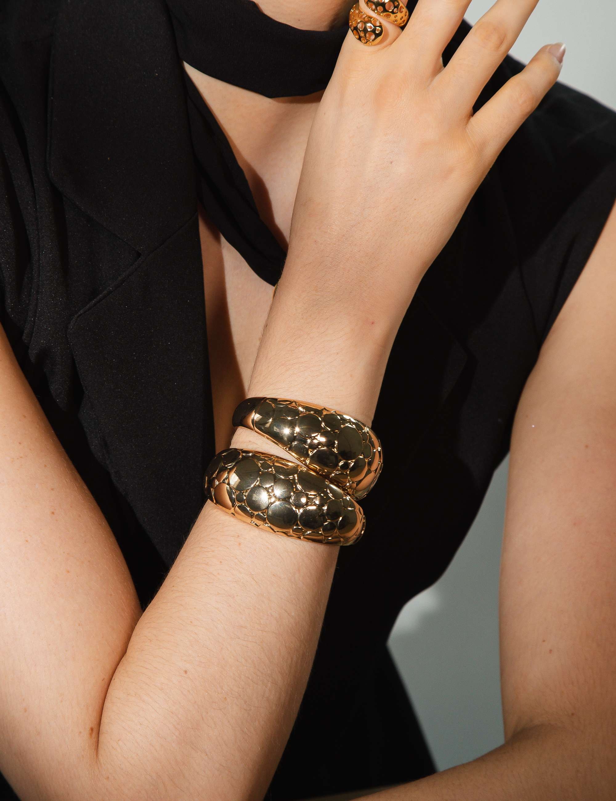 Bracelete de mola com formatos de bolha, banhado a ouro. Bracelete que traz presença e estilo, além de ser uma peça versátil e atemporal, para usar sem medo de ser feliz.