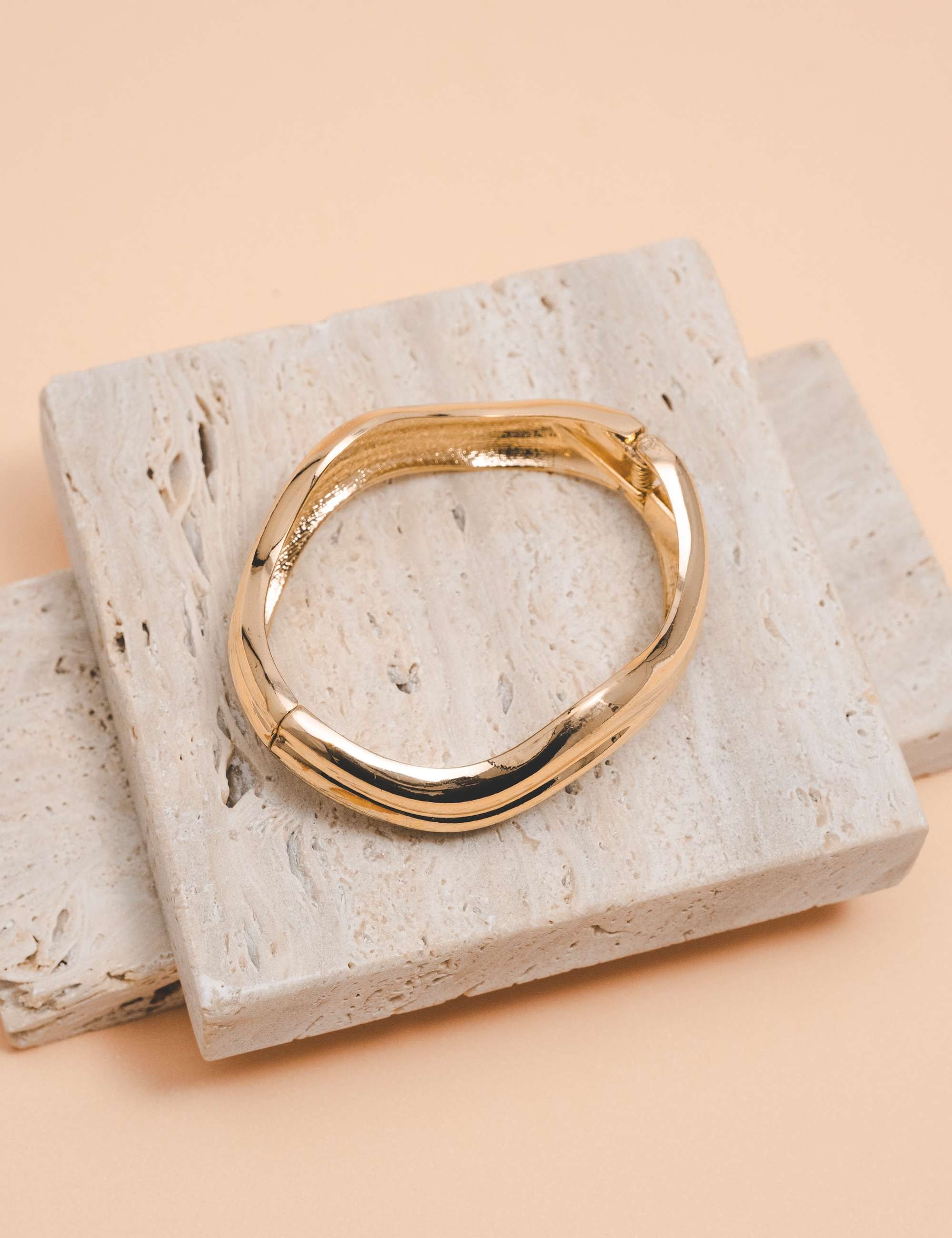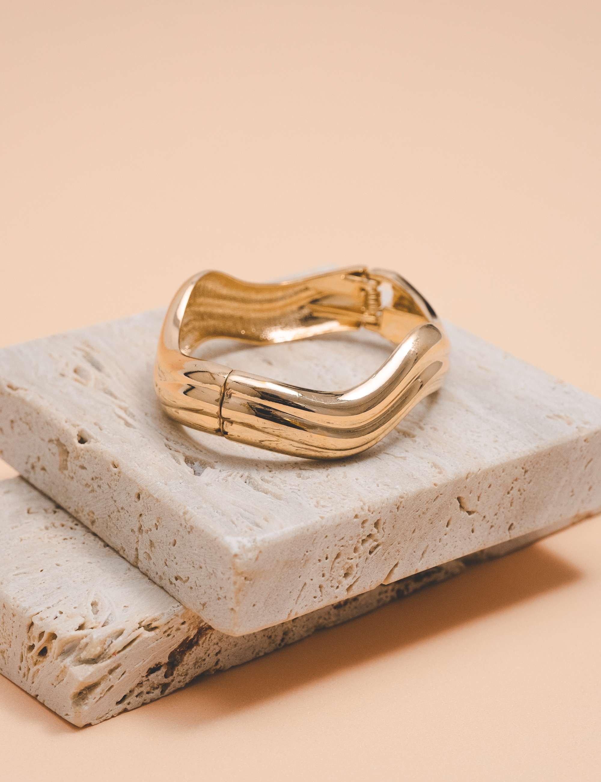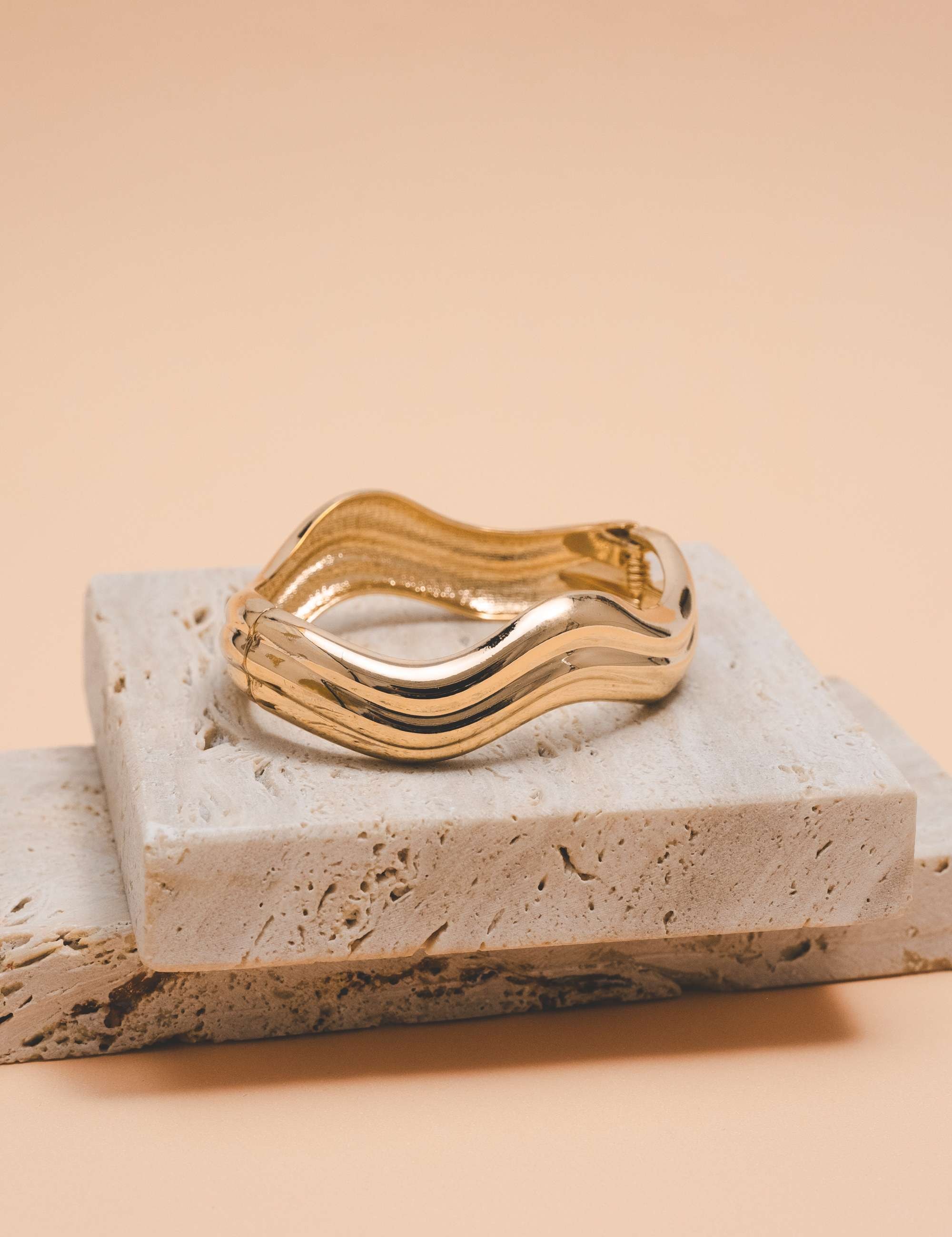 Peça: Bracelete com formato ondulado Este acessório traz uma sensação de movimento e fluidez ao visual, adicionando um toque de elegância e sofisticação.