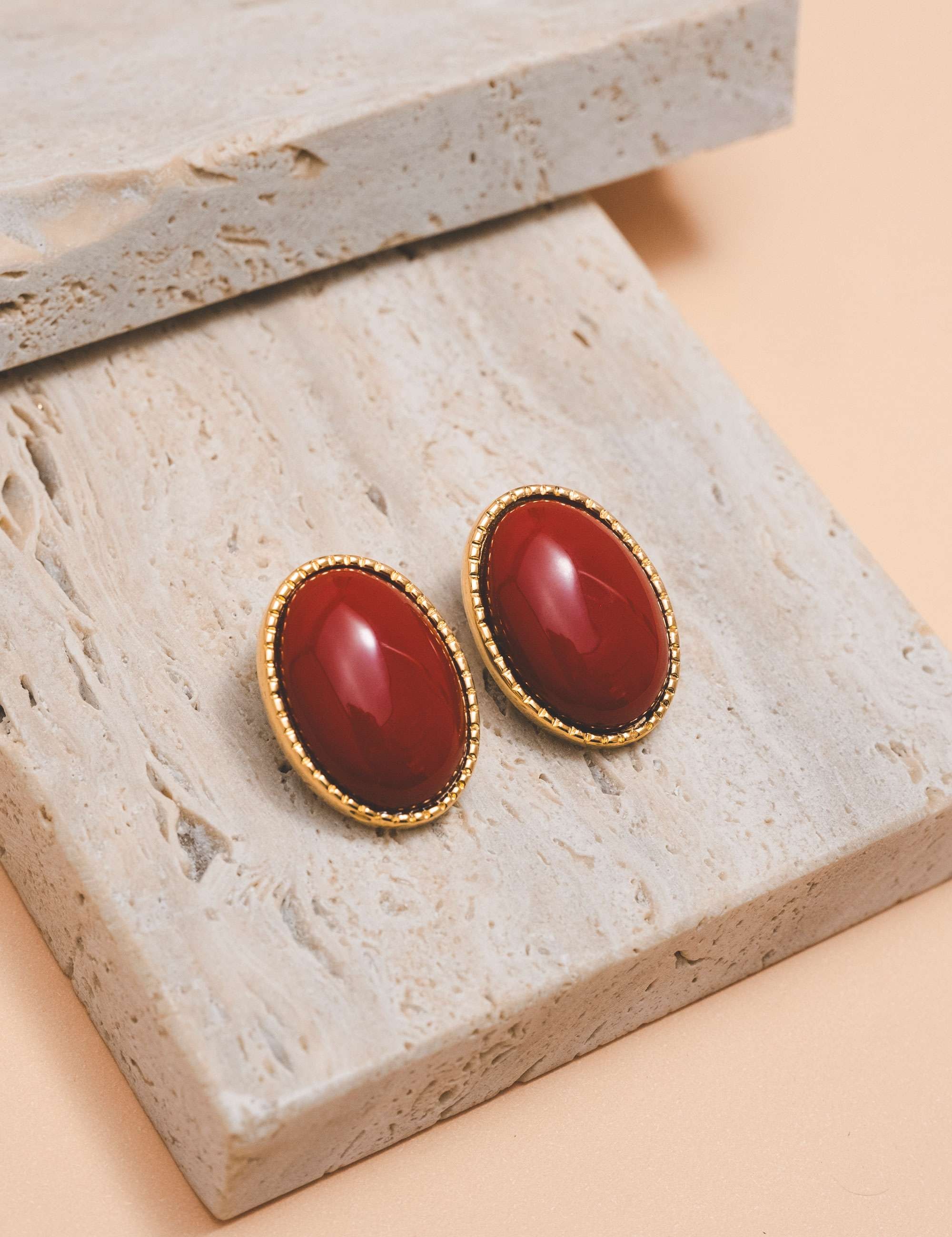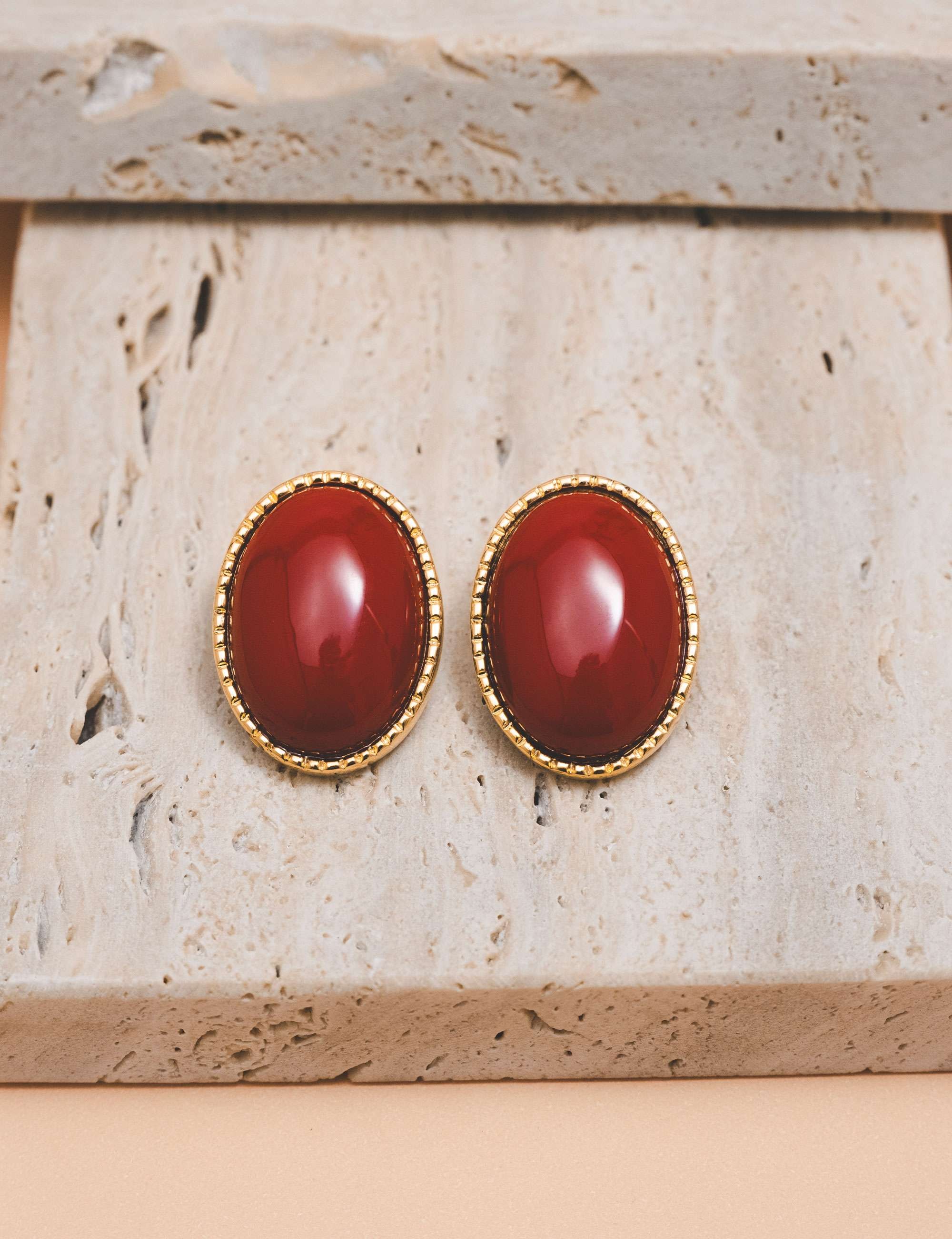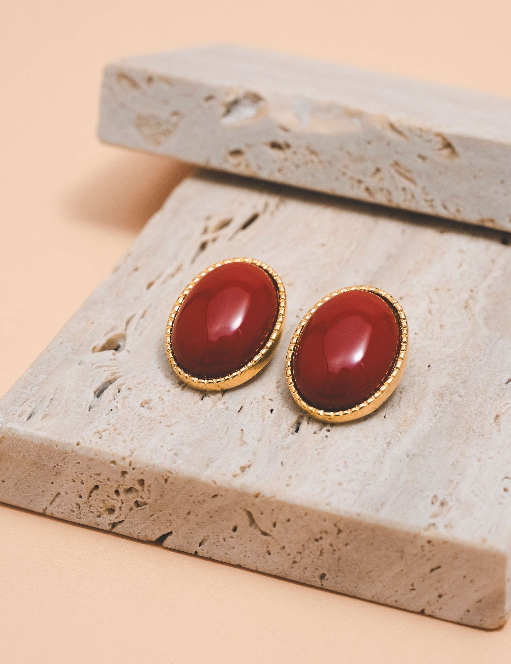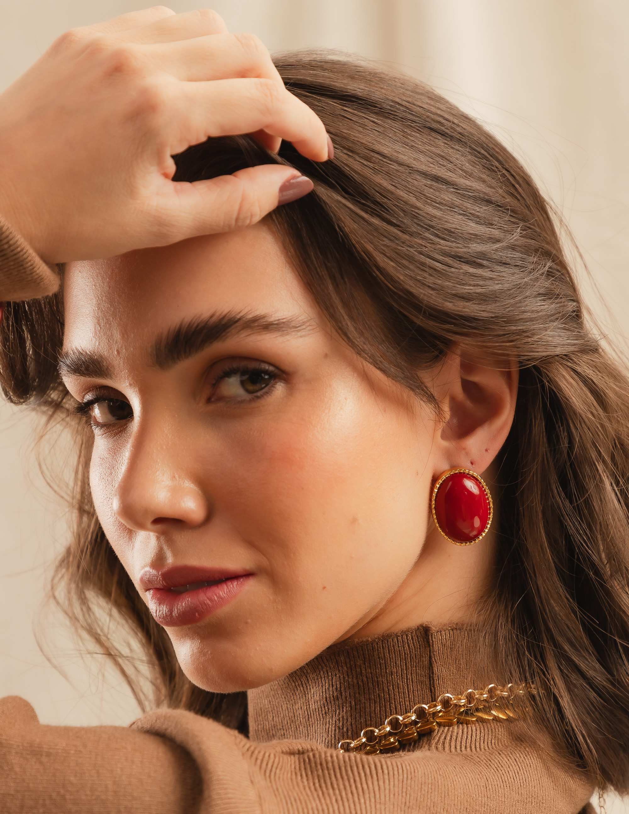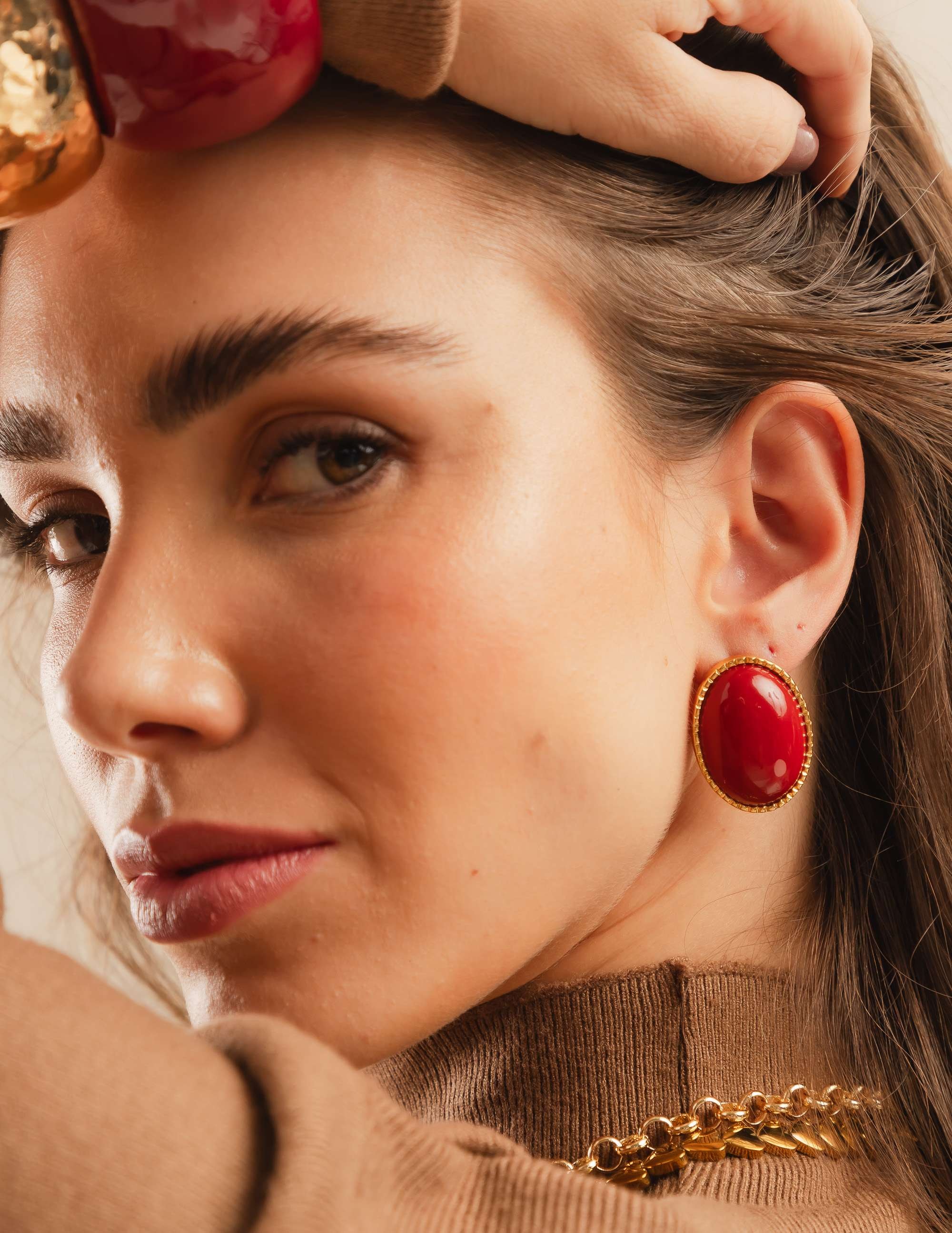 Peça: Brinco em formato oval em tons vermelho e detalhes em ouro Os acessórios orgânicos são a escolha perfeita para quem busca adicionar um toque de estilo e elegância ao seu visual.