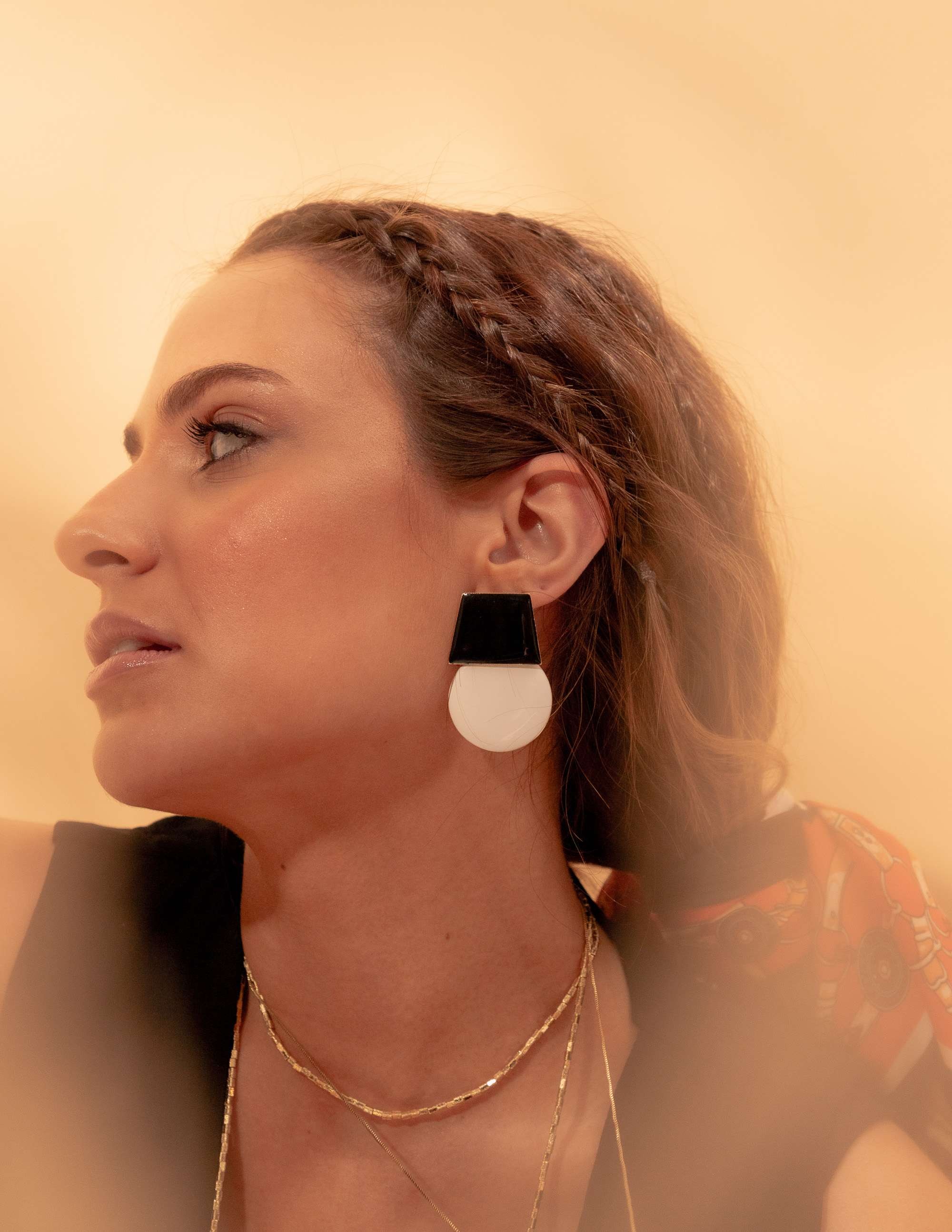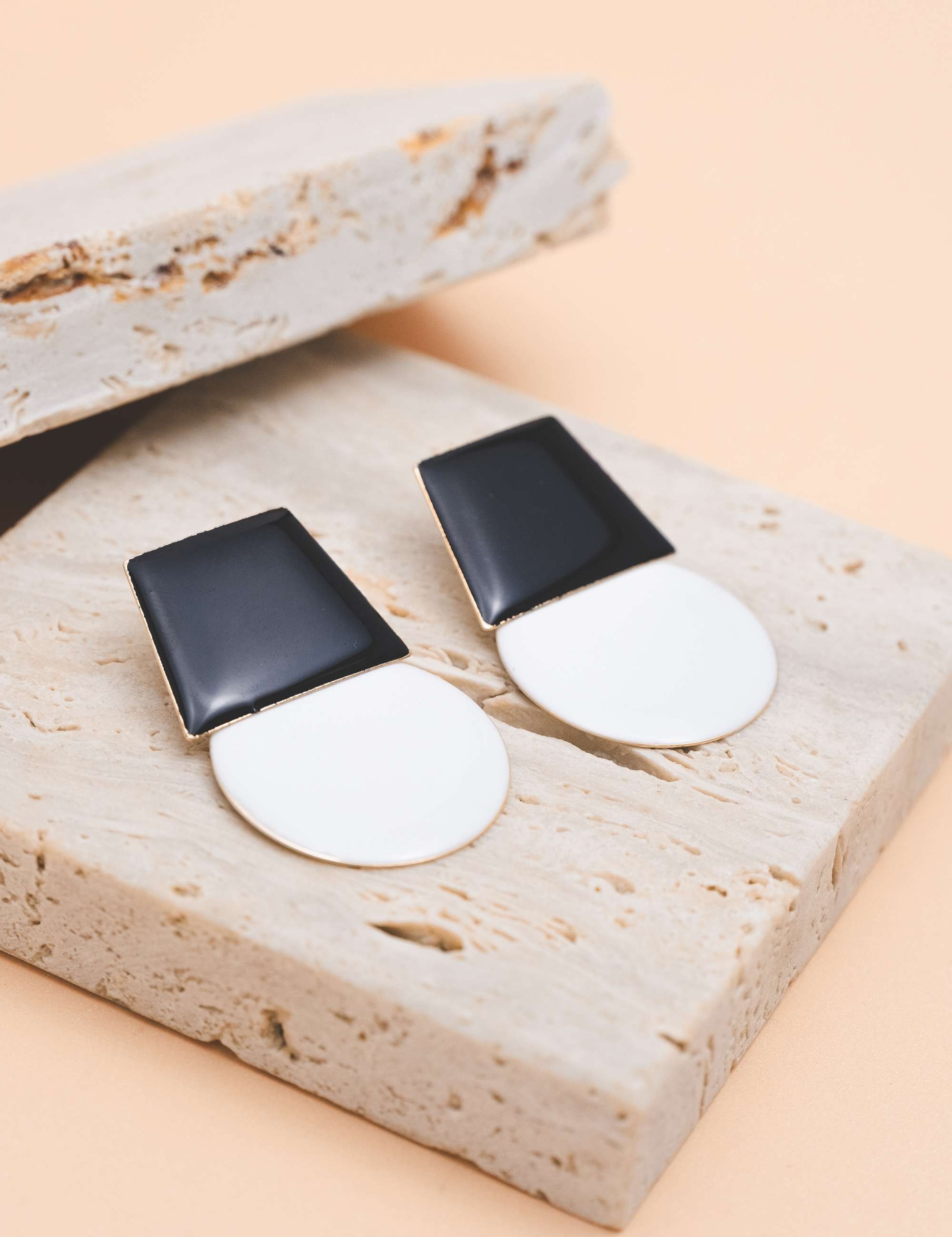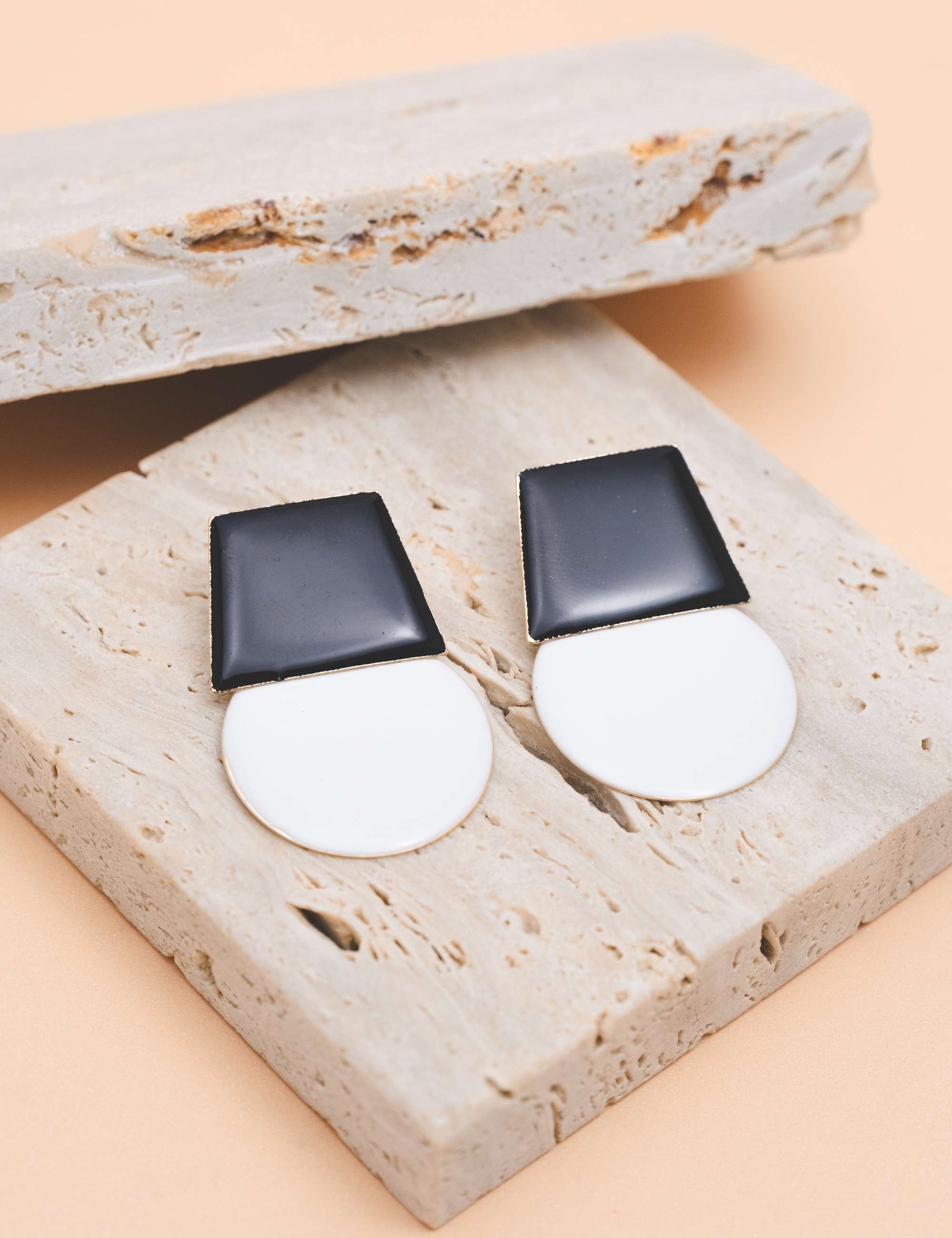 Brinco pêndulo em formato geométrico, base na esmaltação preto e pêndulo no branco. Peça latao, banhado a ouro, esmaltação resina italiana feito a mão o processo. Peças geométricas tem ganhado cada vez mais espaço no gosto das mulheres, traduzimos os acessórios para trazer cada vez estilo e versatilidade na hora de compor o look e trazer esse conceito fashion.