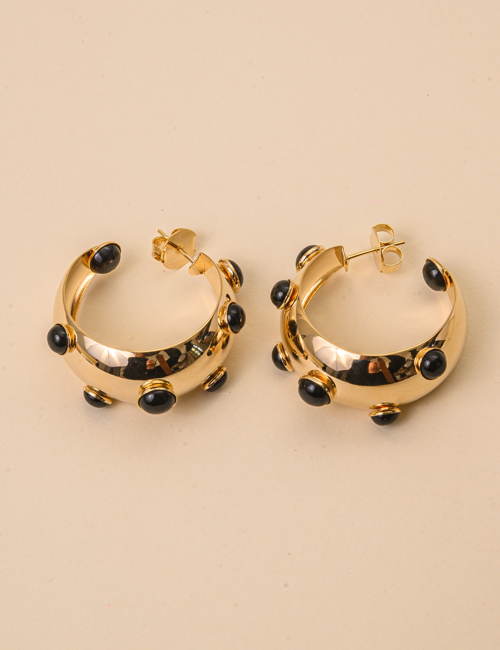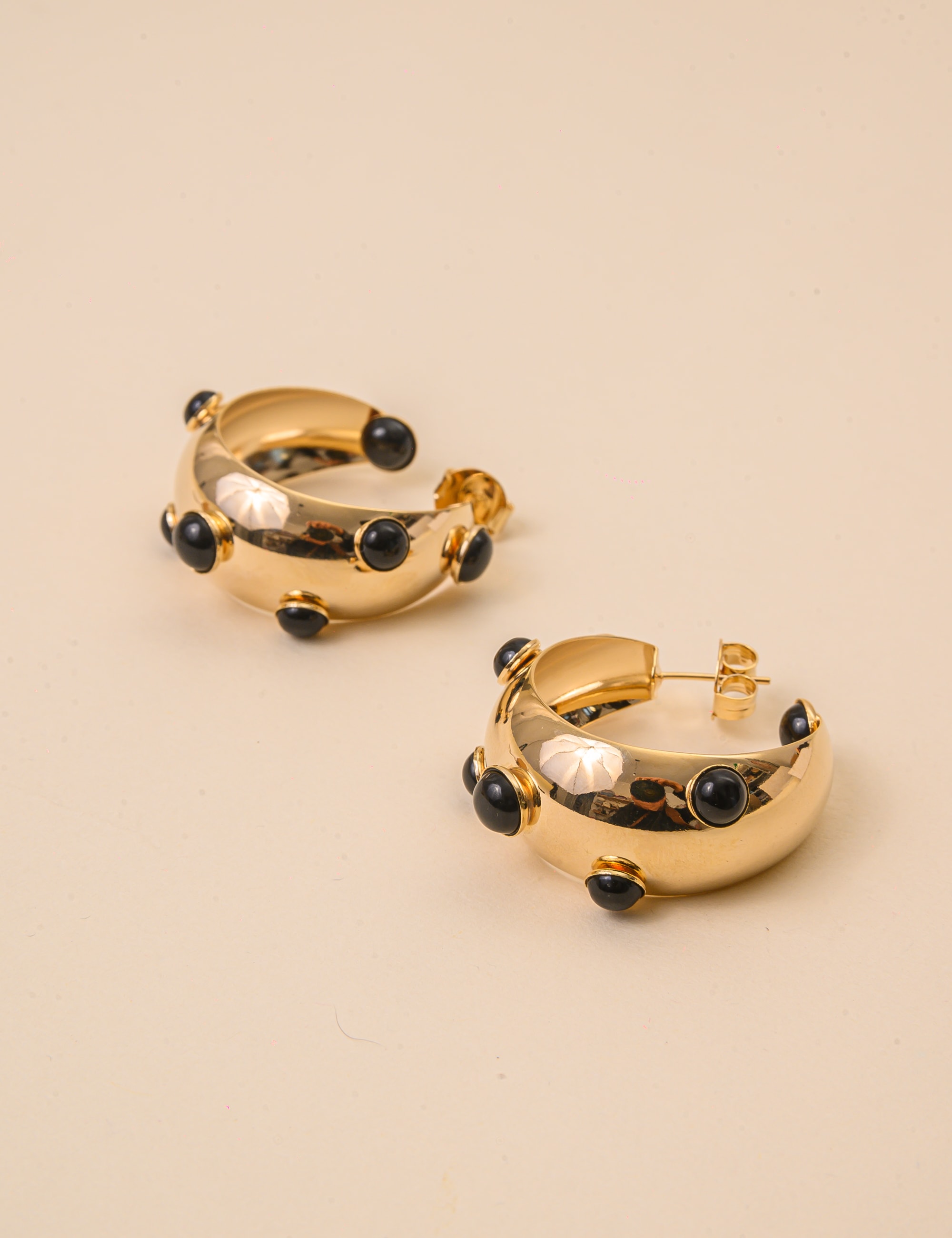 Brinco de argola banhado a ouro com delicadas esferas pretas. Um modelo clássico e elegante, ideal para iluminar o visual e complementar qualquer produção com sofisticação.
