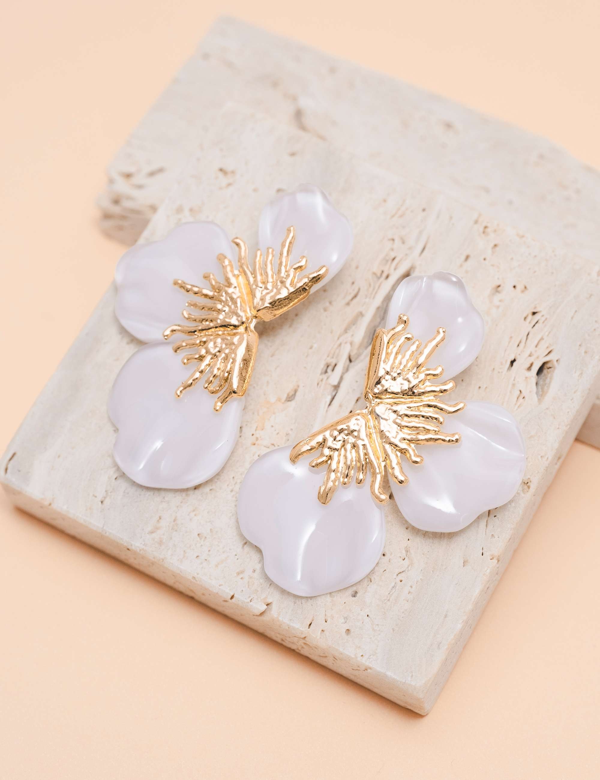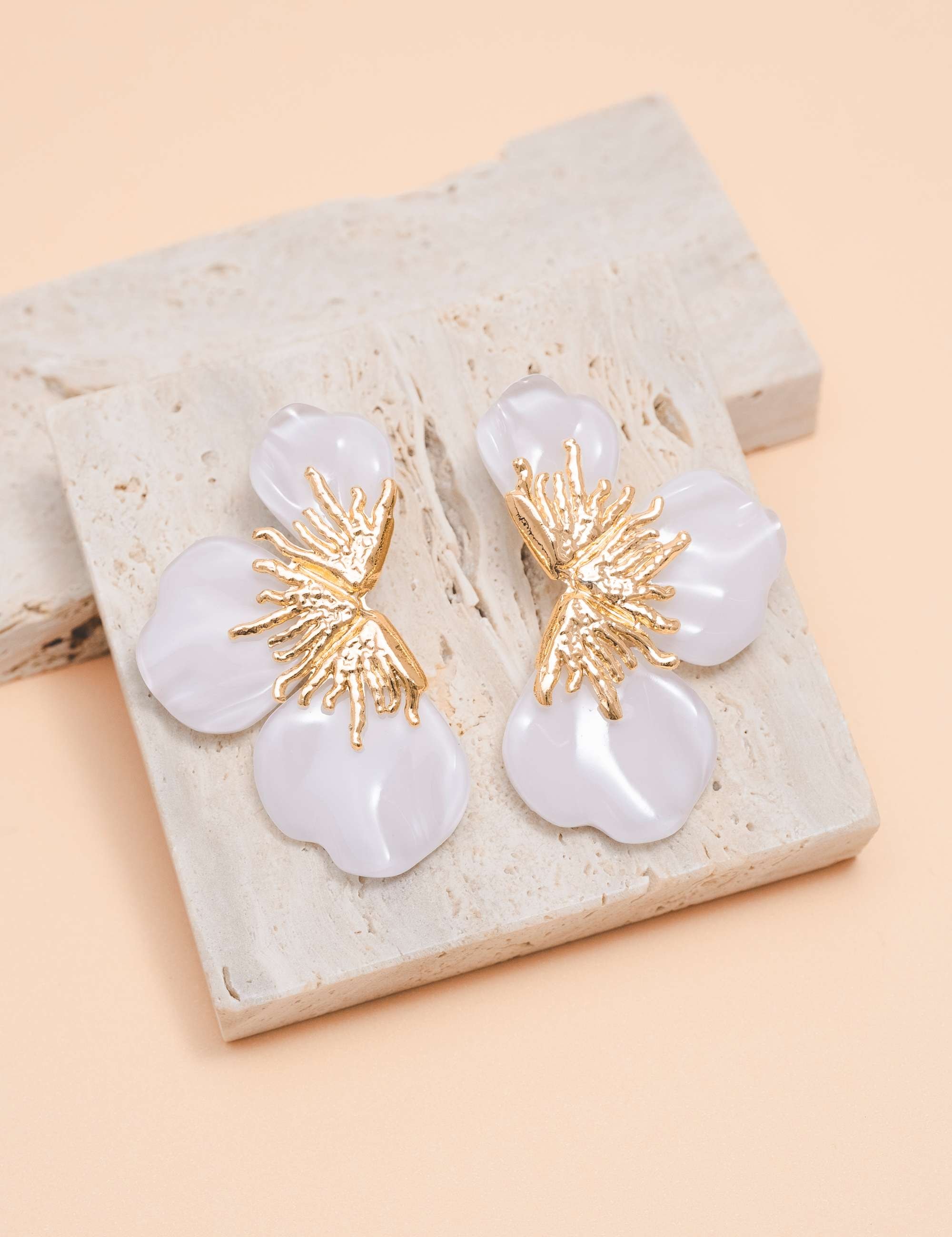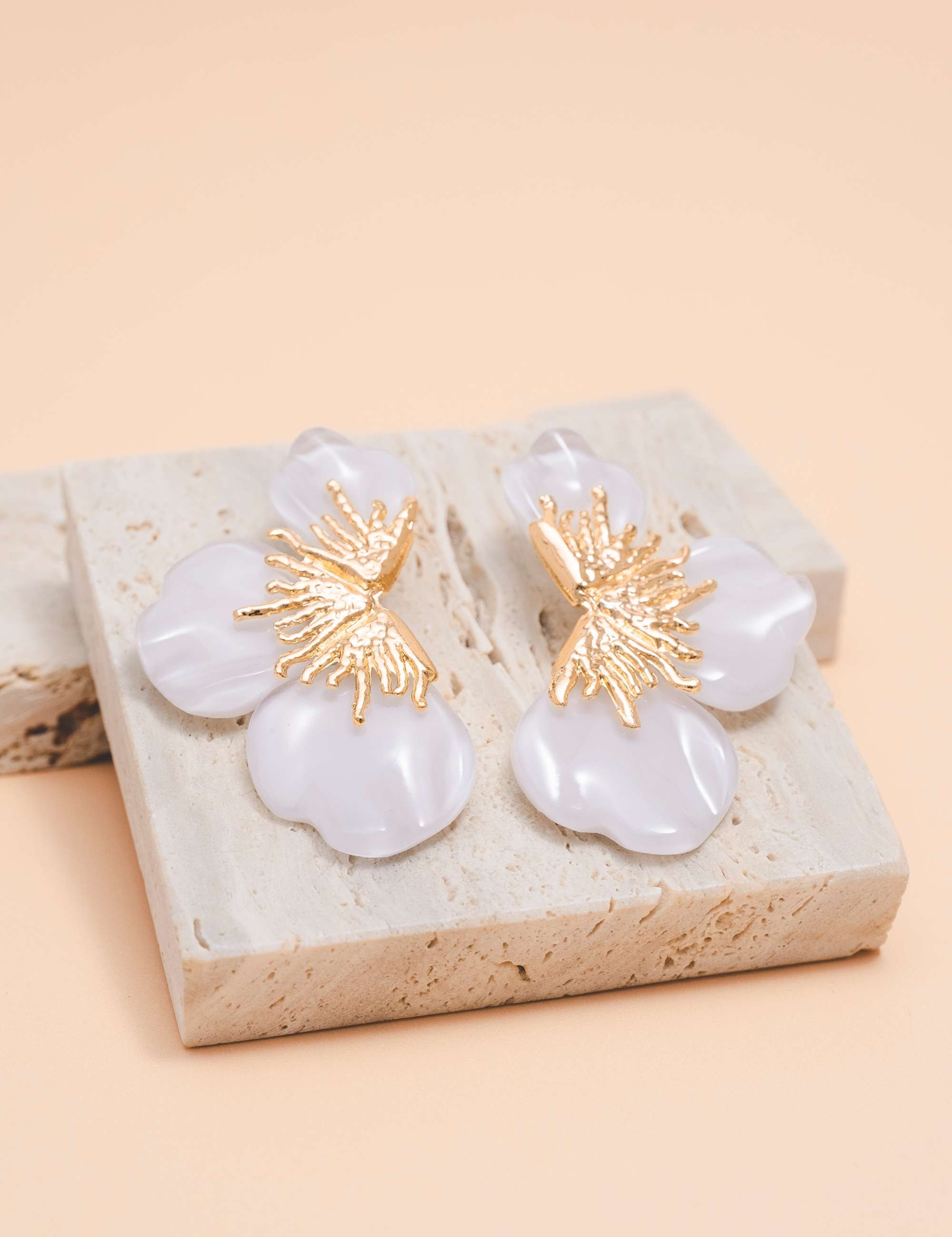 Brinco médio com base banhado no ouro, pastilha com formato de pétalas, miolo semelhante ao raio solar. Peça, latao, resina acrílica, banhado no ouro, verniz e antialérgico. Brinco que traz o ar romântico e fluido para deixar o look ainda mais especial.