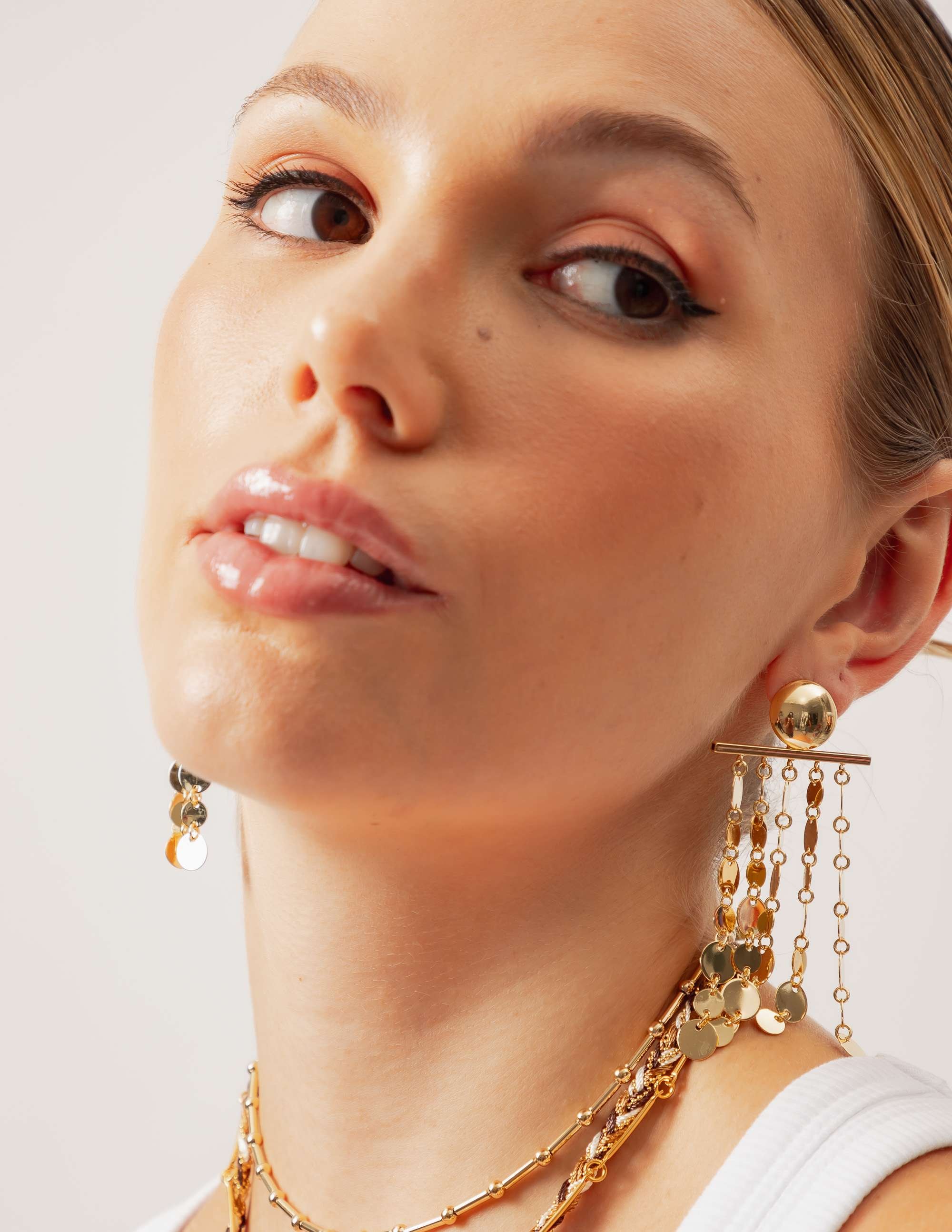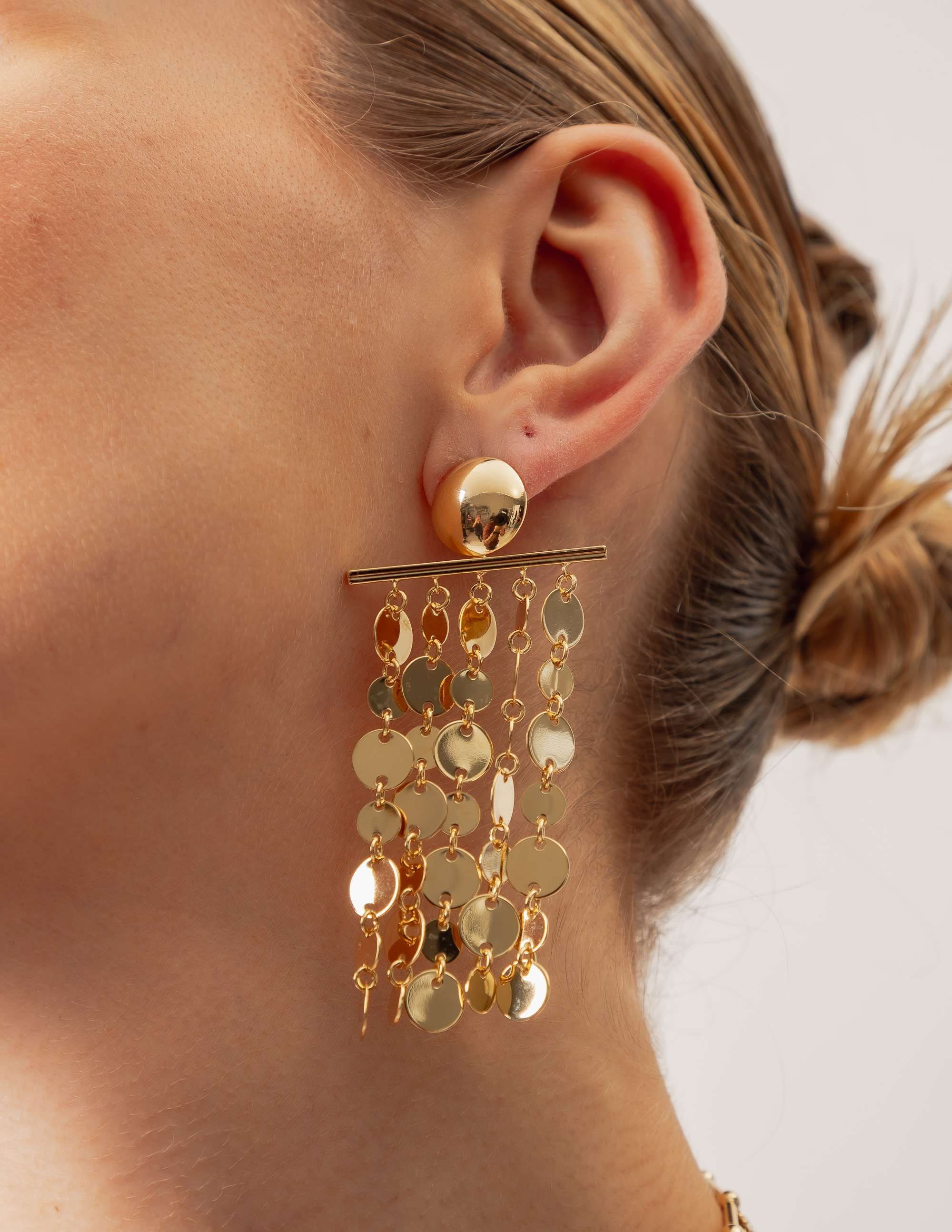 Peça: Brinco de latão e medalhas segmentadas. Acessórios boho cada vez mais vem ganhando espaço nos looks clássicos e fashionistas.