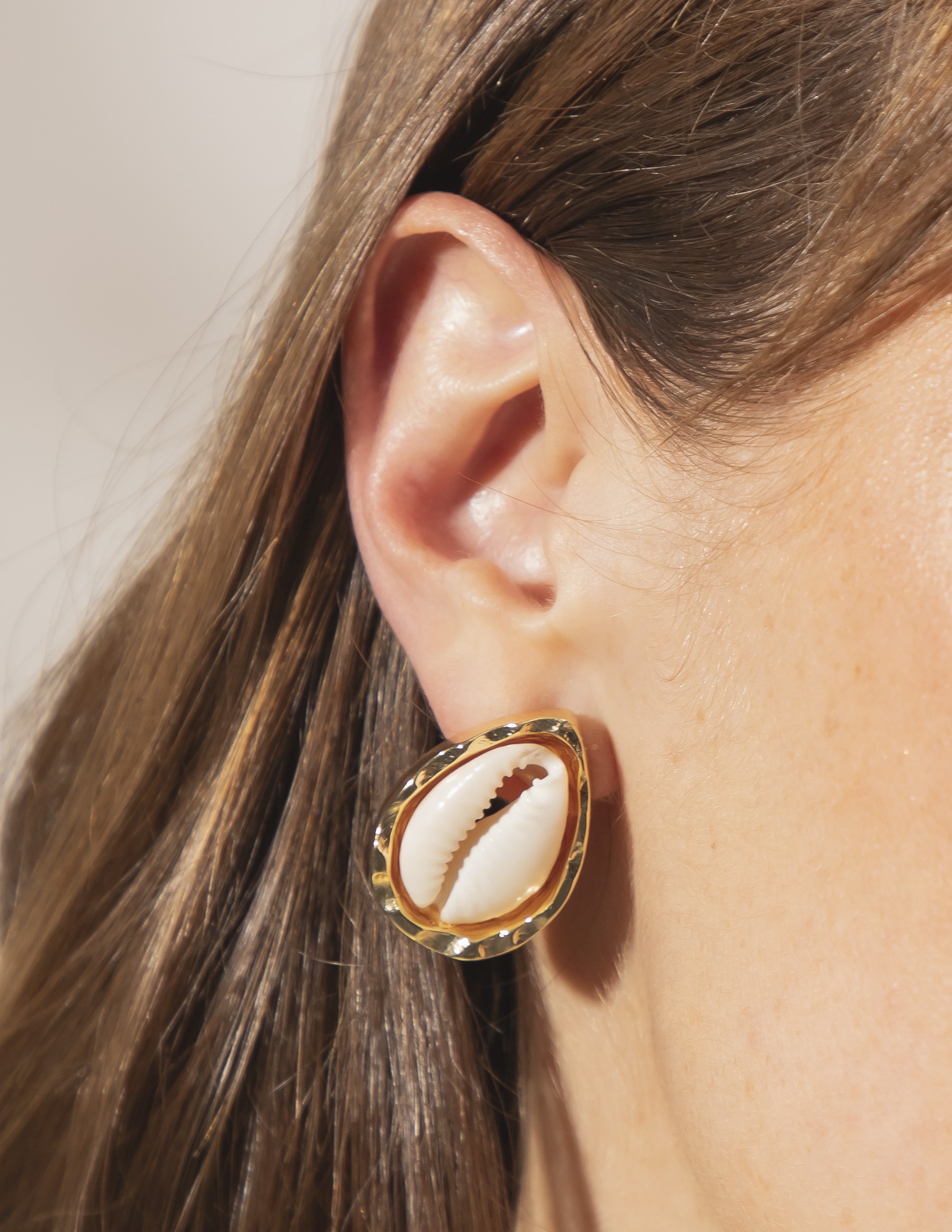 Peça: Brinco banhado a ouro, em formato de buzio resinado. Perfeito para adicionar um toque de elegância e feminilidade a qualquer visual. Proporcionando um charme delicado e sofisticado que complementa tanto trajes formais quanto casuais.