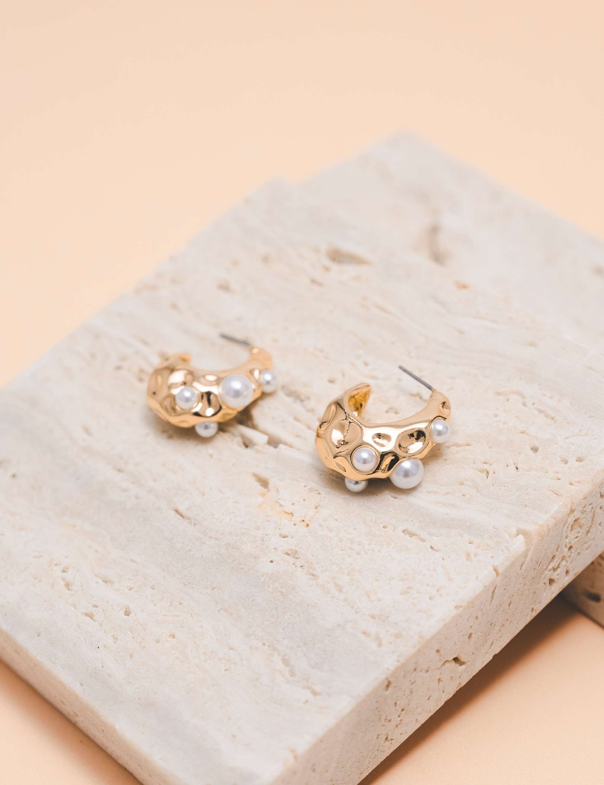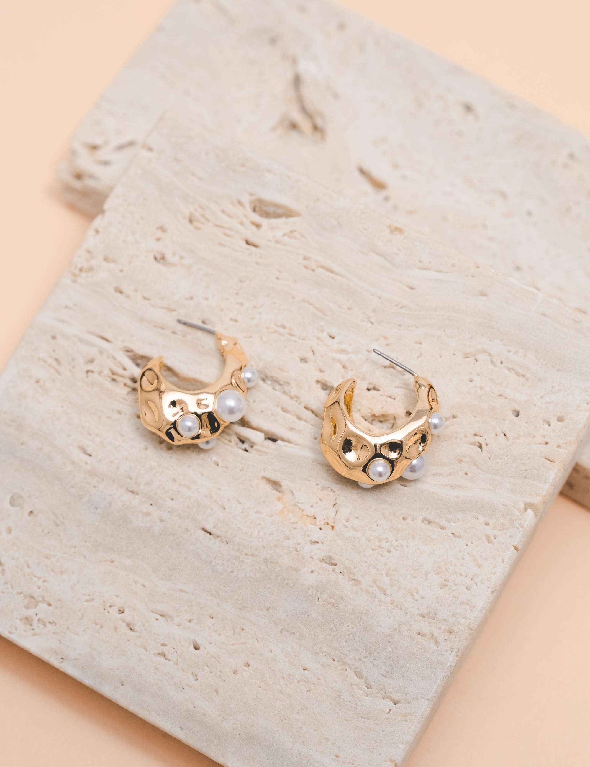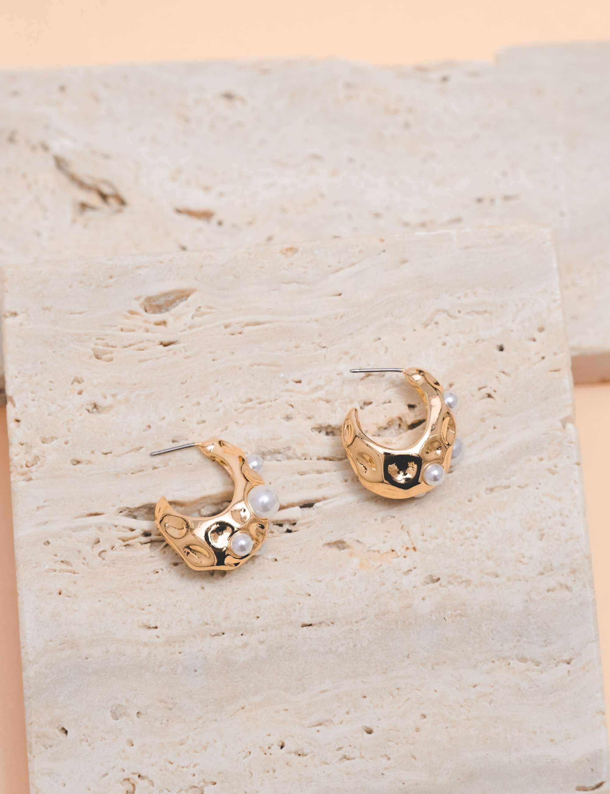 Peça: Brinco alta fusão, em formato de argola com detalhes de pérolas resinadas e martelado.