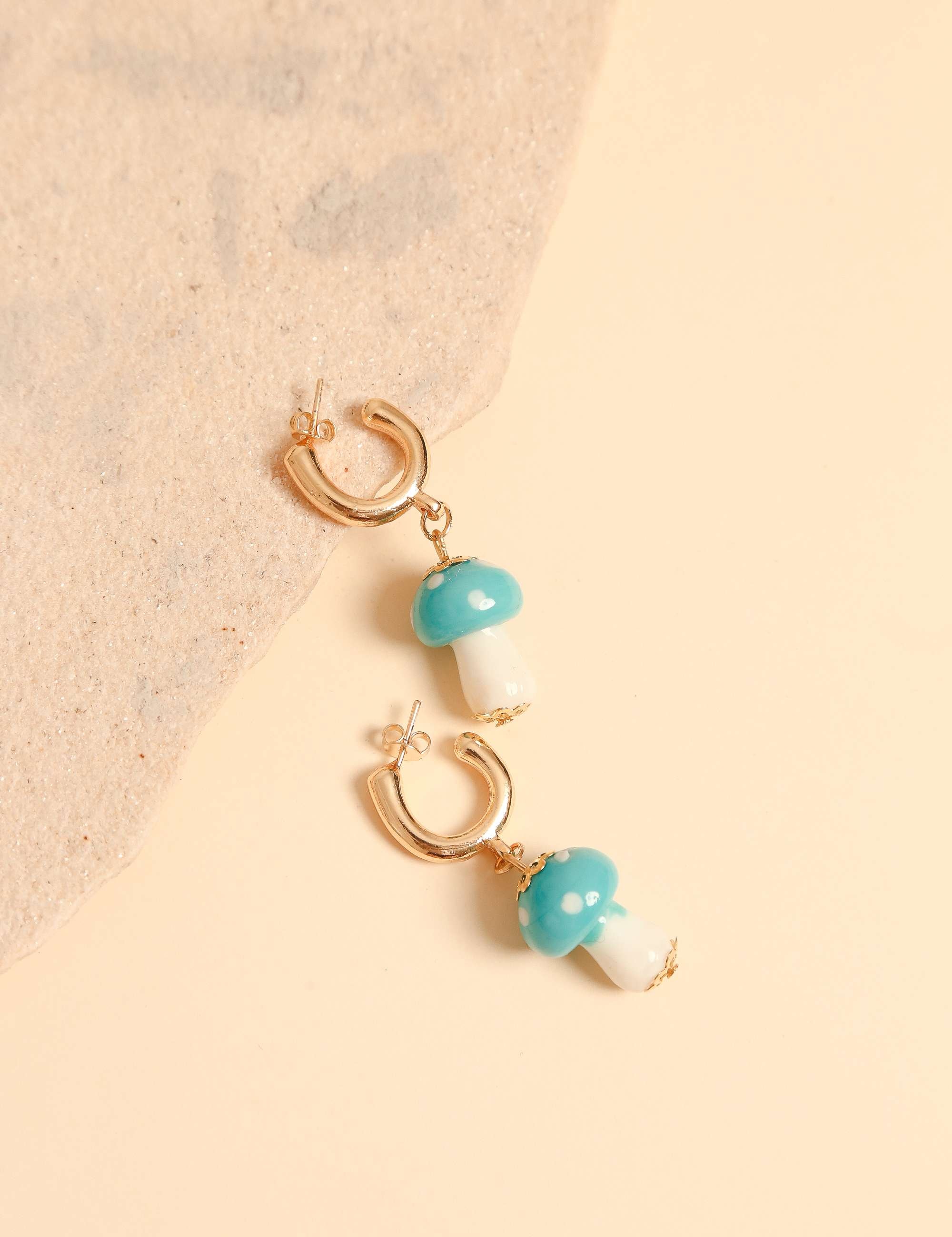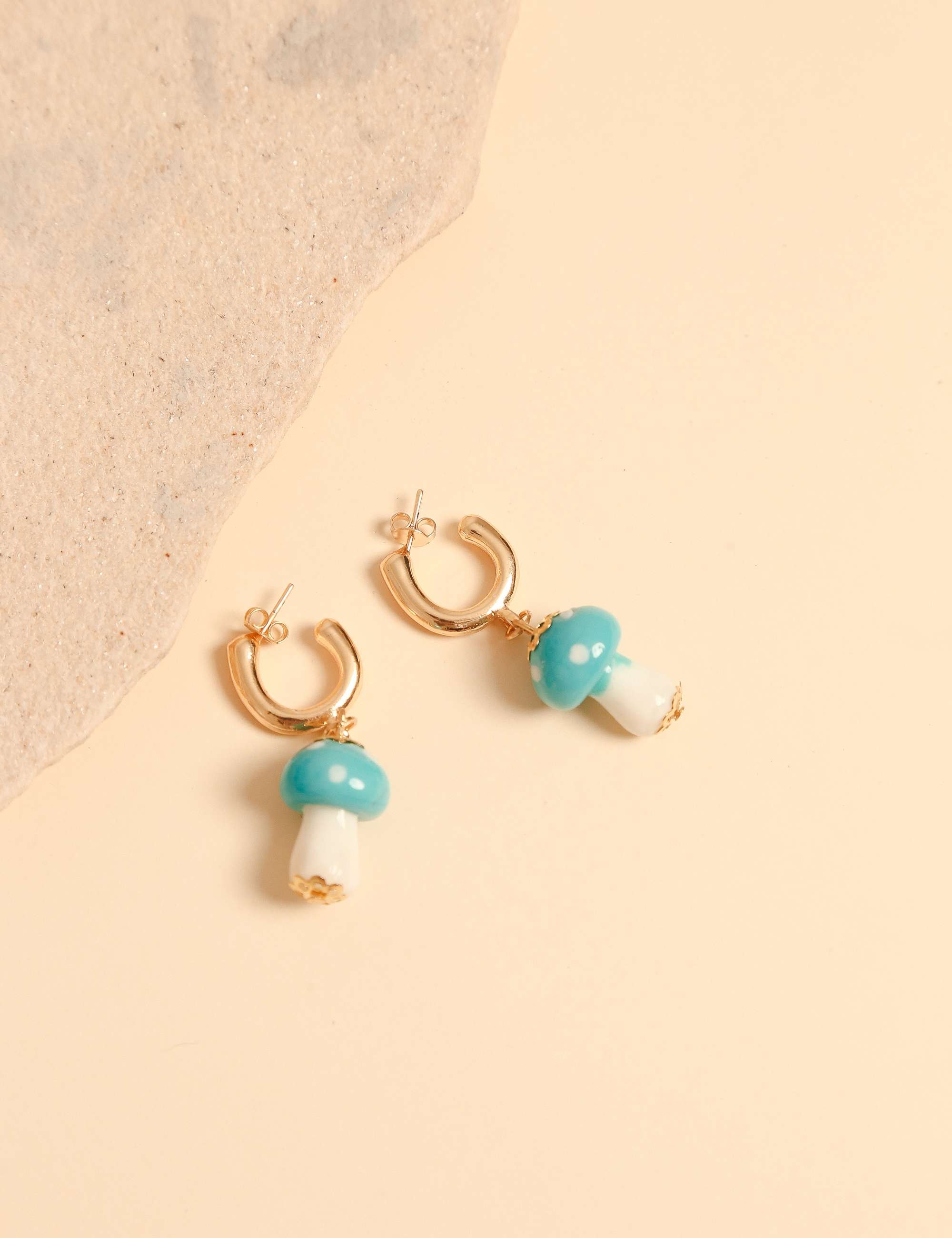 Brinco argola com pingente formato de cogumelo cor azul no material porcelana. Brinco cheio de alegria e estilo para deixar o seu look ainda mais alegre e divertido.