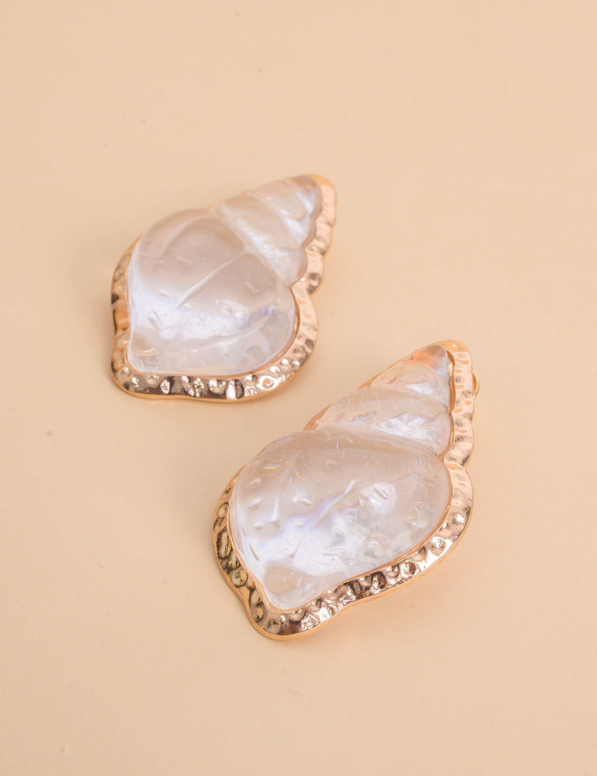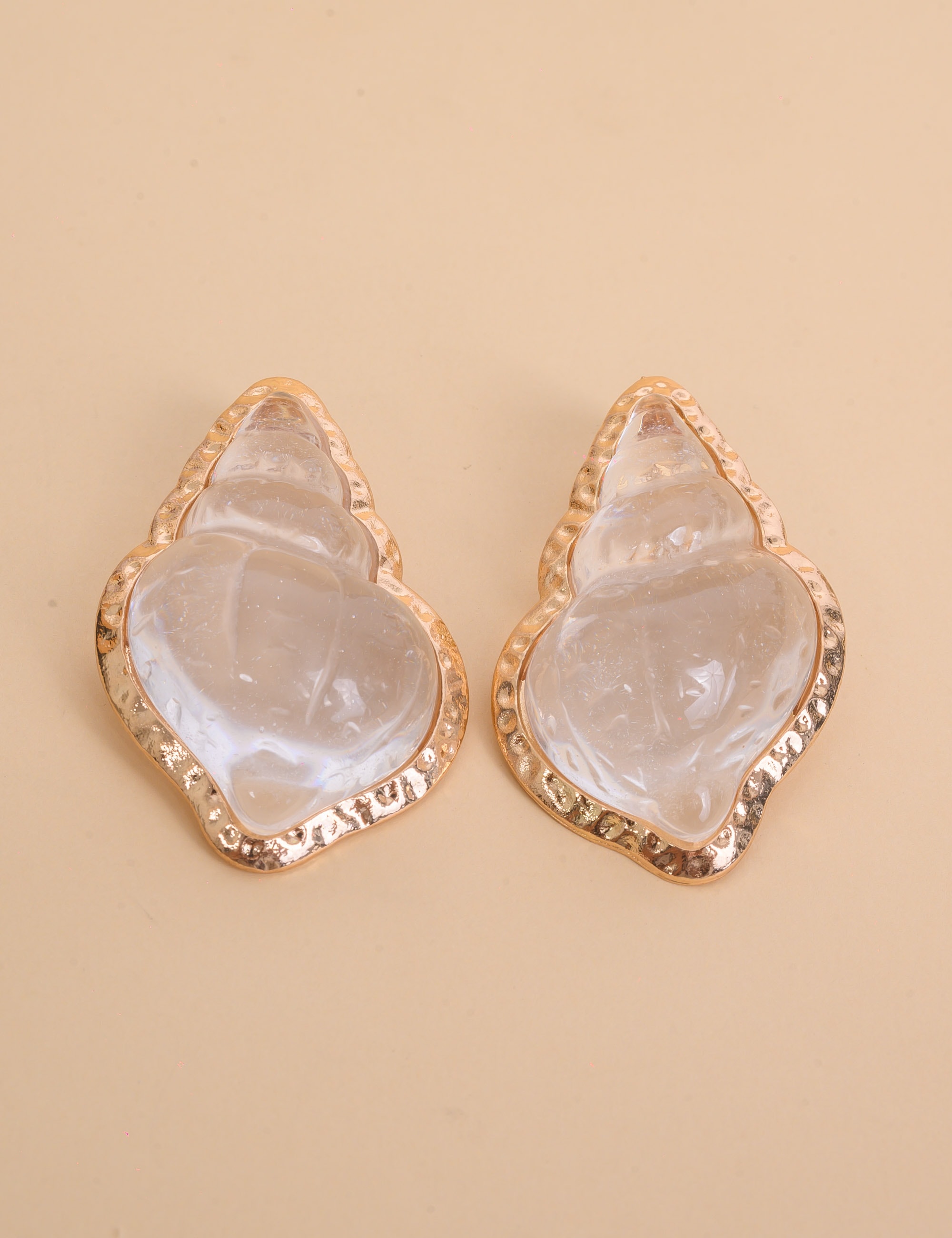 Brinco de ouro em formato de concha com resina na cor transparente, elegante e versátil, perfeito para adicionar charme e estilo ao visual.