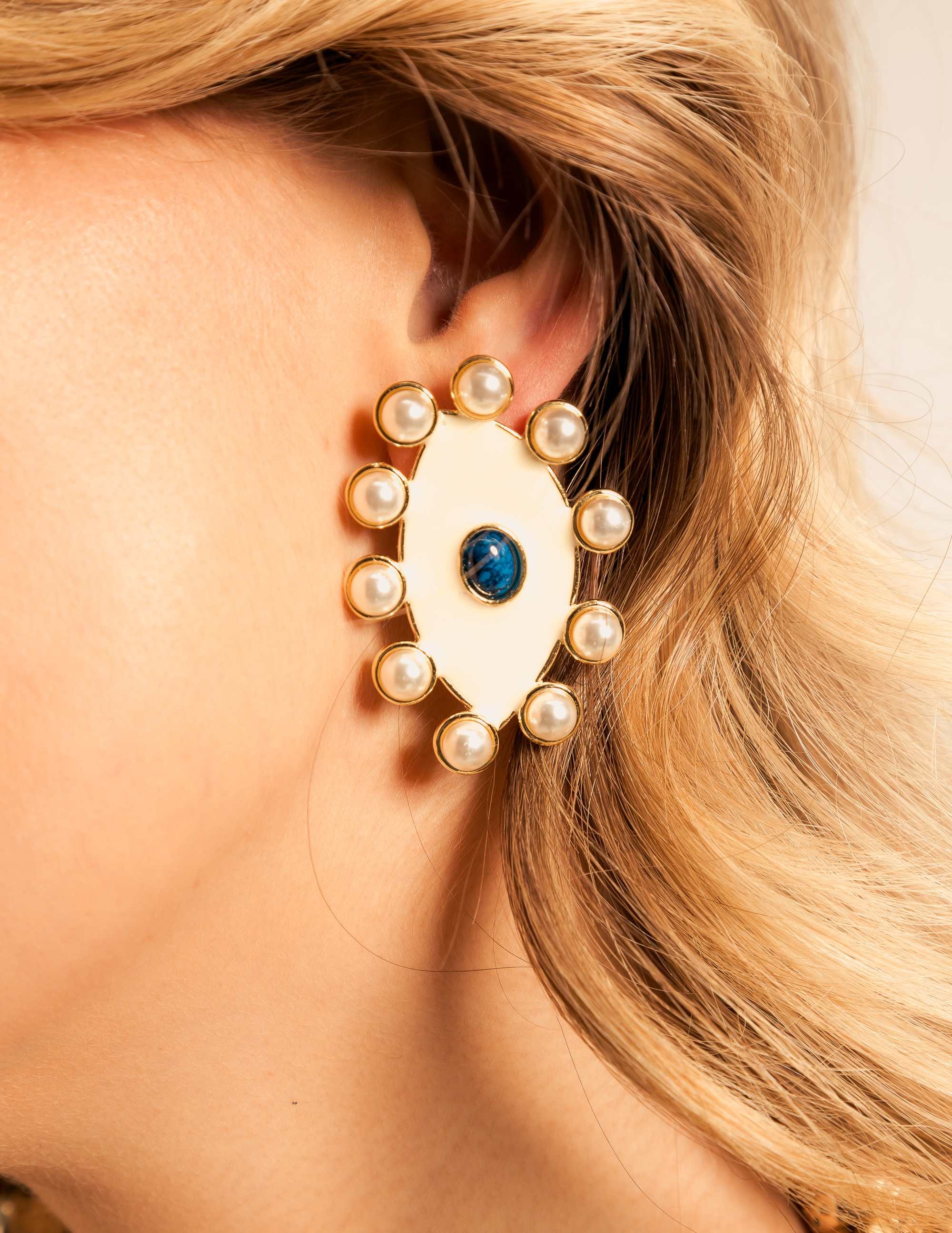 Peça: Brinco alta fusão, com esmaltação em resina italiana, pedra howlita e pérola resinada. Formato em olho grego com detalhes de esferas na lateral.
