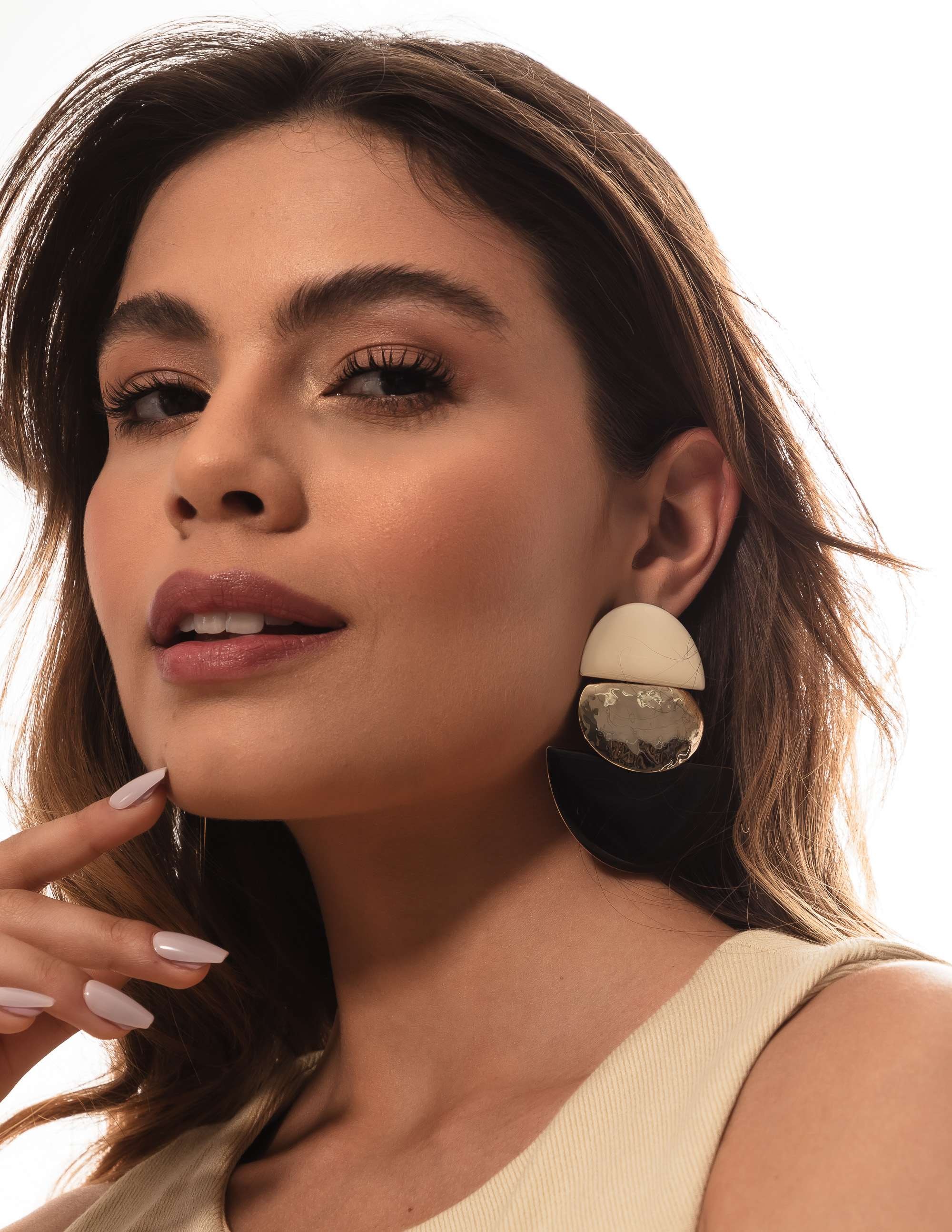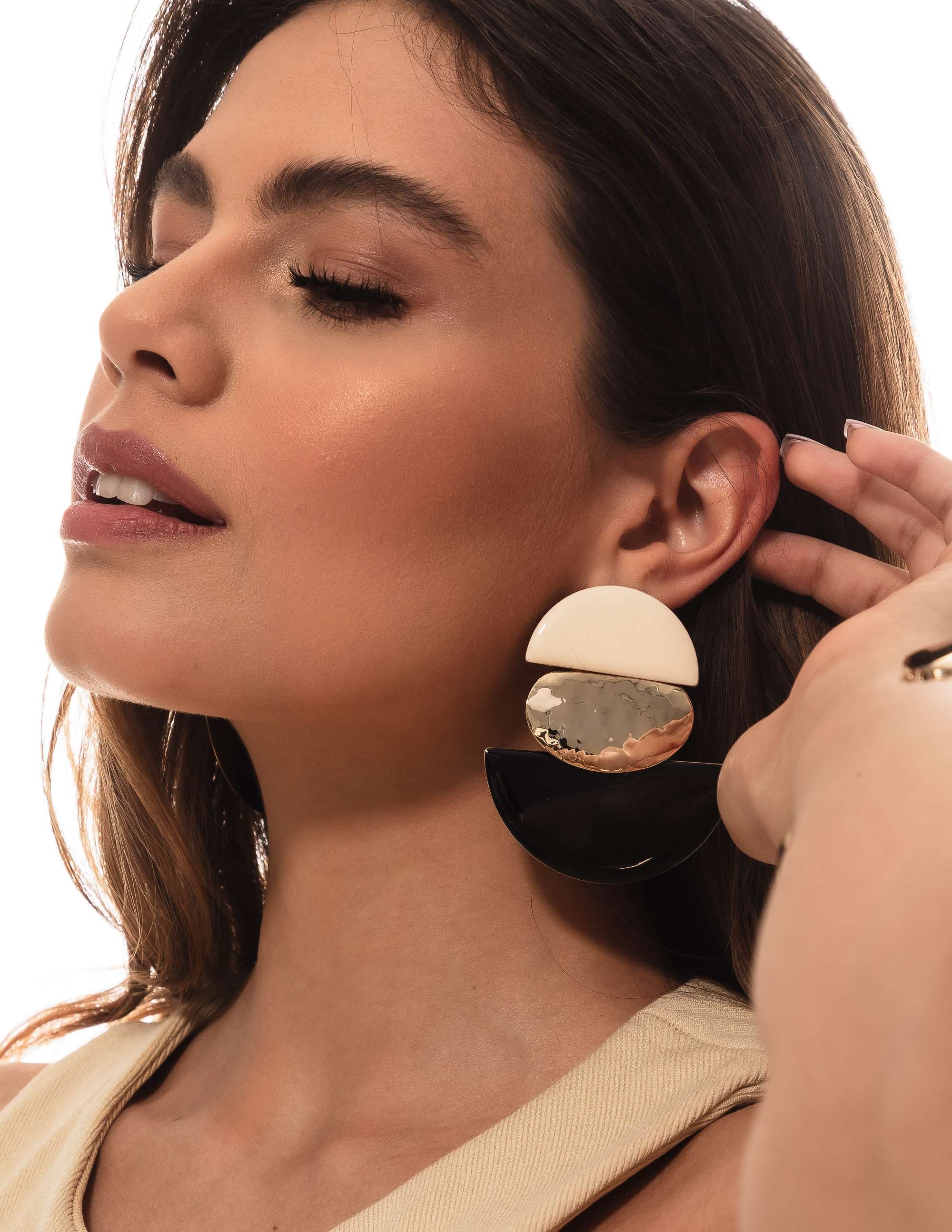 Brinco em formato orgânico com base na esmaltação white, meio ovalado no ouro martelado e pêndulo com esmaltação balck. Peça latão, banhado a ouro, esmaltação resina italiana feito a mão o processo. Peças orgânicas tem ganhado cada vez mais espaço no gosto das mulheres, traduzimos os acessórios para trazer cada vez estilo e versatilidade na hora de compor o look e trazer esse conceito fashion.