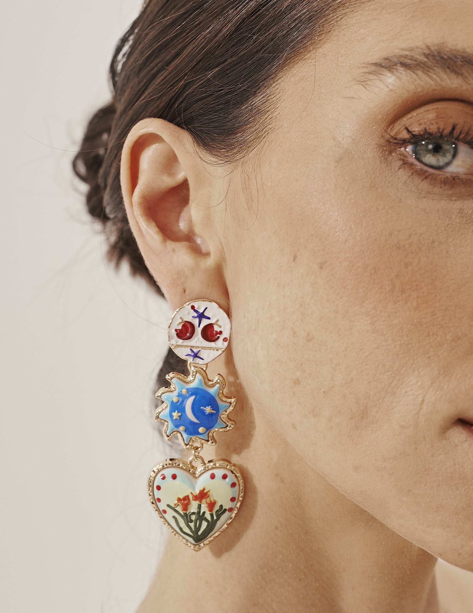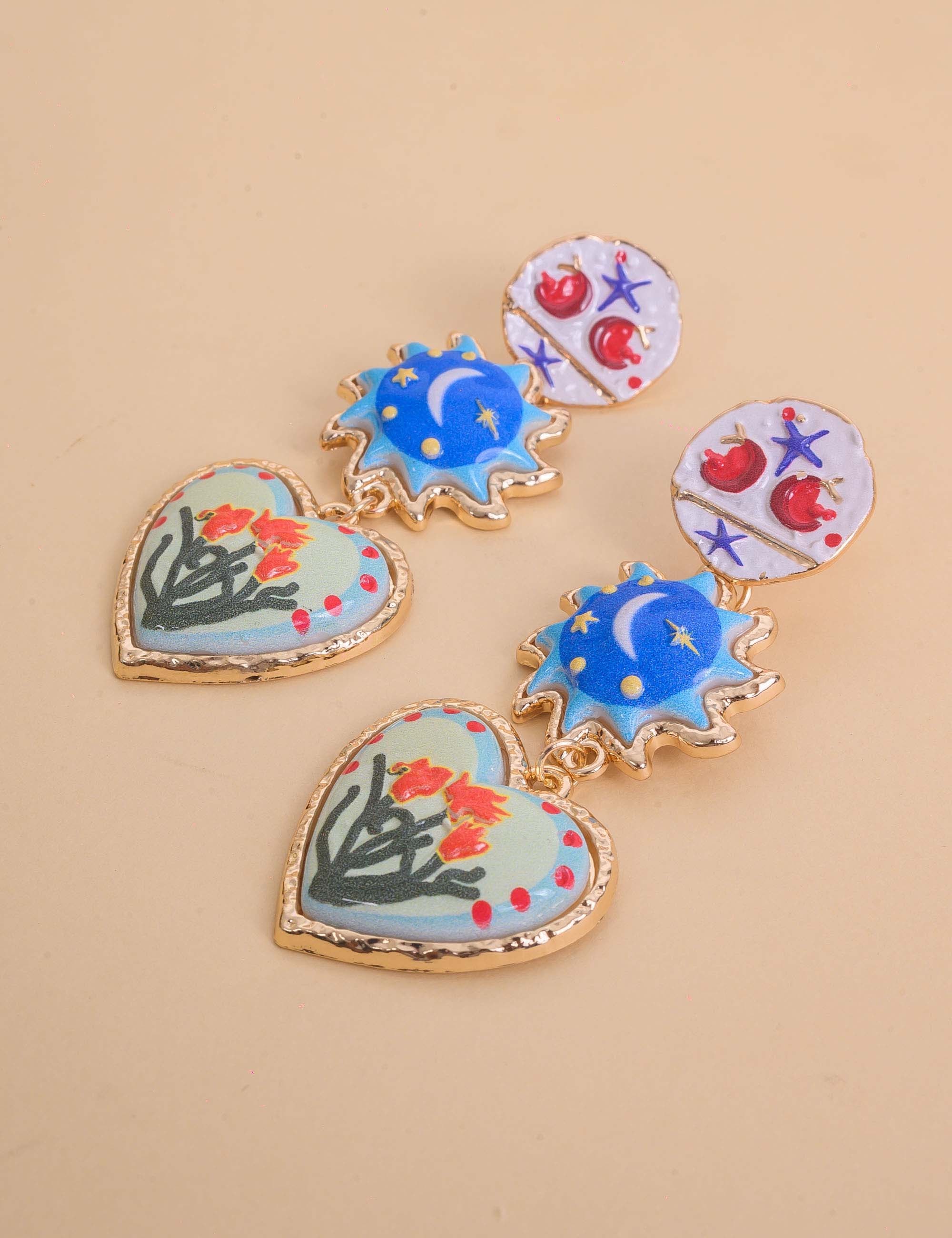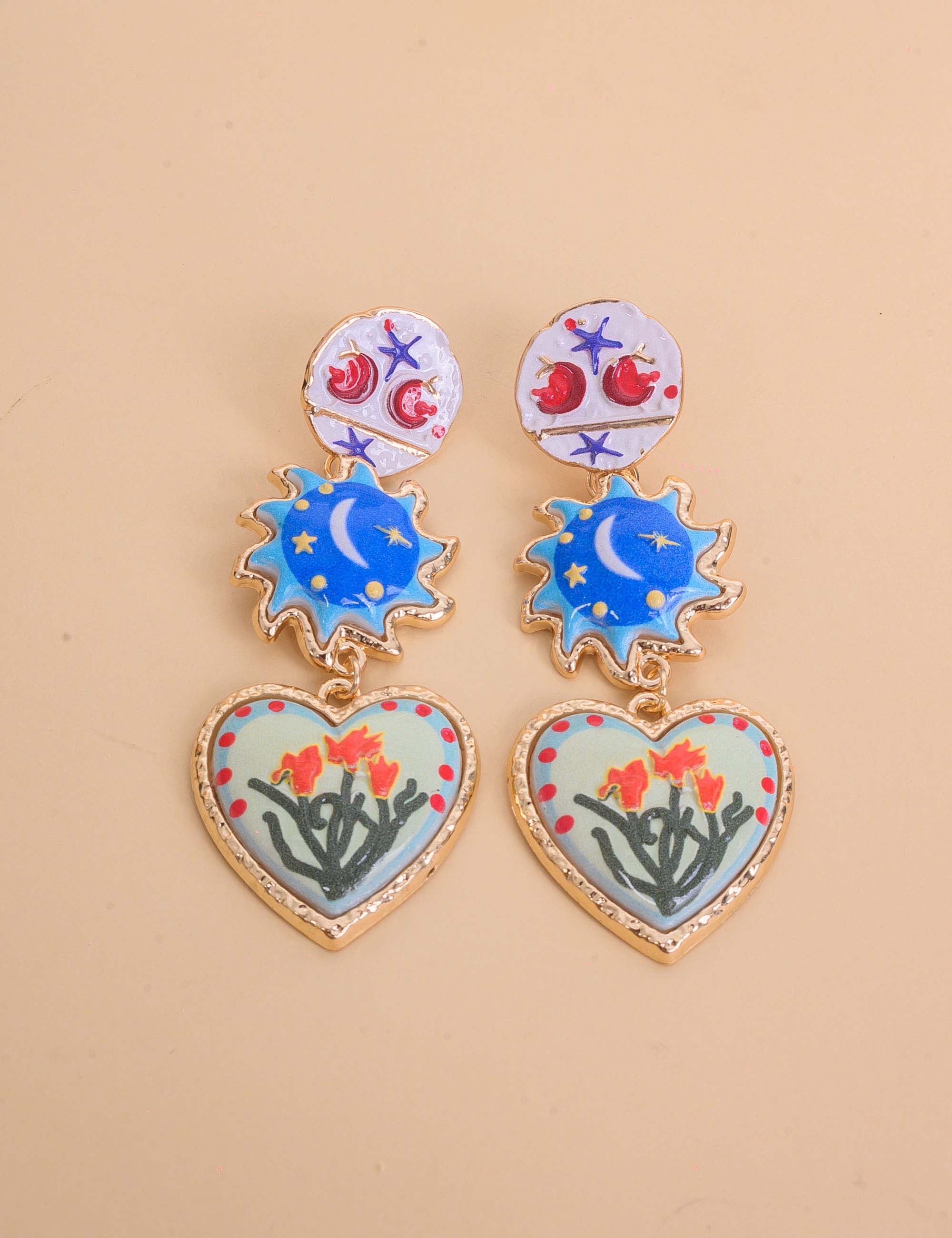 Brinco com base redonda e detalhes desenhados, pêndulos em formato de sol e coração com detalhes de estrela, lua e flores. Moderno e cheio de charme para realçar qualquer look.