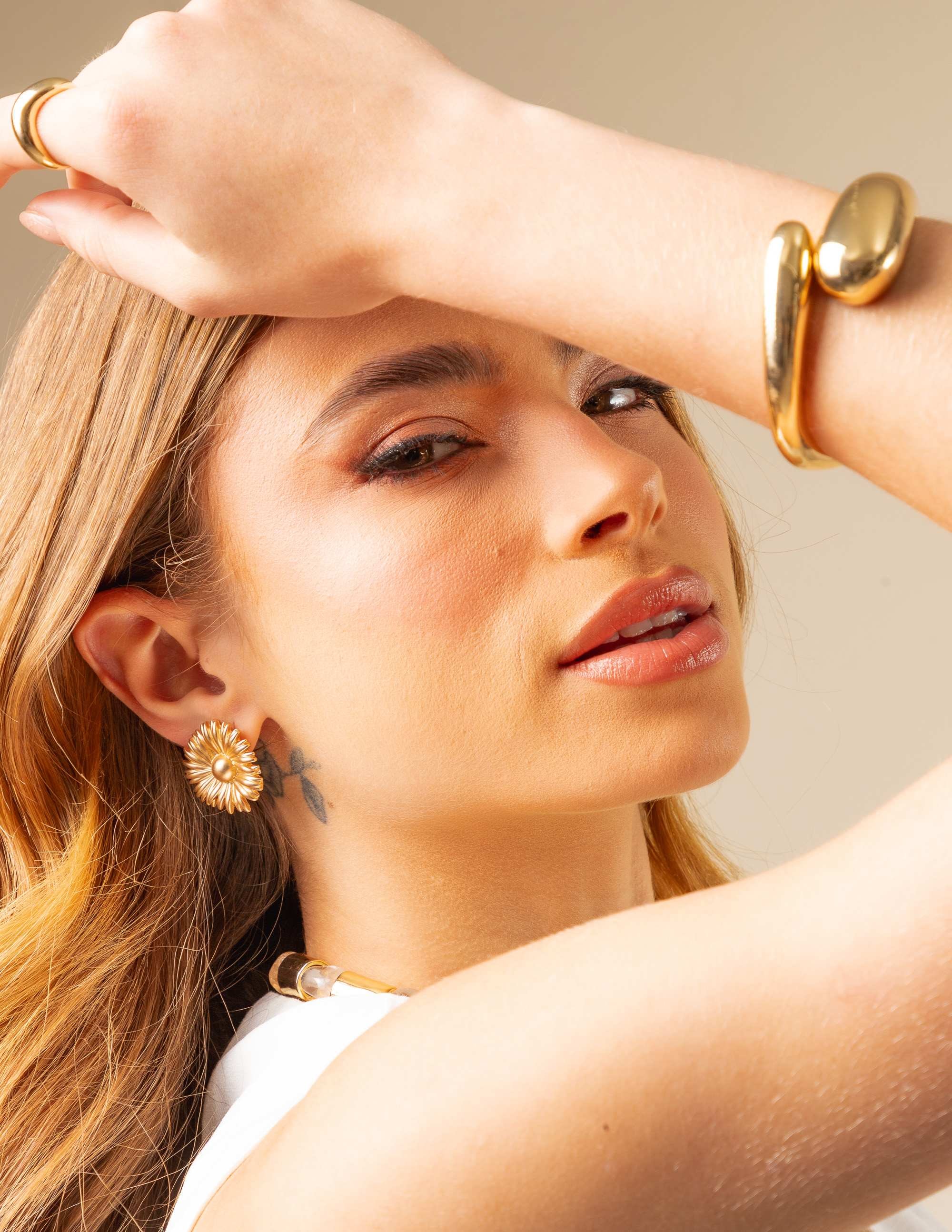 Todos os nossos metais são banhados a ouro, possuem camada protetiva para bijuterias finas e também possuem camada de metal precioso em sua composição. As bijuterias precisam de cuidados, limpe-as com flanela seca e macia, evite contato direto com cosméticos, areia, praia e piscina.