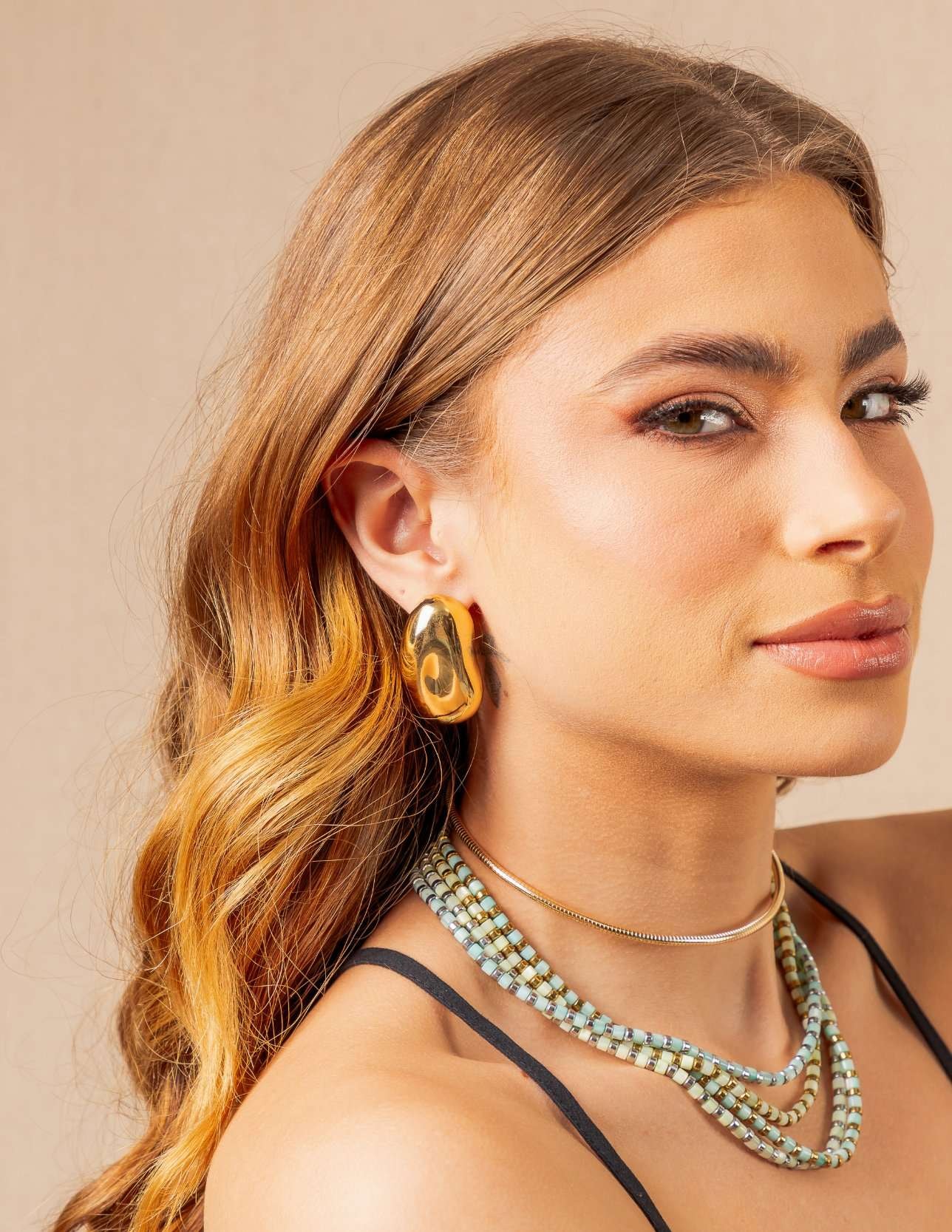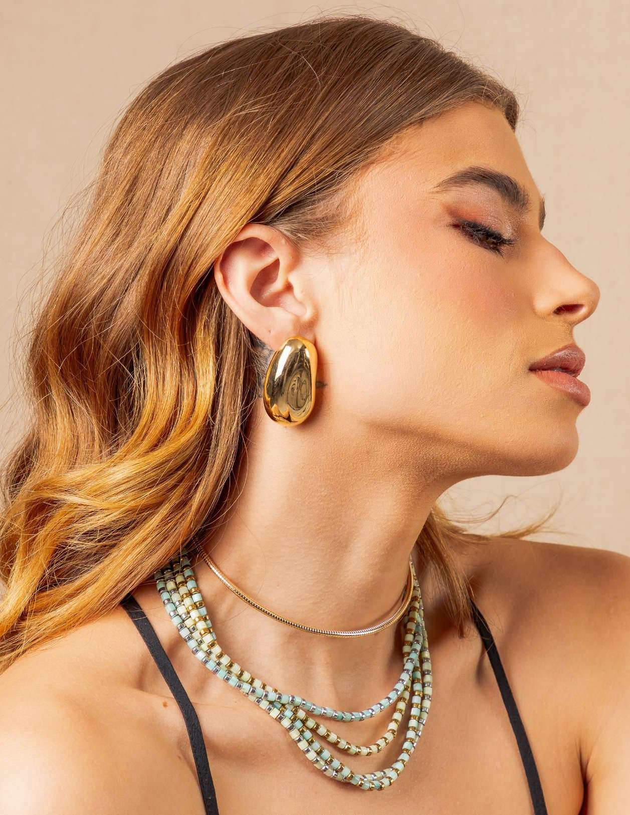 Todos os nossos metais são banhados a ouro, possuem camada protetiva para bijuterias finas e também possuem camada de metal precioso em sua composição. As bijuterias precisam de cuidados, limpe-as com flanela seca e macia, evite contato direto com cosméticos, areia, praia e piscina.