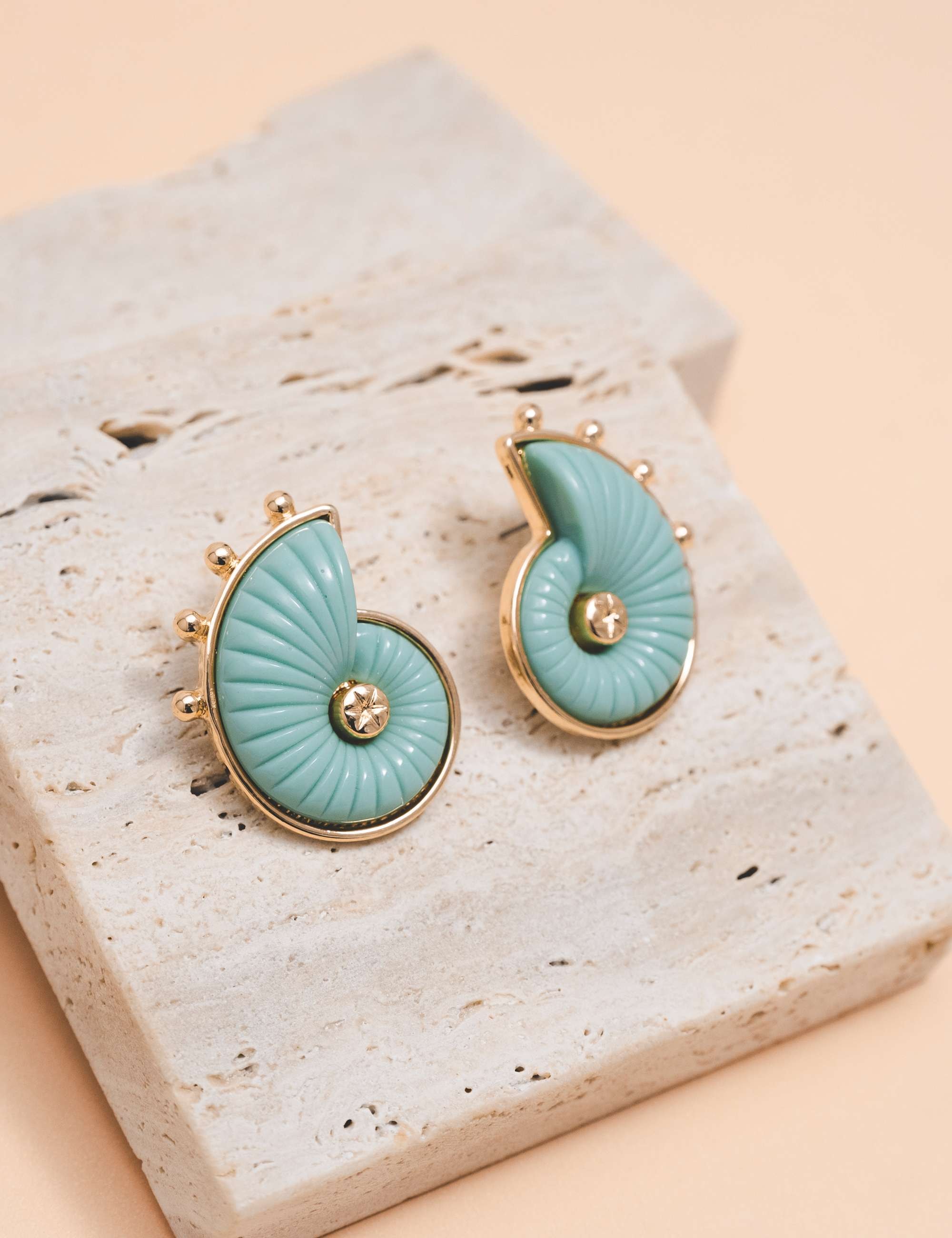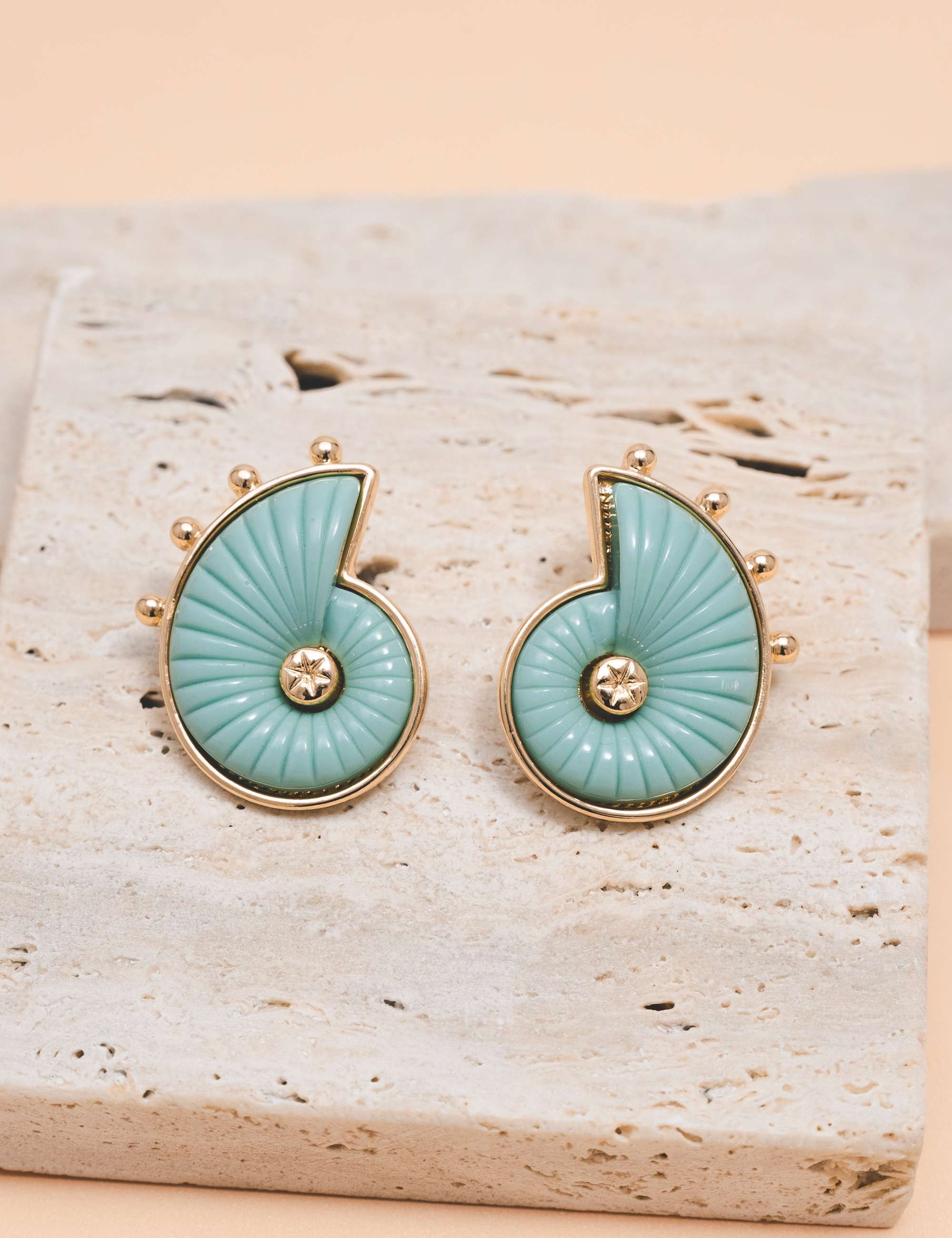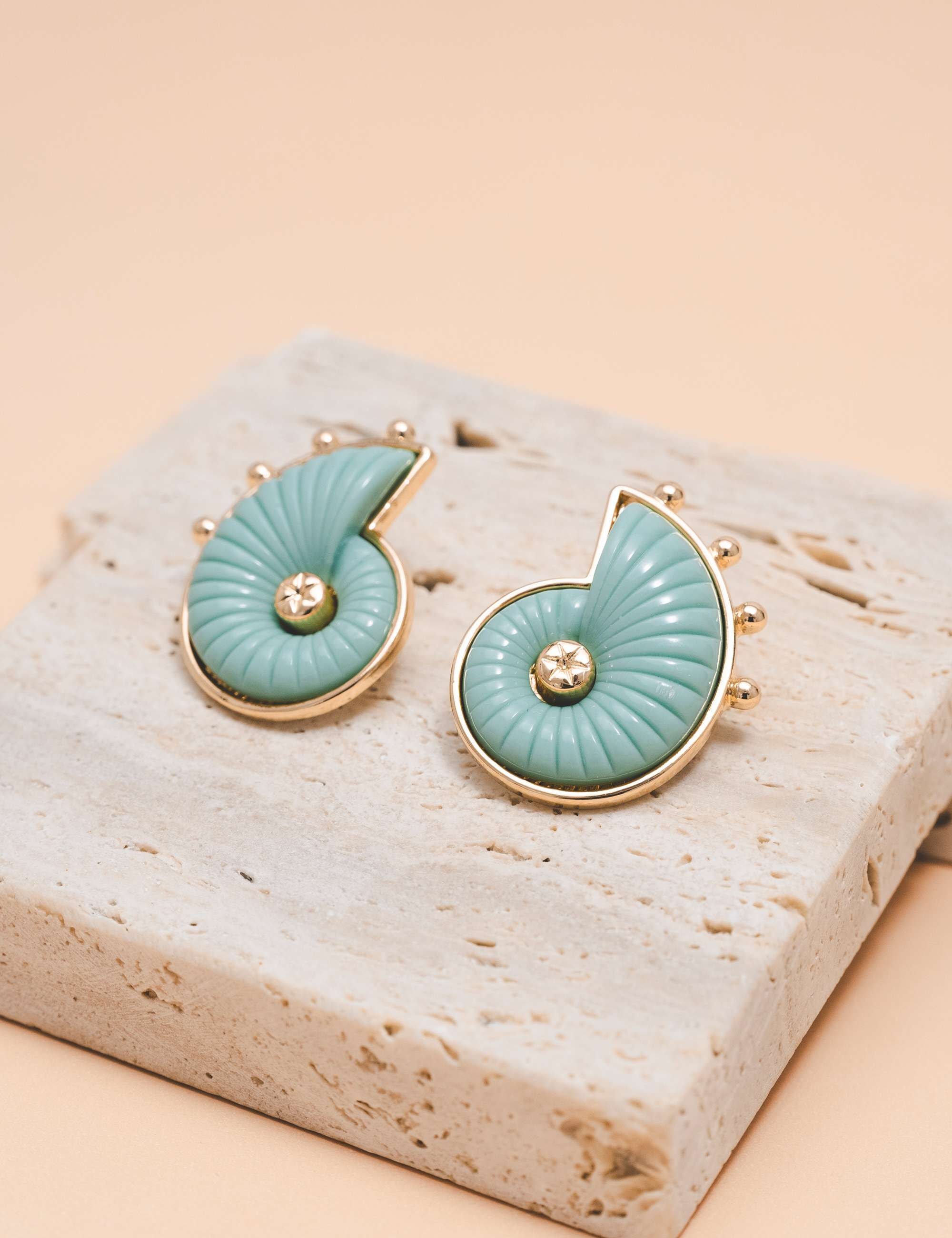 Peça: Brinco esmaltado em formato de caracol e detalhes de texturas no banho de ouro. Ideal para elevar o seu visual com um toque encantador e sofisticado.