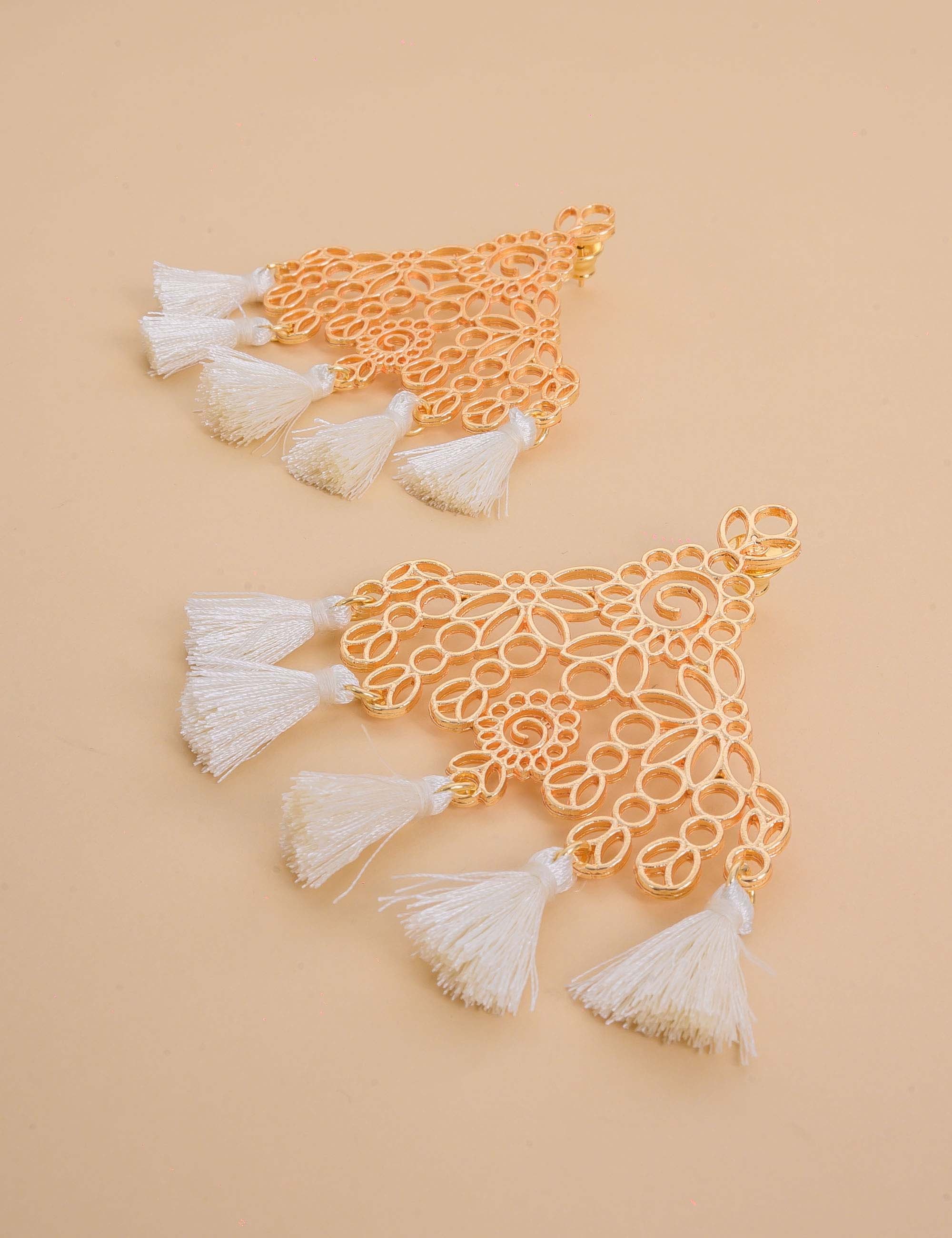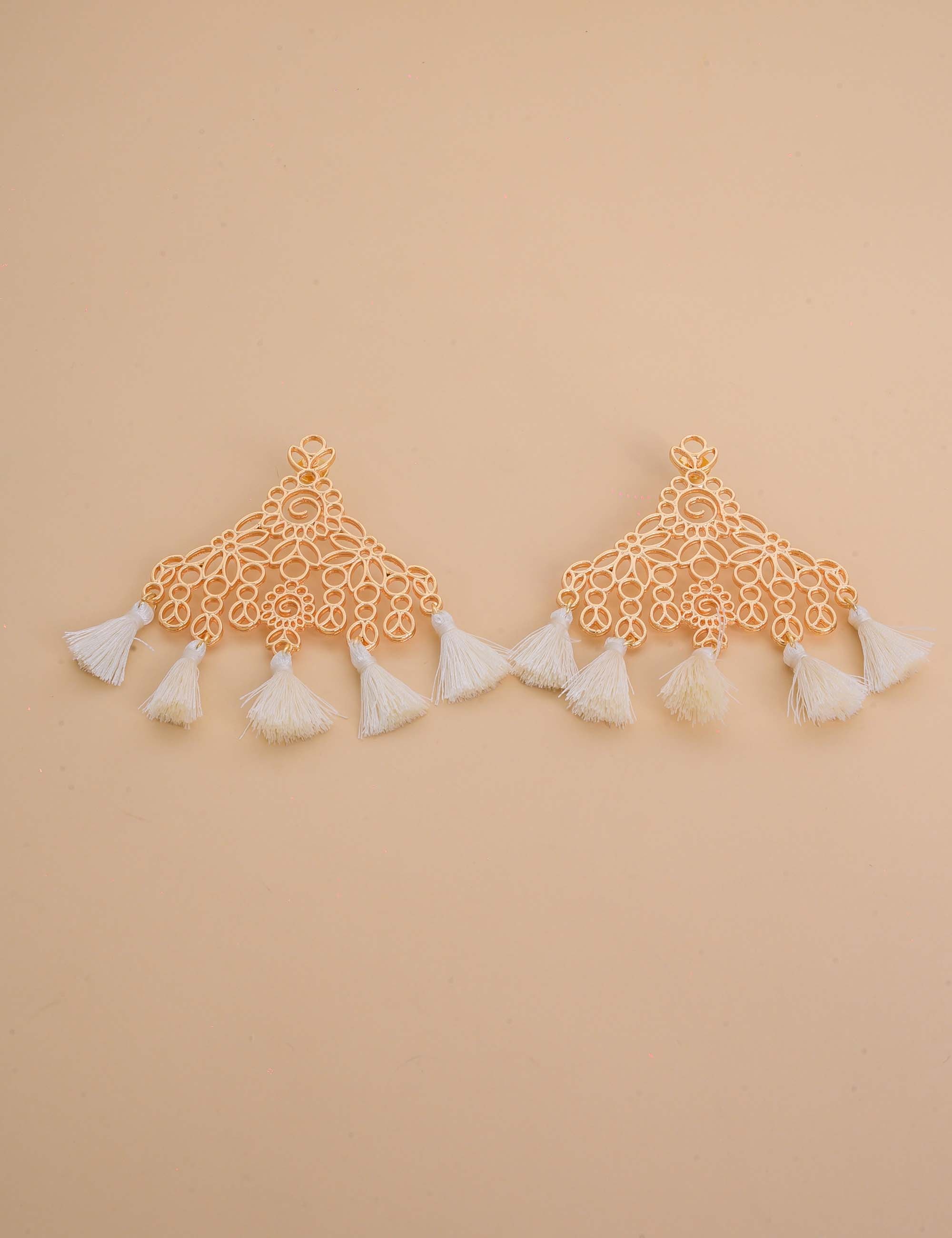 Brinco dourado com tassels brancos, trazendo um toque leve e cheio de charme. Peça perfeita para destacar qualquer look com um detalhe único e estiloso.