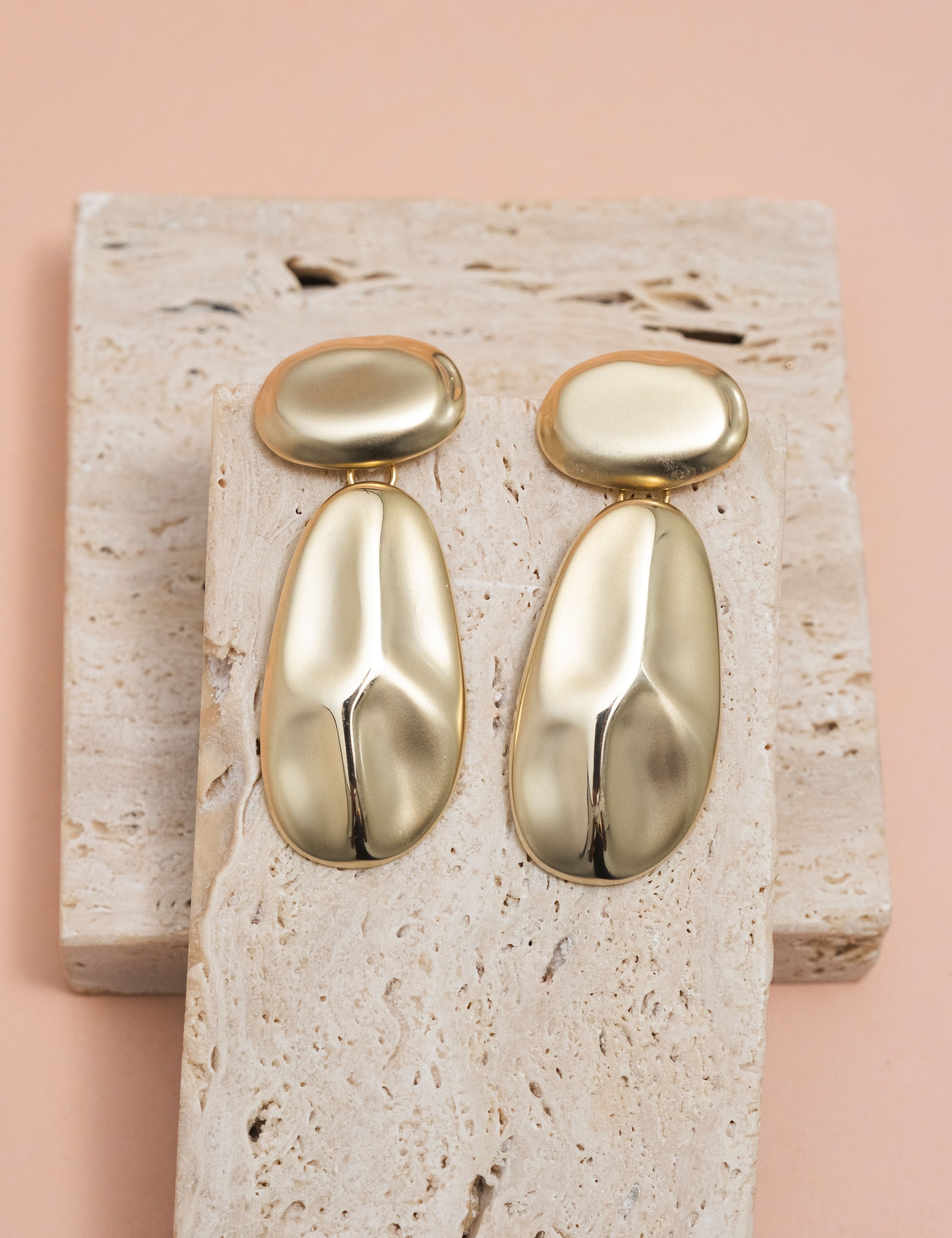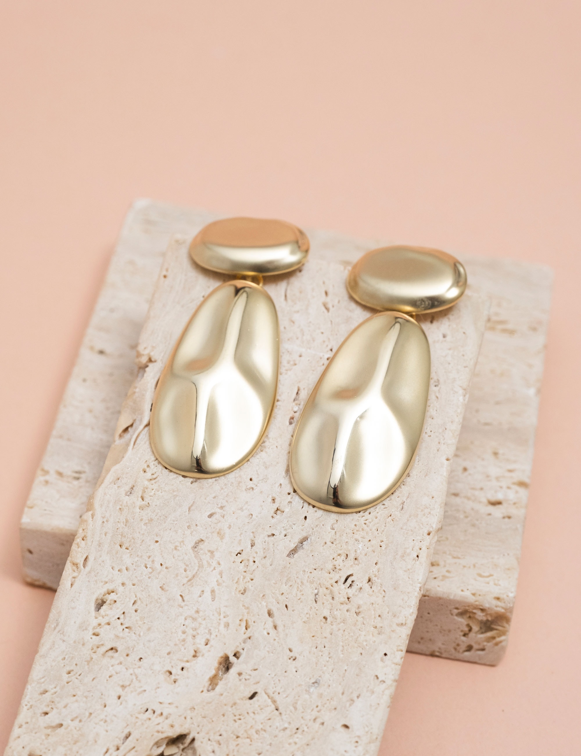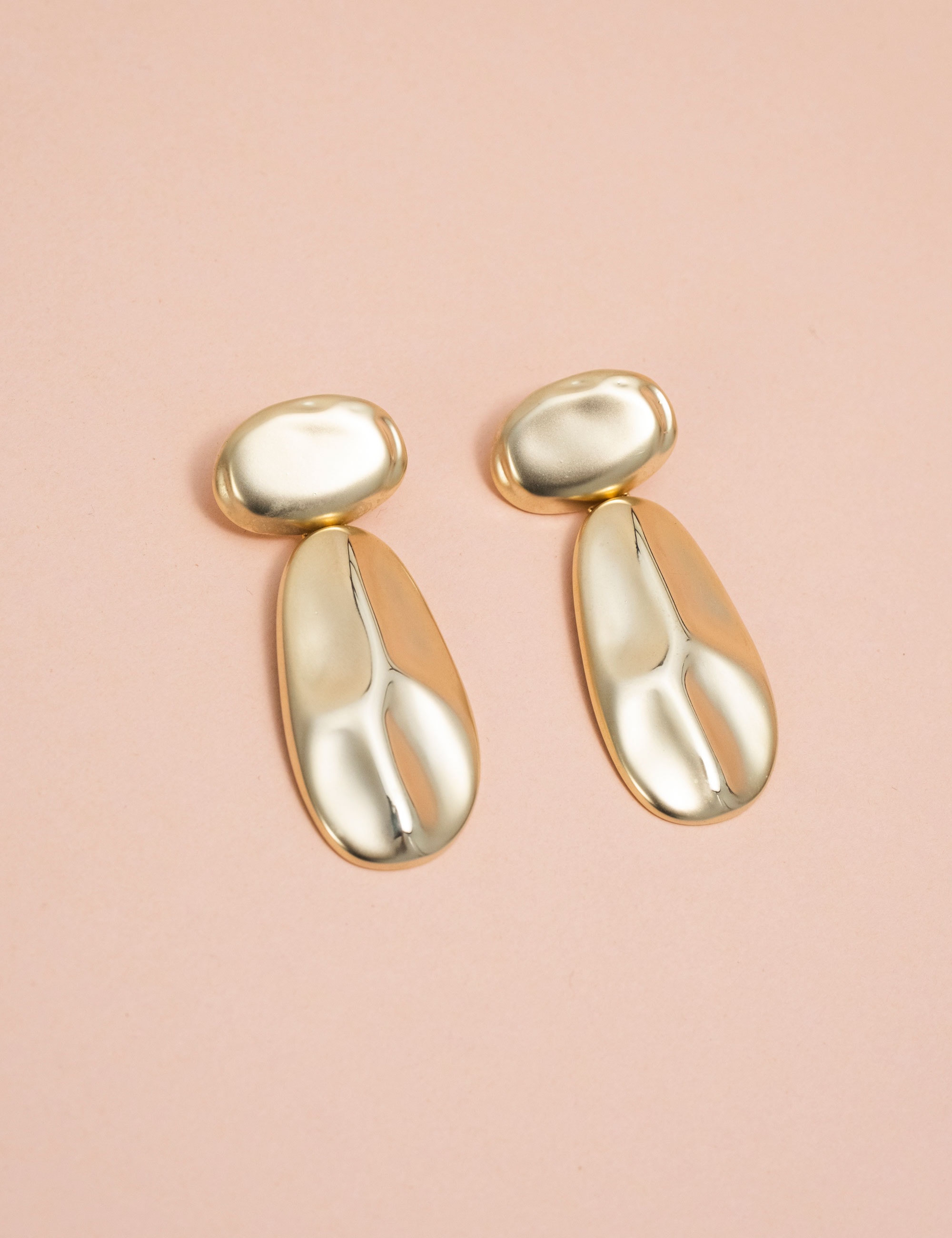 Peça: Brinco no banho ouro fosco com detalhes organico, oferecendo um toque moderno e sofisticado ao seu visual. Perfeito para destacar o colo com um brilho refrescante.