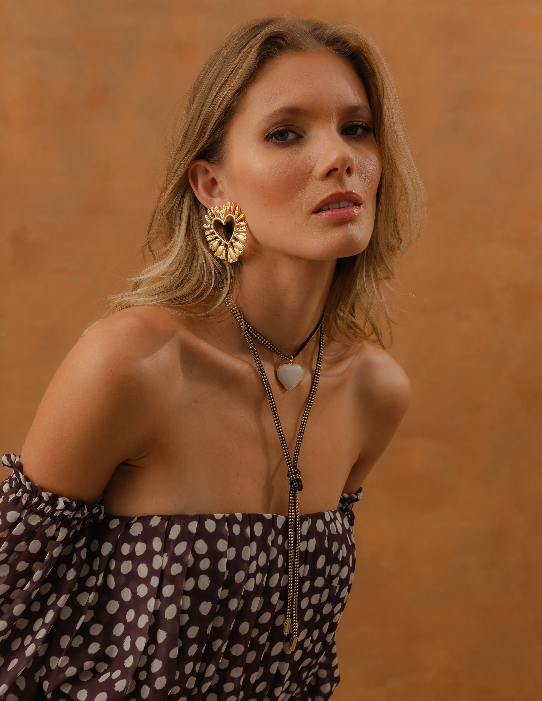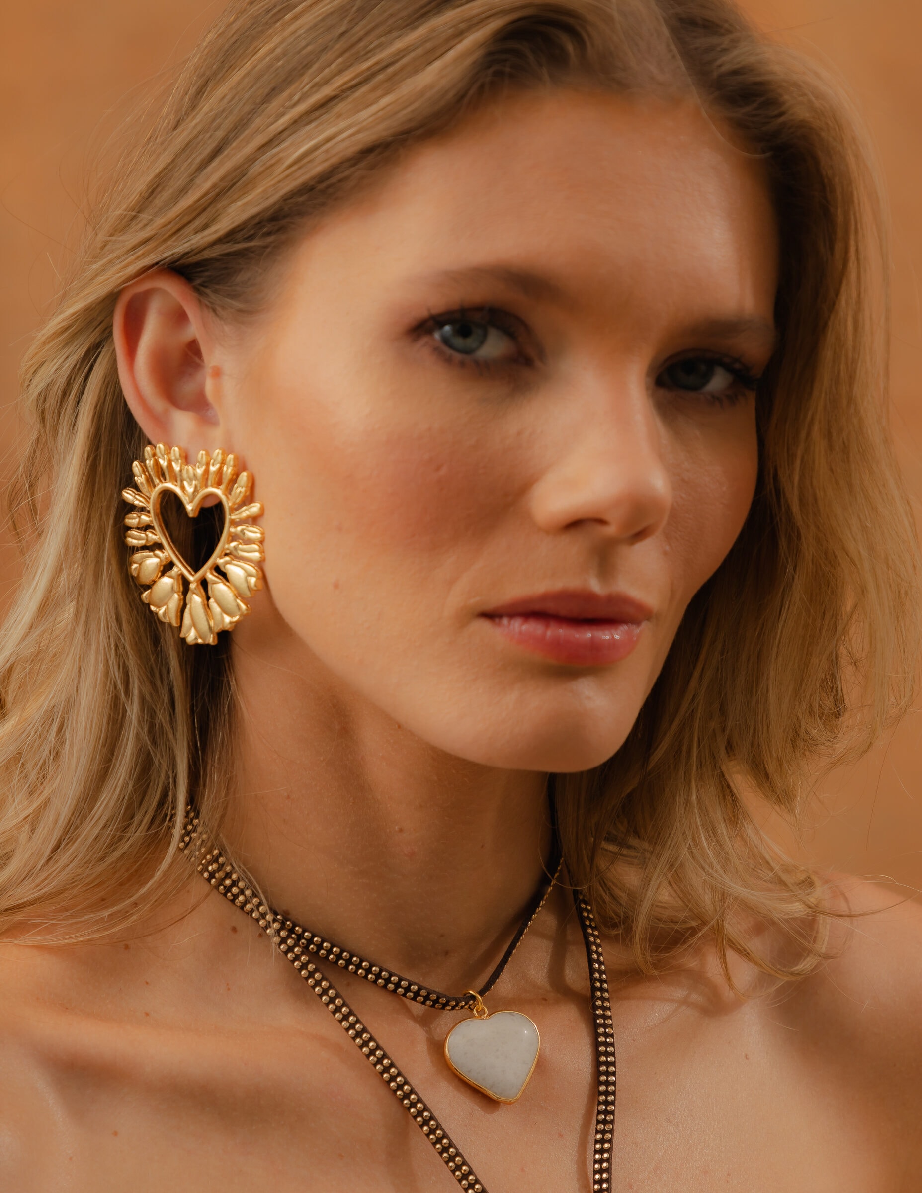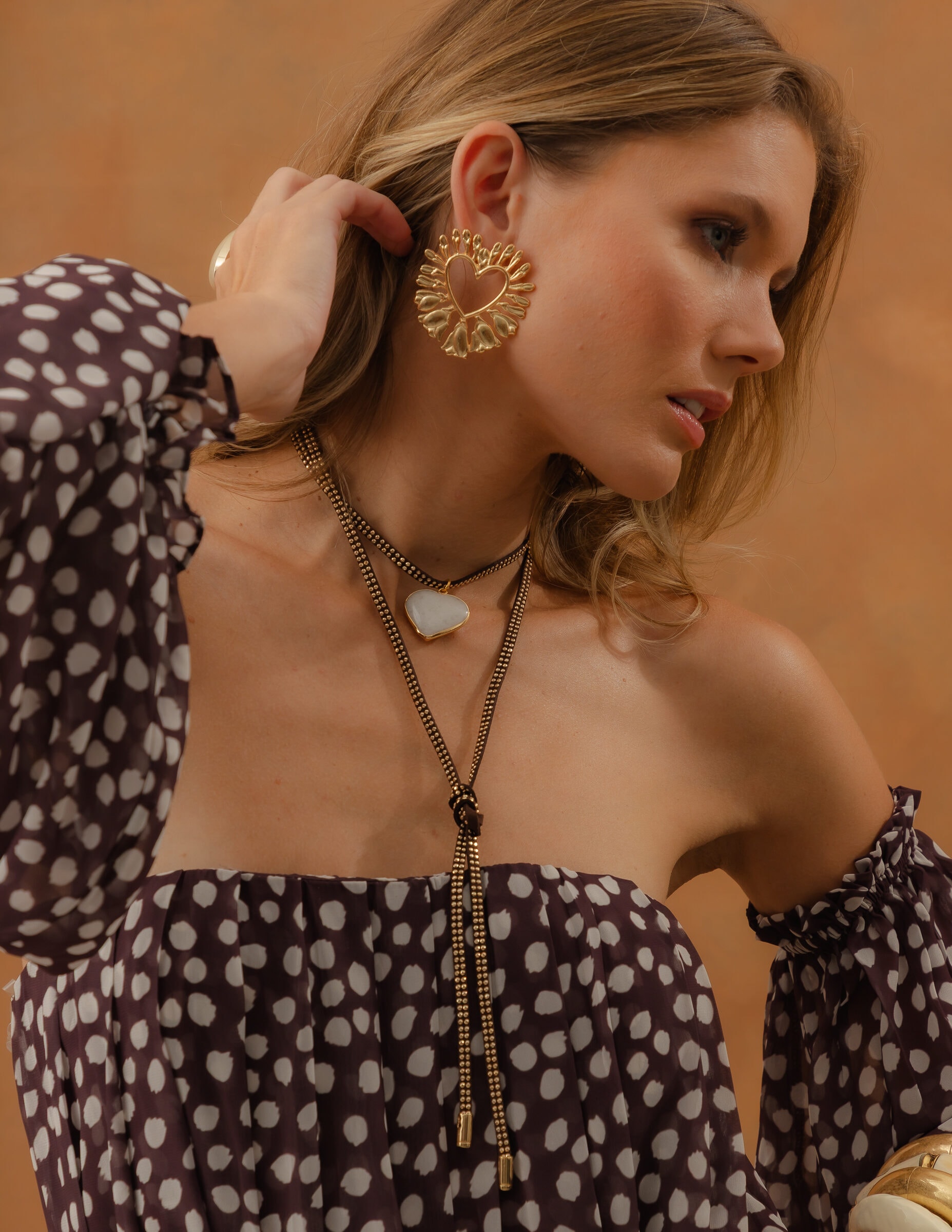 Todos os nossos metais são banhados a ouro, possuem camada protetiva para bijuterias finas e também possuem camada de metal precioso em sua composição. As bijuterias precisam de cuidados, limpe-as com flanela seca e macia, evite contato direto com cosméticos, areia, praia e piscina.