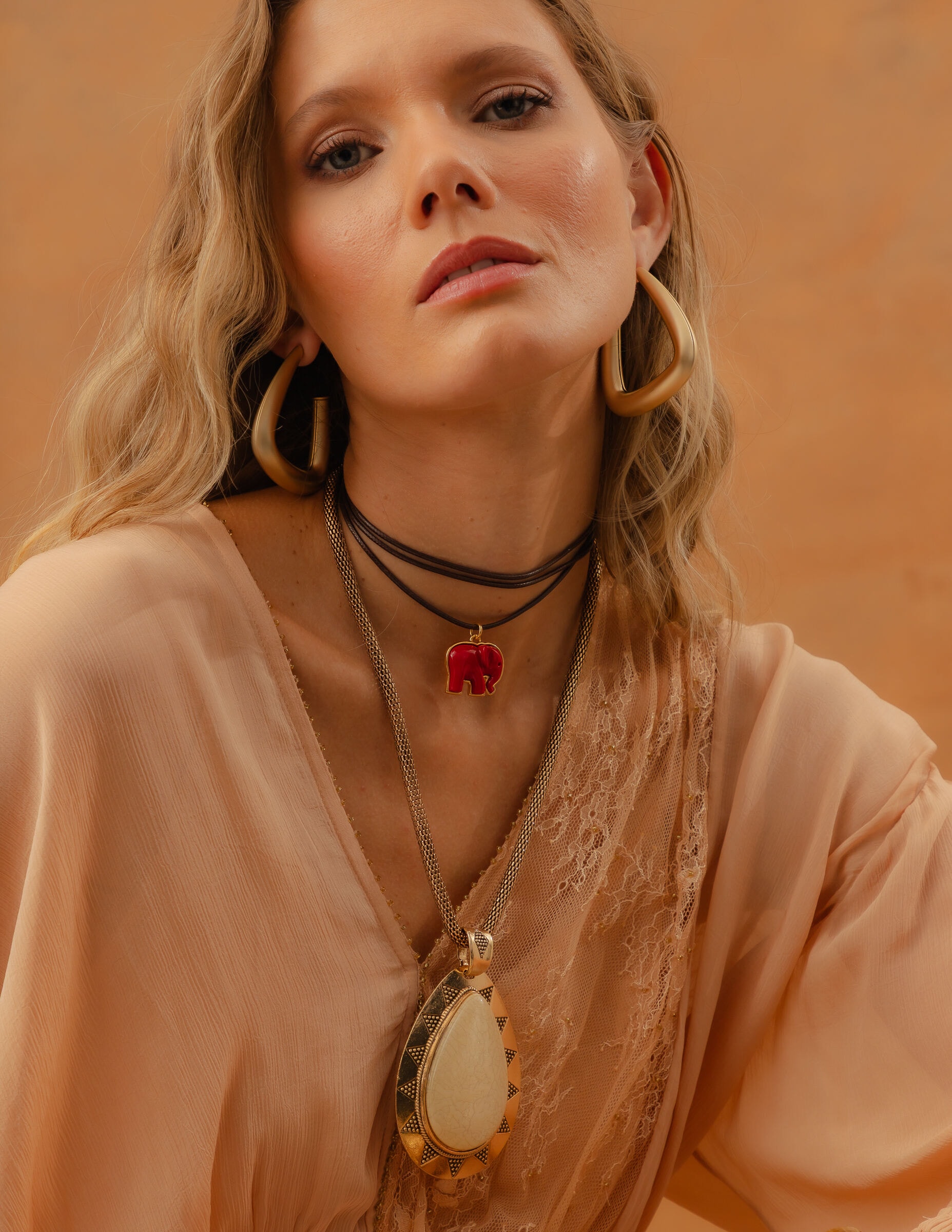 Todos os nossos metais são banhados a ouro, possuem camada protetiva para bijuterias finas e também possuem camada de metal precioso em sua composição. As bijuterias precisam de cuidados, limpe-as com flanela seca e macia, evite contato direto com cosméticos, areia, praia e piscina.