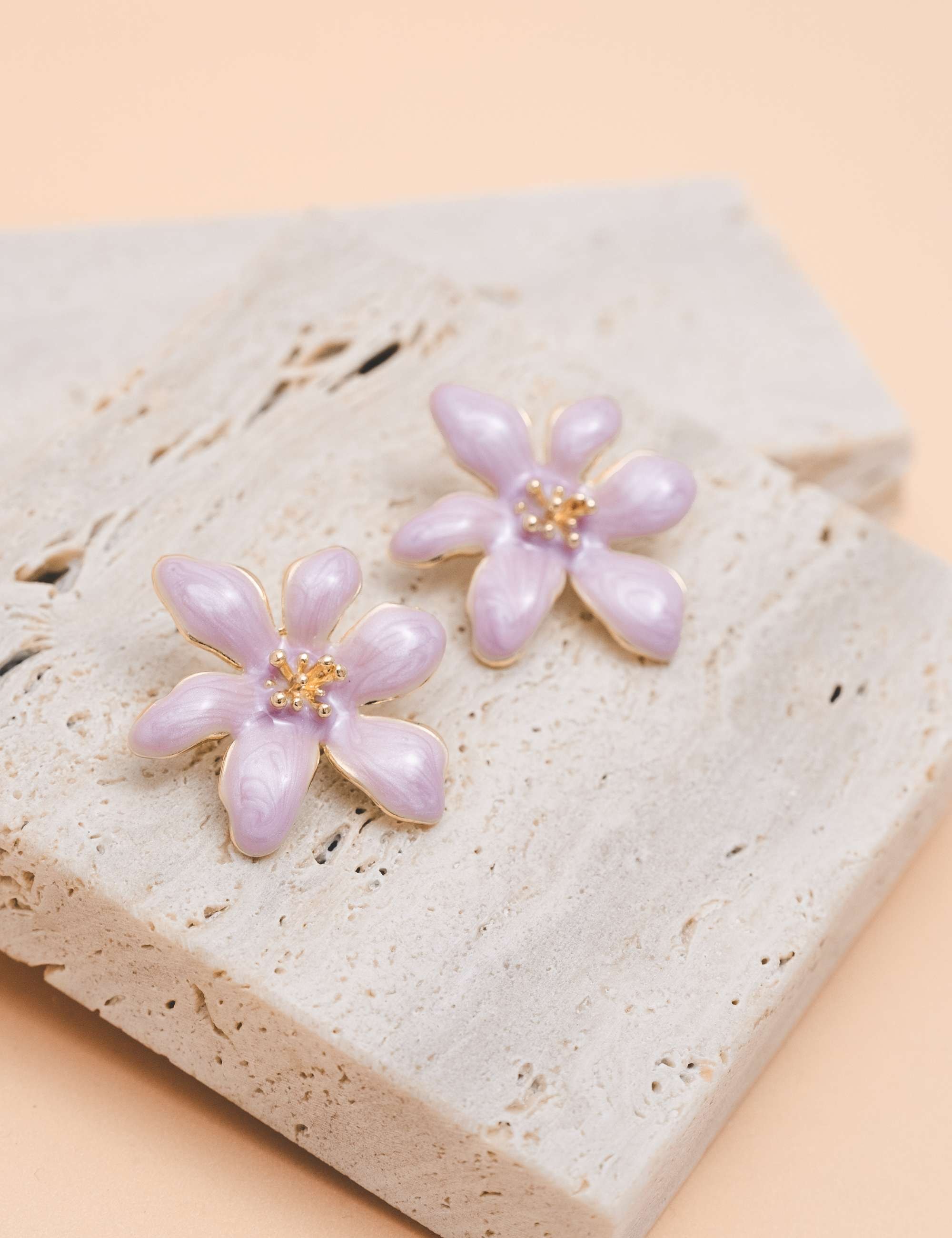 Brinco esmaltado na cor lavanda perolizado, com formato de flor e detalhes no miolo dourado . Peça latao, pino aço cirúrgico, banhado a ouro, esmaltação resina italiana feito a mão o processo. As flores traduzem romantismo e ao mesmo tempo estilo, além de trazerem aquele ar mais moderno e sofisticado através da esmaltação.
