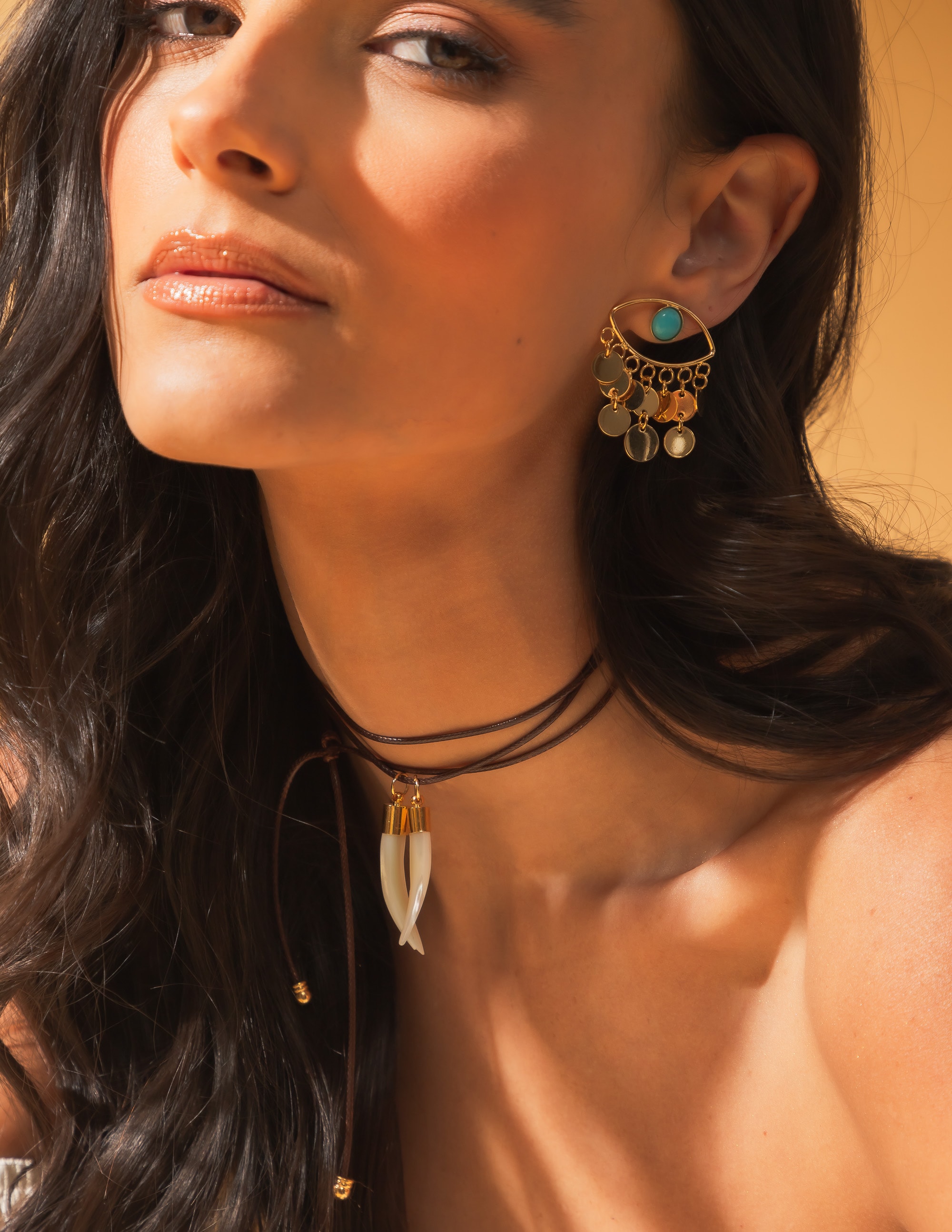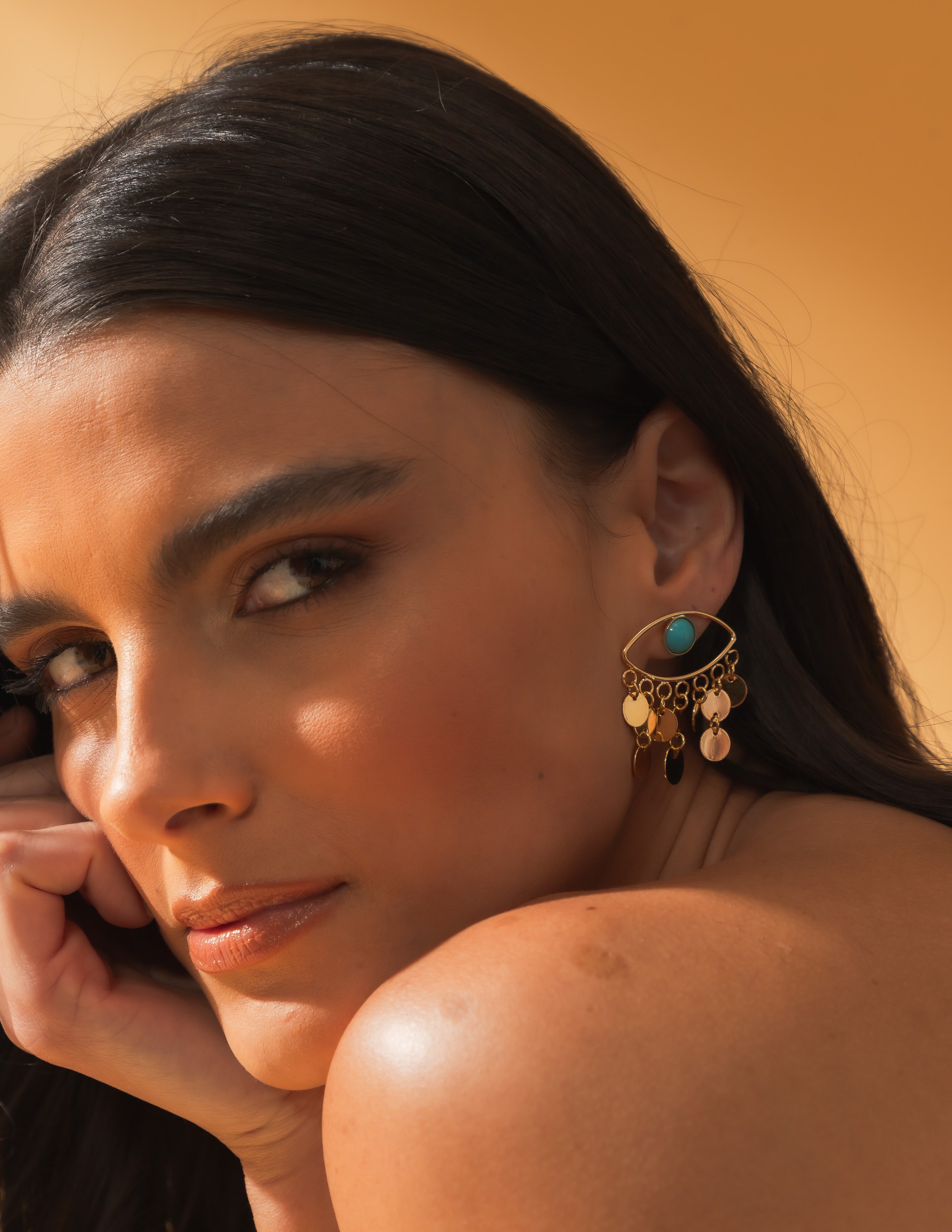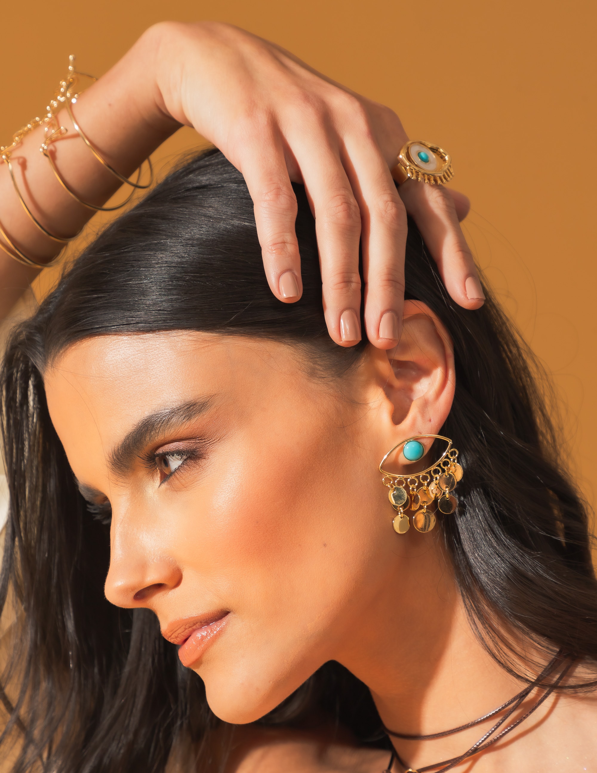 Todos os nossos metais são banhados a ouro, possuem camada protetiva para bijuterias finas e também possuem camada de metal precioso em sua composição. As bijuterias precisam de cuidados, limpe-as com flanela seca e macia, evite contato direto com cosméticos, areia, praia e piscina.