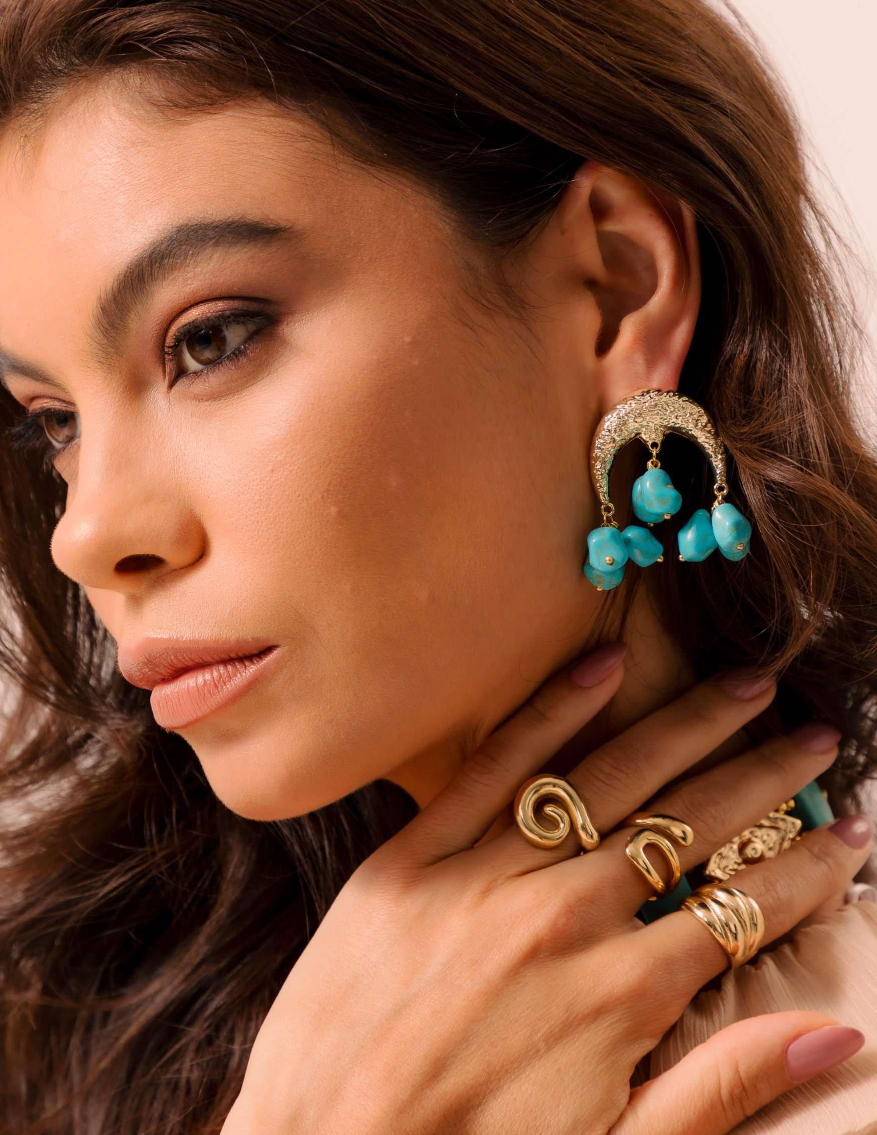 Todos os nossos metais são banhados a ouro, possuem camada protetiva para bijuterias finas e também possuem camada de metal precioso em sua composição. As bijuterias precisam de cuidados, limpe-as com flanela seca e macia, evite contato direto com cosméticos, areia, praia e piscina.