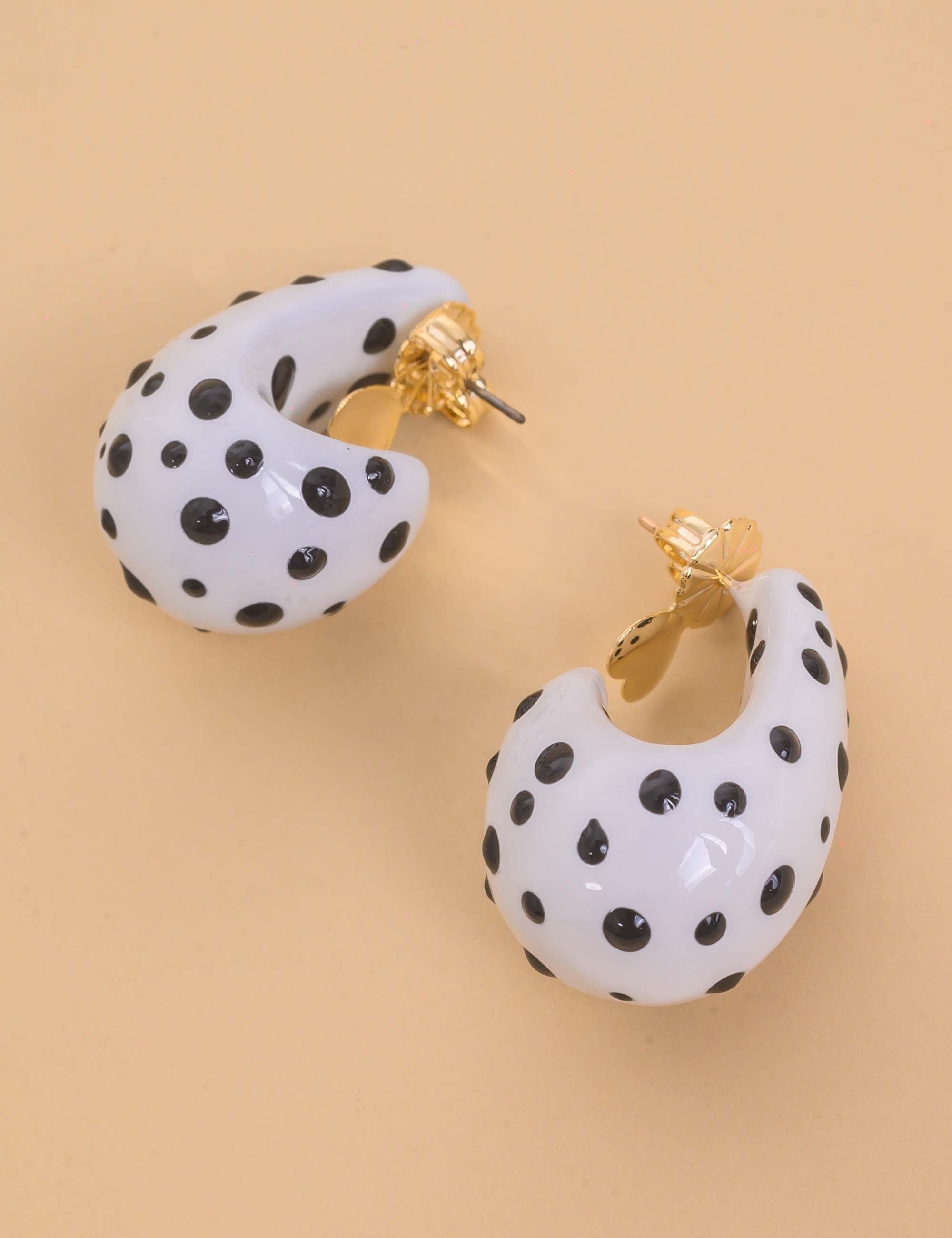 Brinco poá de resina preta com detalhes brancos, elegante e versátil, perfeito para adicionar charme e estilo ao visual.