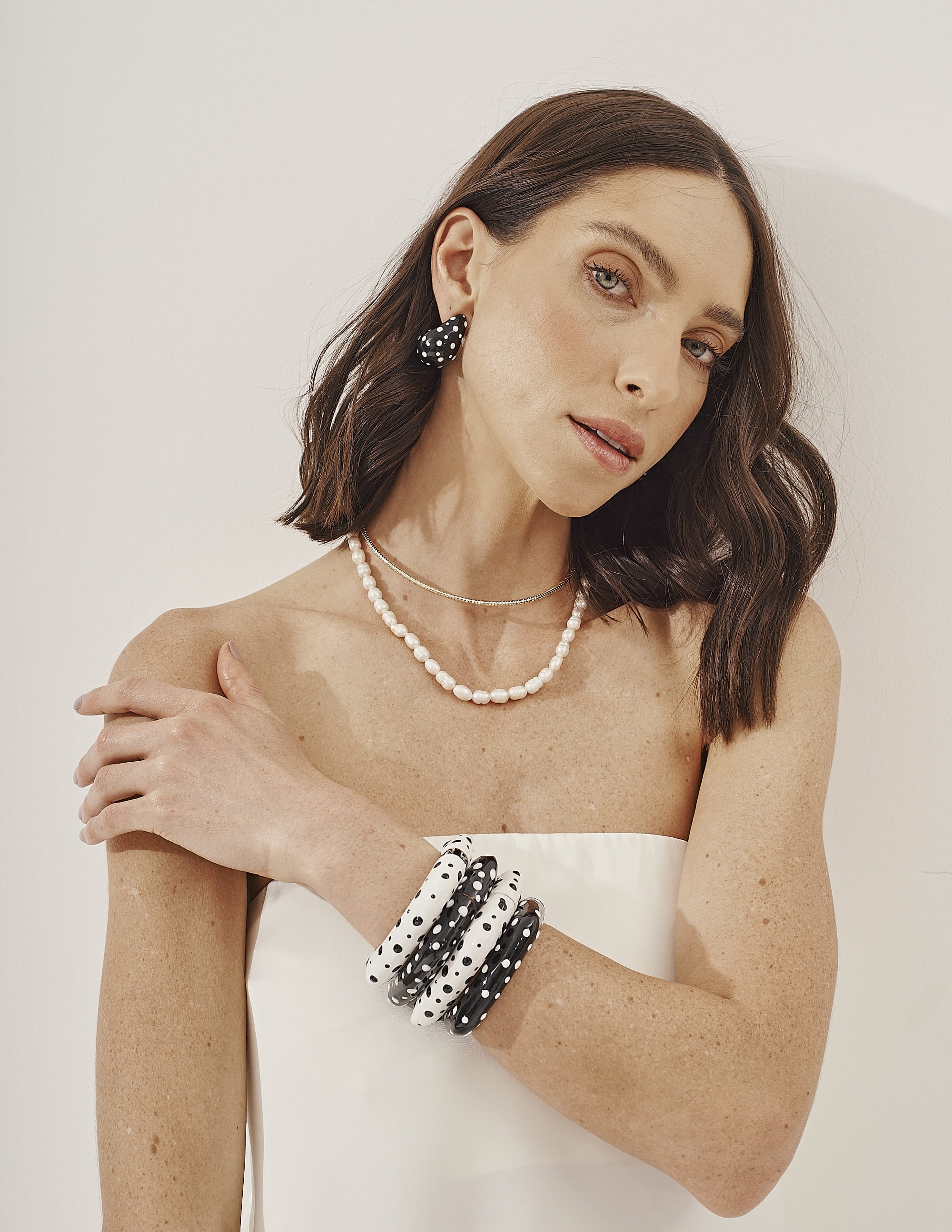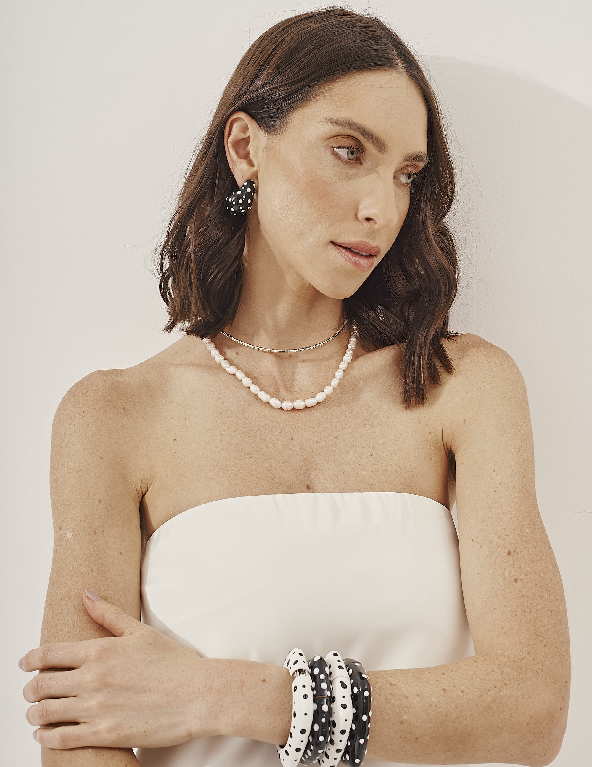 Brinco poá de resina preta com detalhes brancos, elegante e versátil, perfeito para adicionar charme e estilo ao visual.