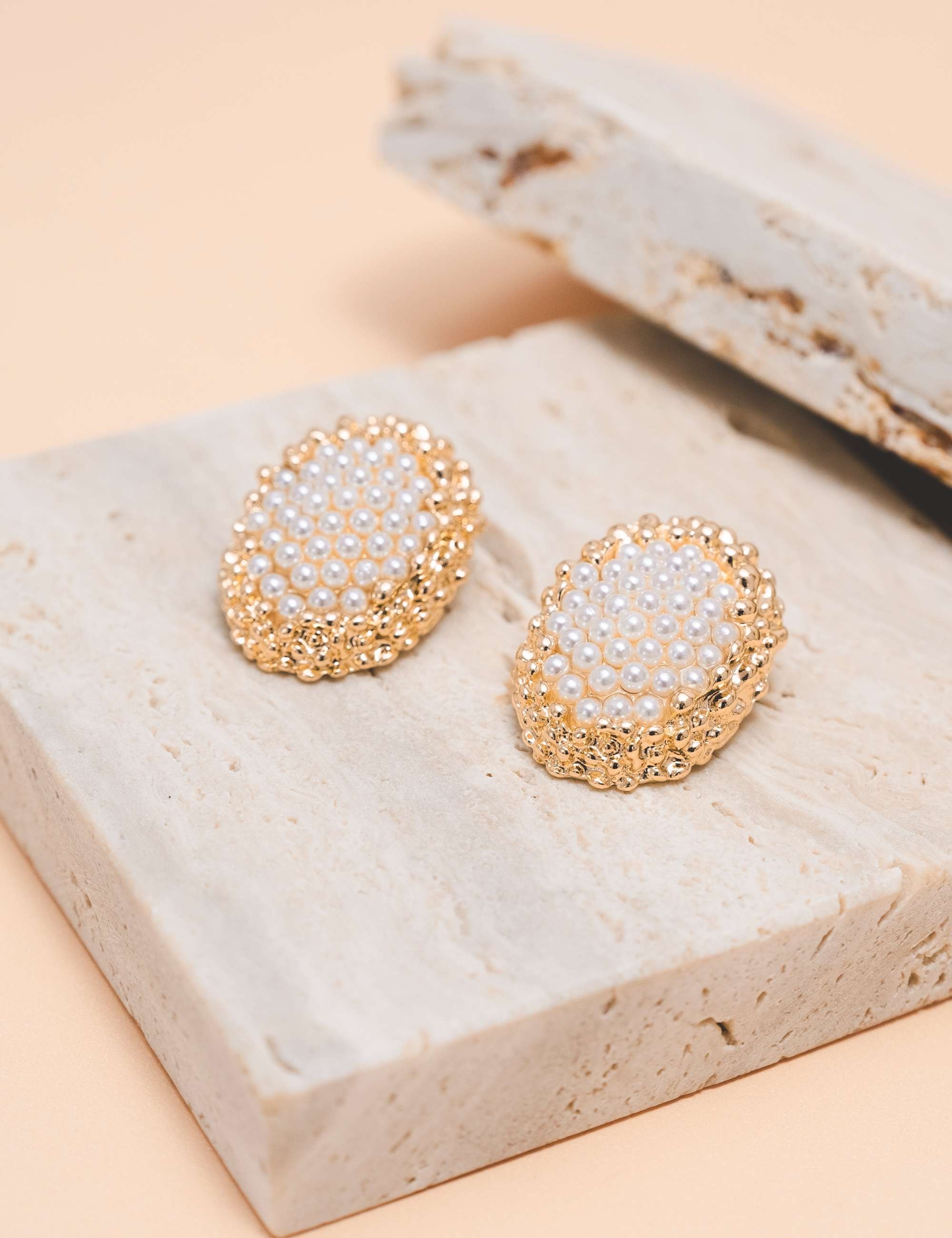 Peça: Brinco alta fusão, em formato oval com detalhes no meio de esferas em pérola resinada e lateral texturizado, fecho em pressão.