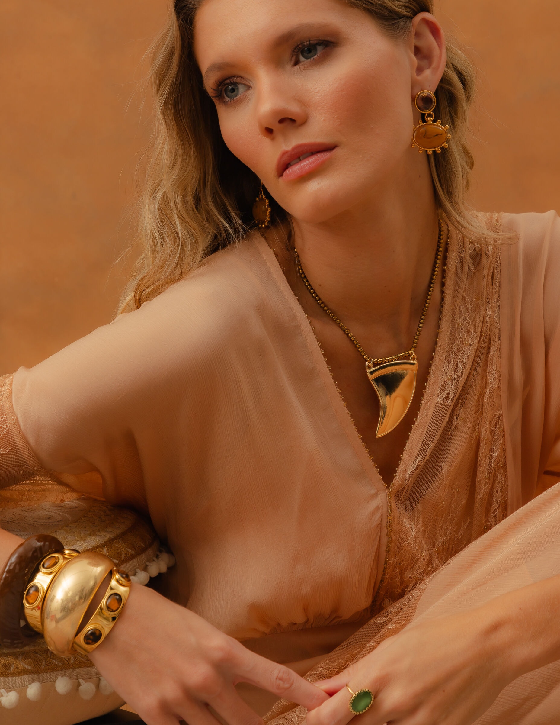 Todos os nossos metais são banhados a ouro, possuem camada protetiva para bijuterias finas e também possuem camada de metal precioso em sua composição. As bijuterias precisam de cuidados, limpe-as com flanela seca e macia, evite contato direto com cosméticos, areia, praia e piscina.