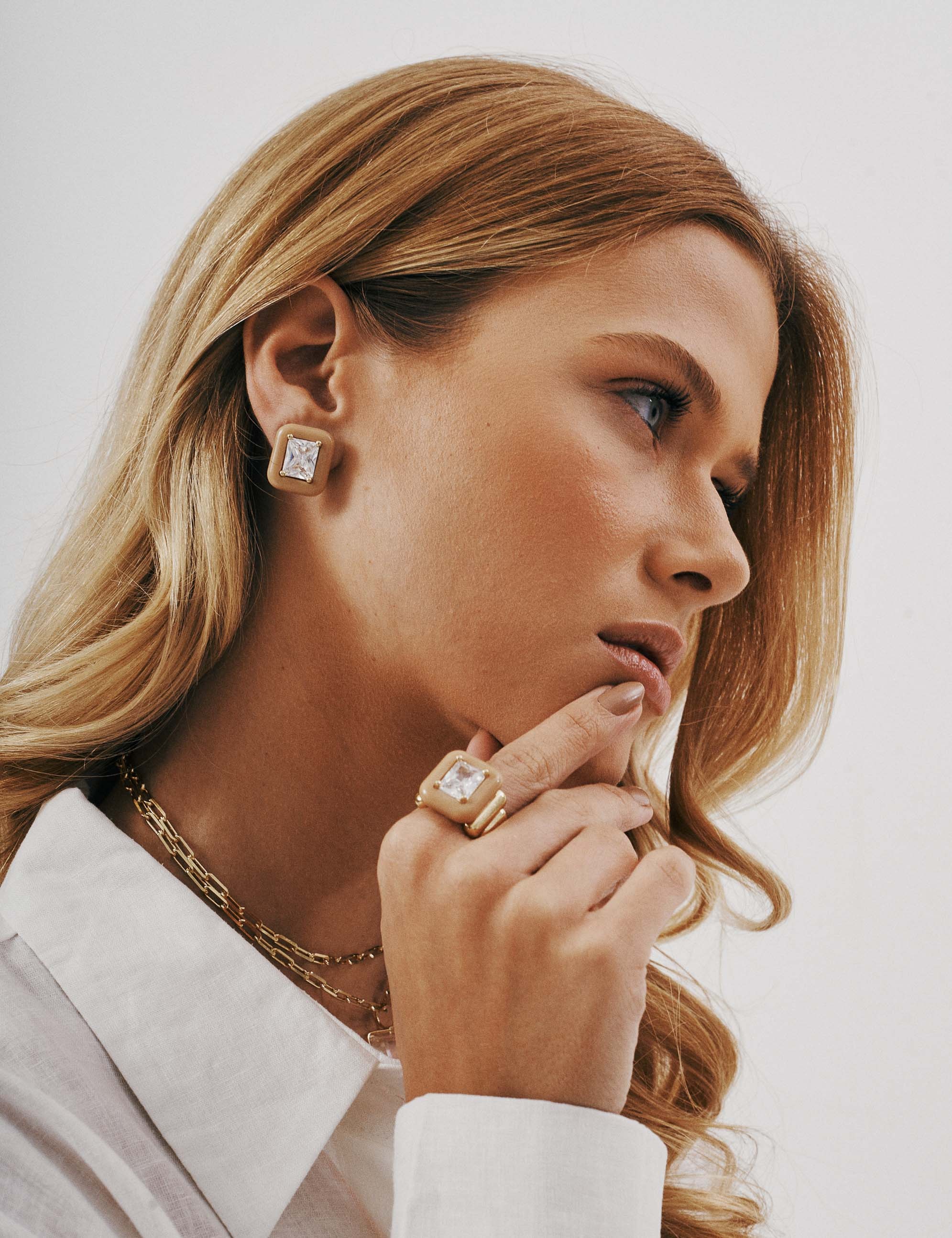 BRINCO RETÂNGULO BEGE COM CRISTAL Garantia: 6 meses.