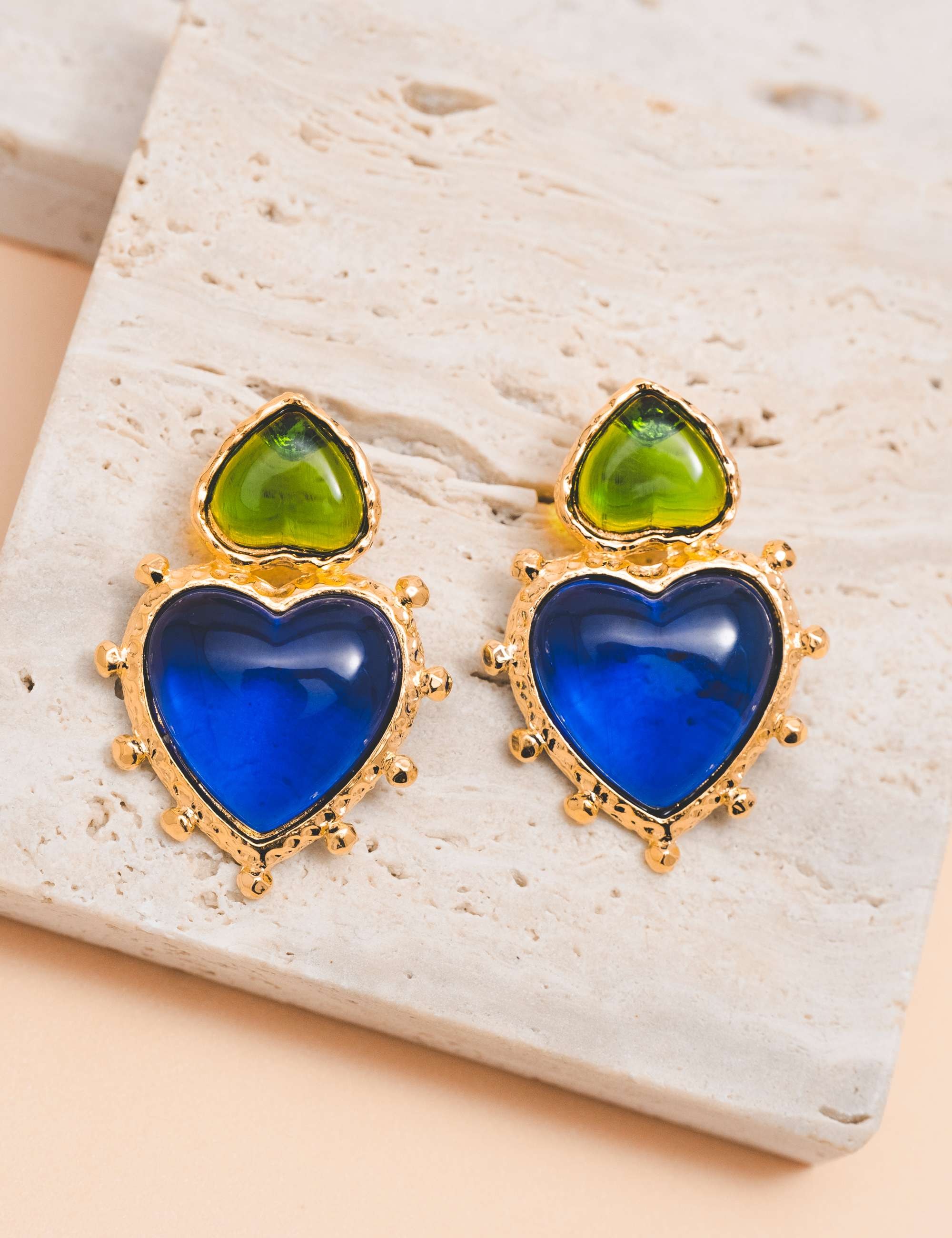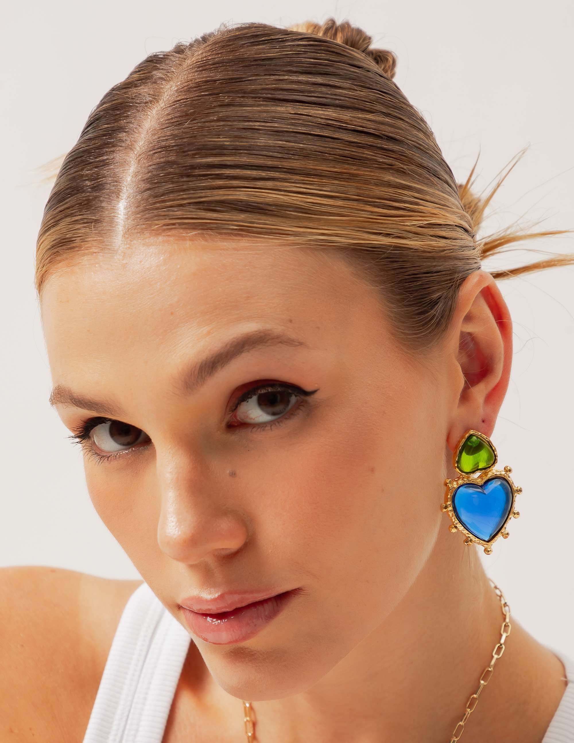 Peça: Brinco com base de coração em resina verde e pêndulo de coração azul. Aquele brinco que flui em qualquer momento e traz leveza e glamour ao mesmo tempo.