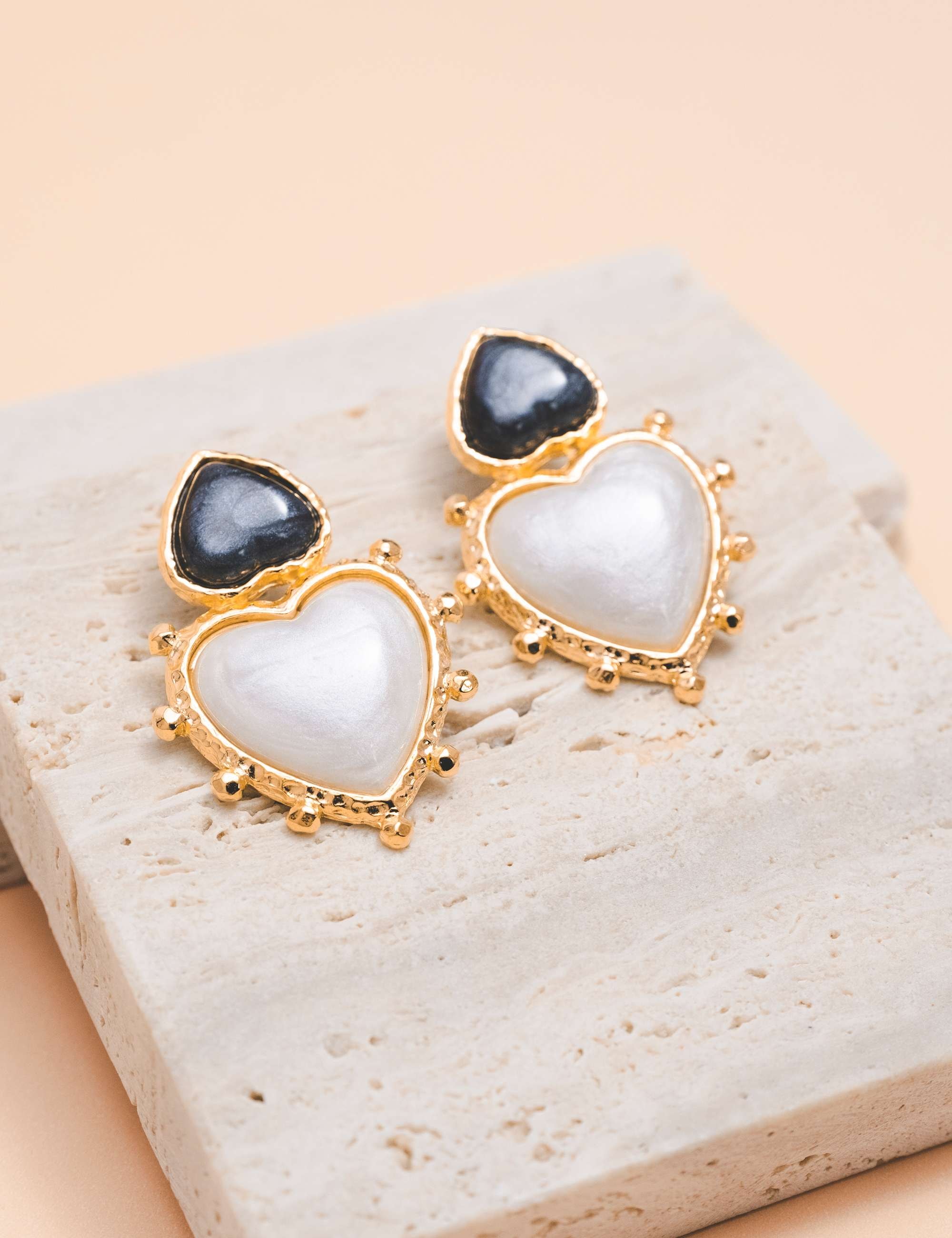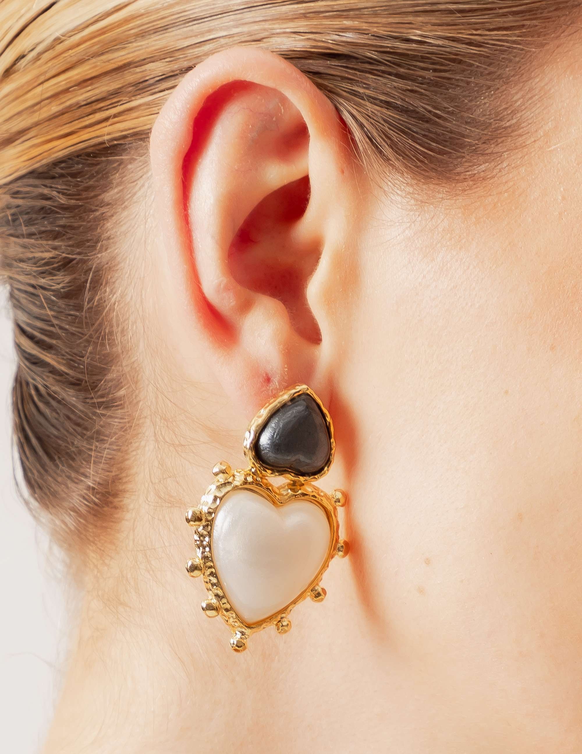 Peça: Brinco com base de coração em resina preto perolado e pêndulo de coração pérola. Aquele brinco que flui em qualquer momento e traz leveza e glamour ao mesmo tempo.