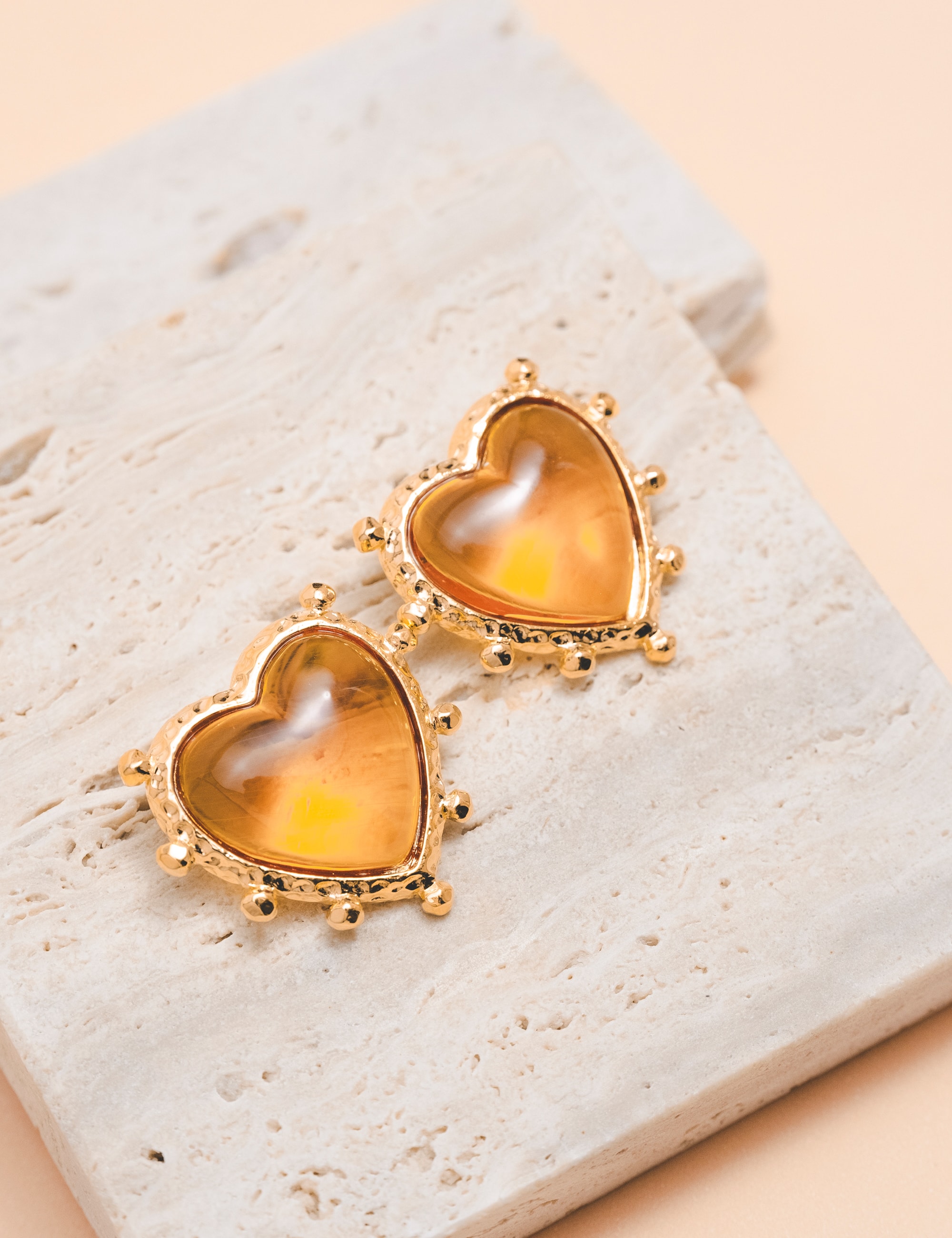 Brinco banhado a ouro com resina em formato de coração na cor laranja. Um acessório moderno e elegante, perfeito para valorizar o visual com um toque de charme e atitude.