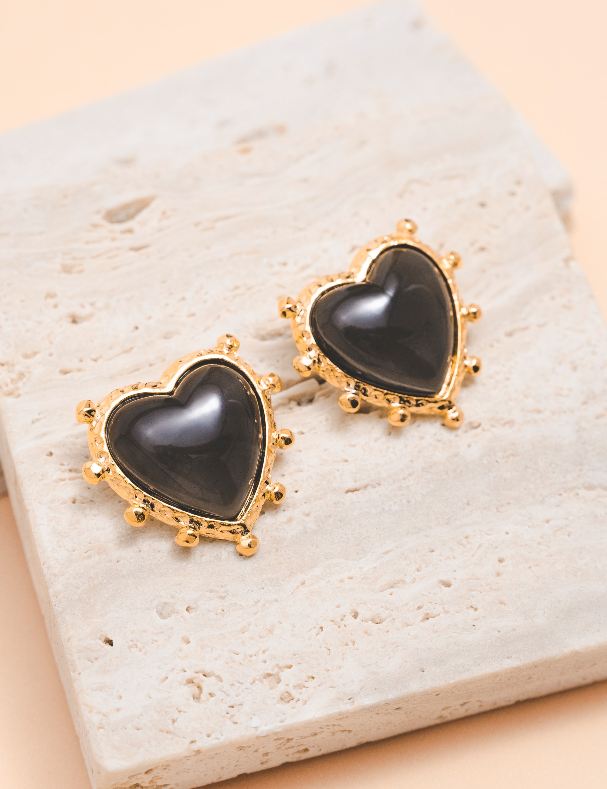 Brinco banhado a ouro com resina em formato de coração na cor preta. Um acessório moderno e elegante, perfeito para valorizar o visual com um toque de charme e atitude.