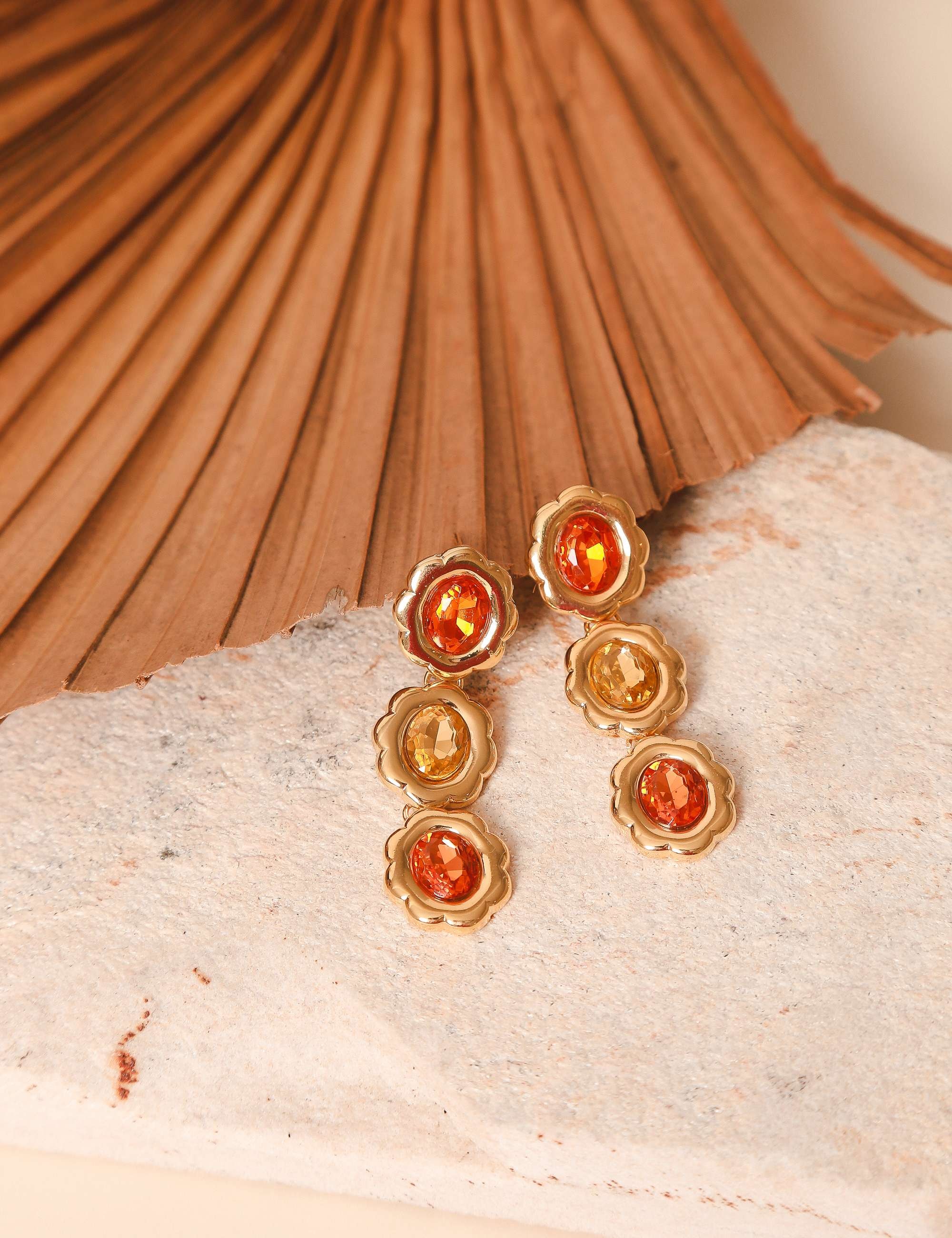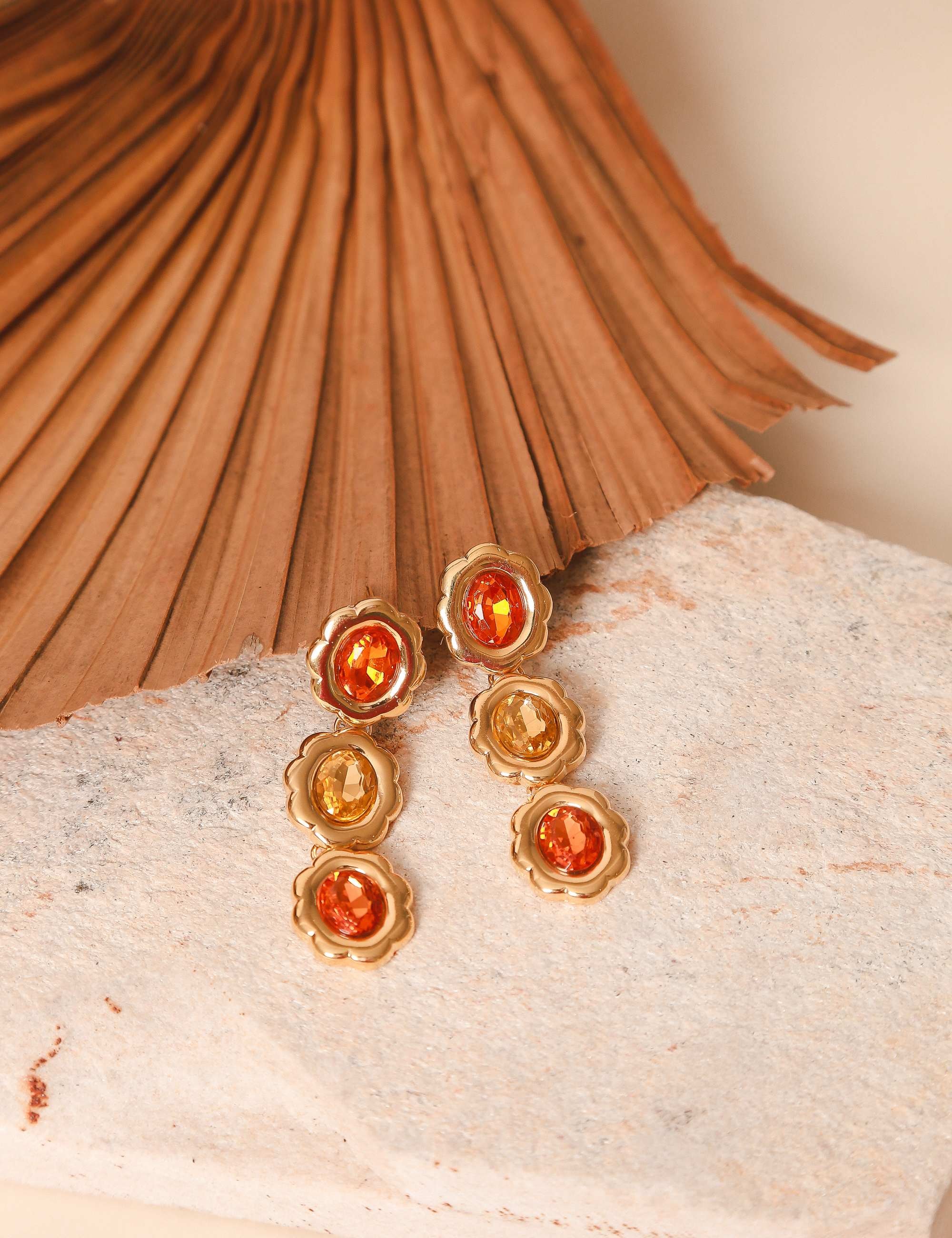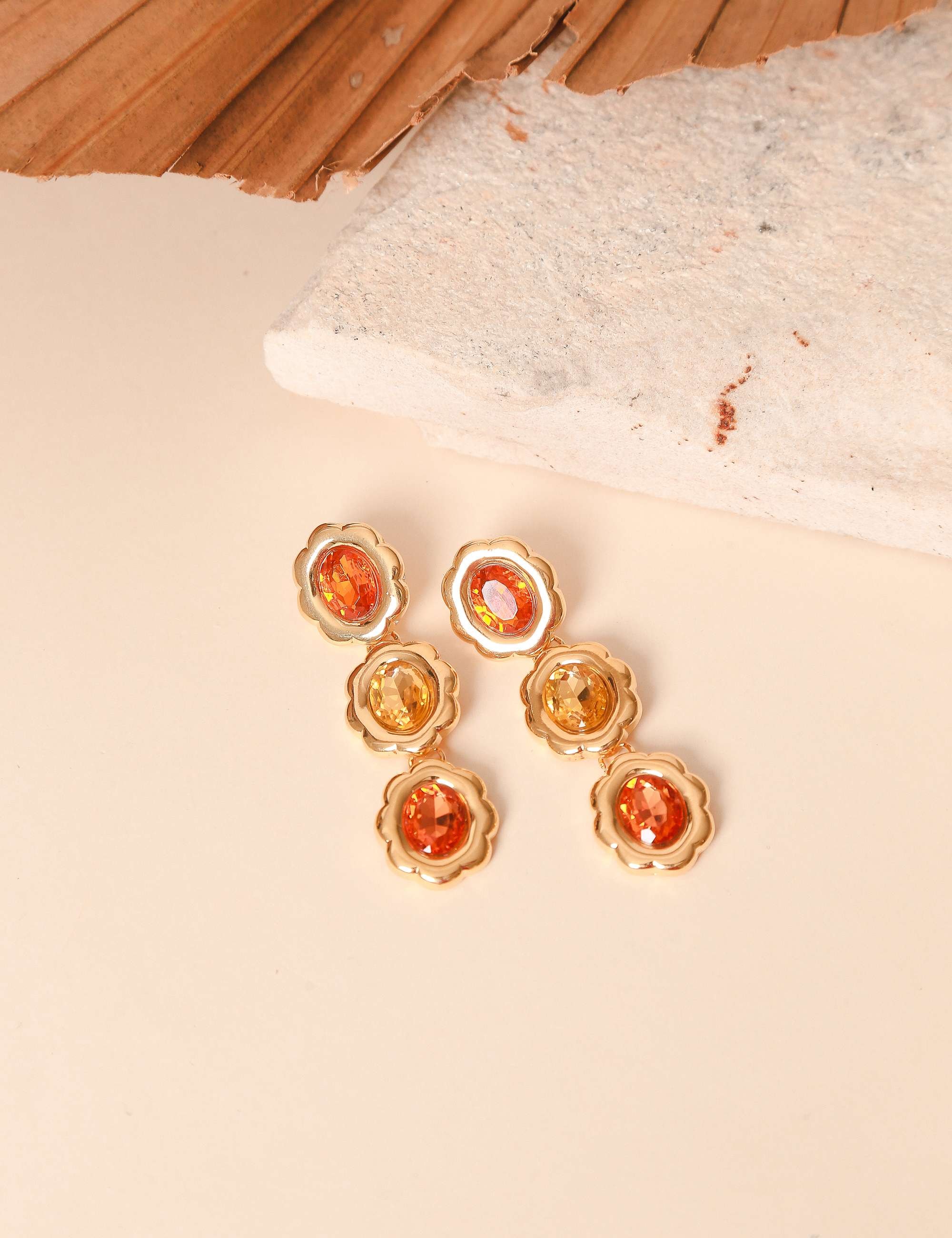Brinco formato semelhante a flor com cristais sintéticos e sua lateral no dourado. O brinco trio Laranja e Amarelo traz mais estilo e alegria.