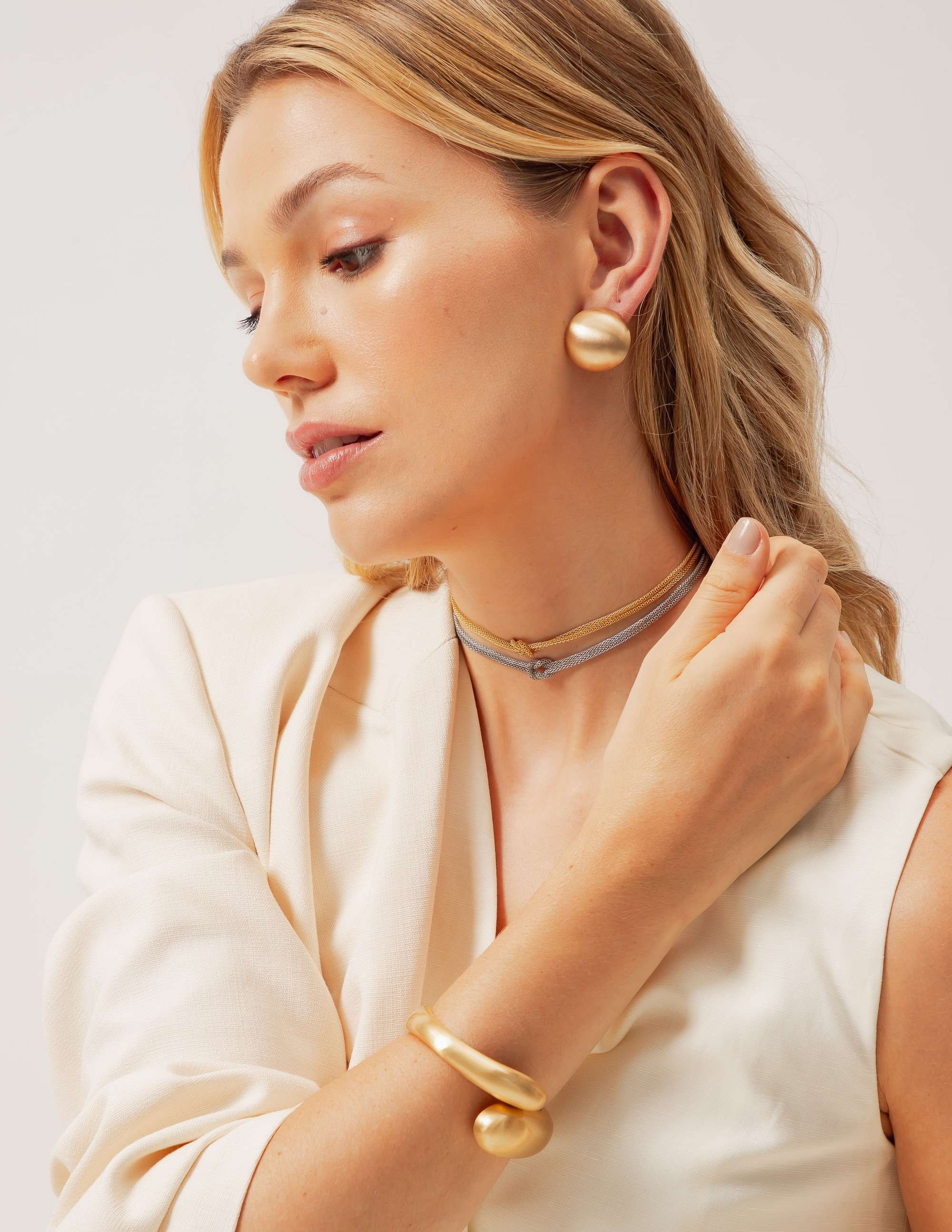 Todos os nossos metais são banhados a ouro, possuem camada protetiva para bijuterias finas e também possuem camada de metal precioso em sua composição. As bijuterias precisam de cuidados, limpe-as com flanela seca e macia, evite contato direto com cosméticos, areia, praia e piscina.