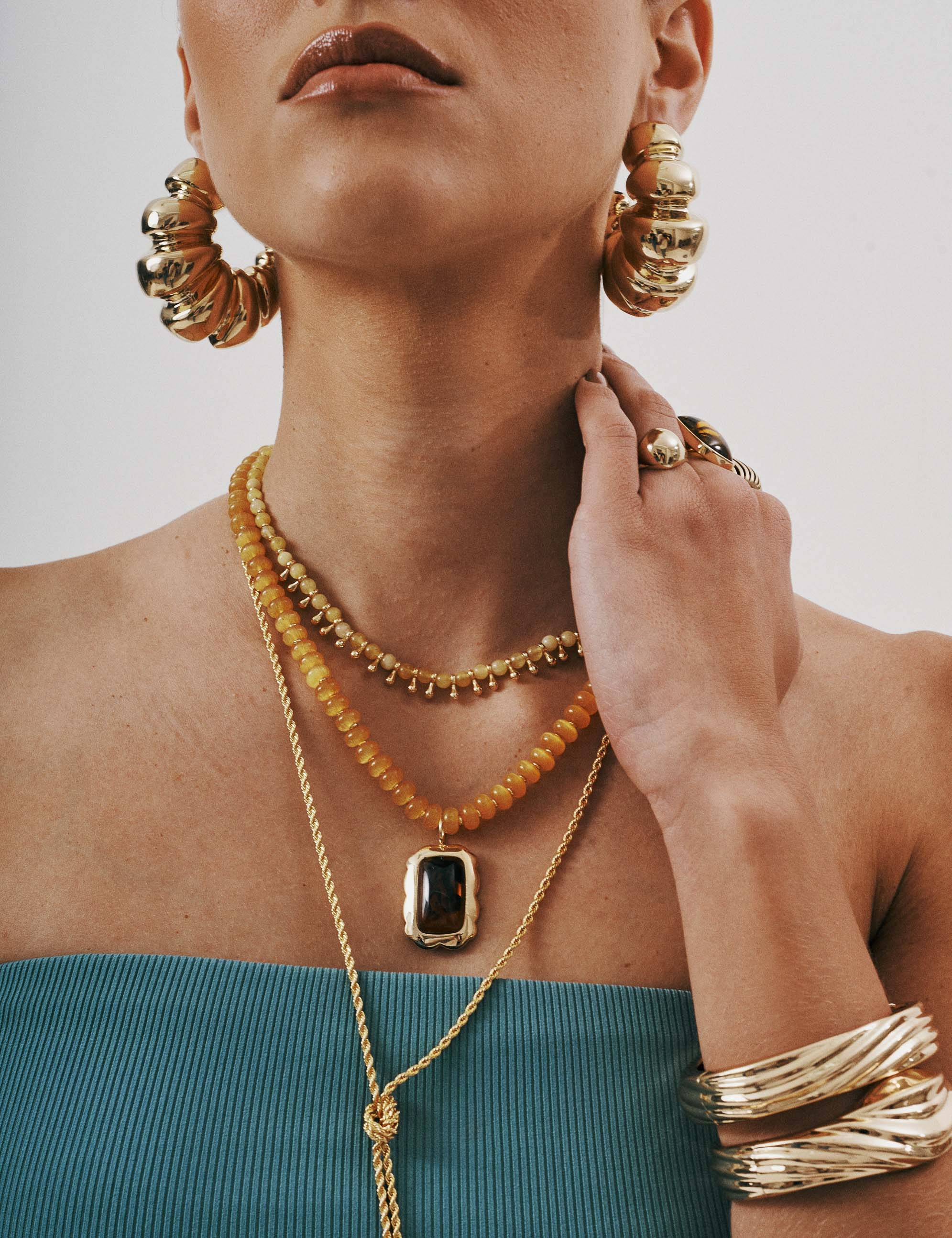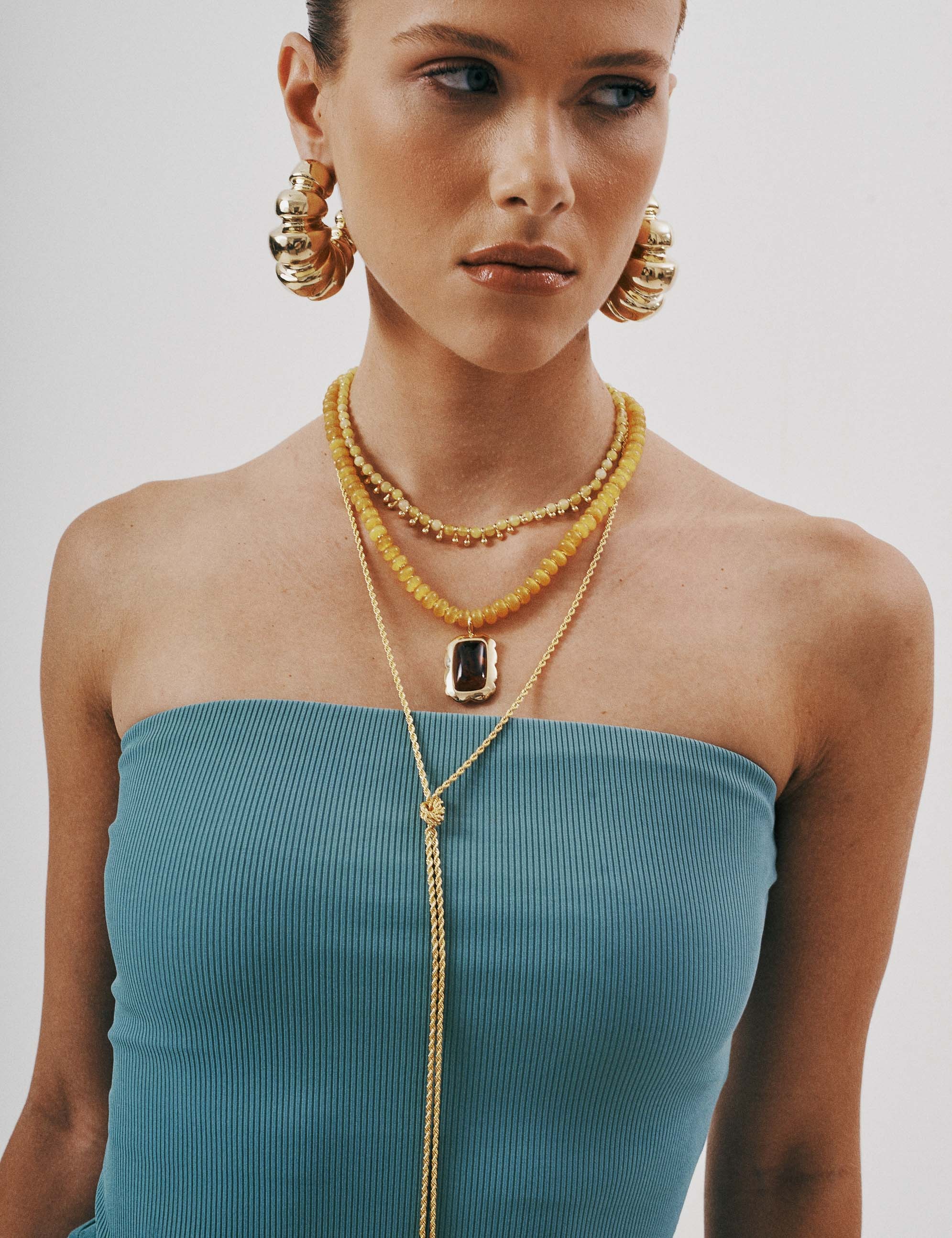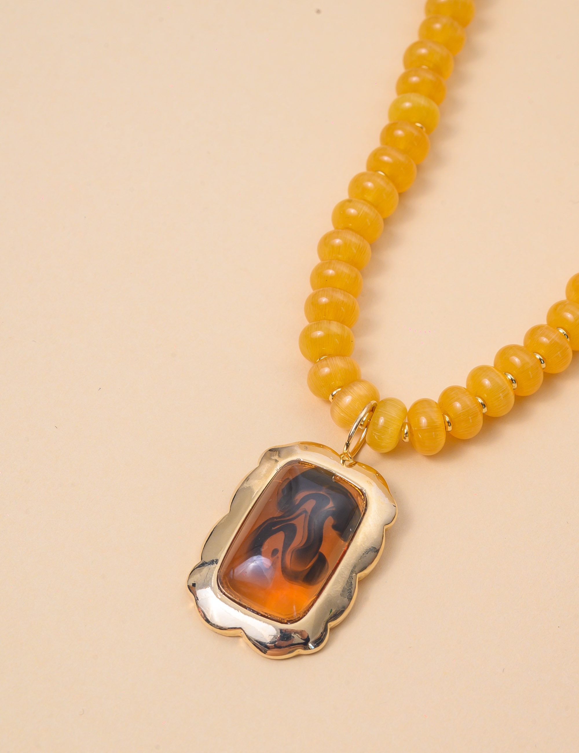 Colar na tonalidade amarela com pingente retangular, peça versátil que adiciona cor e leveza às produções.