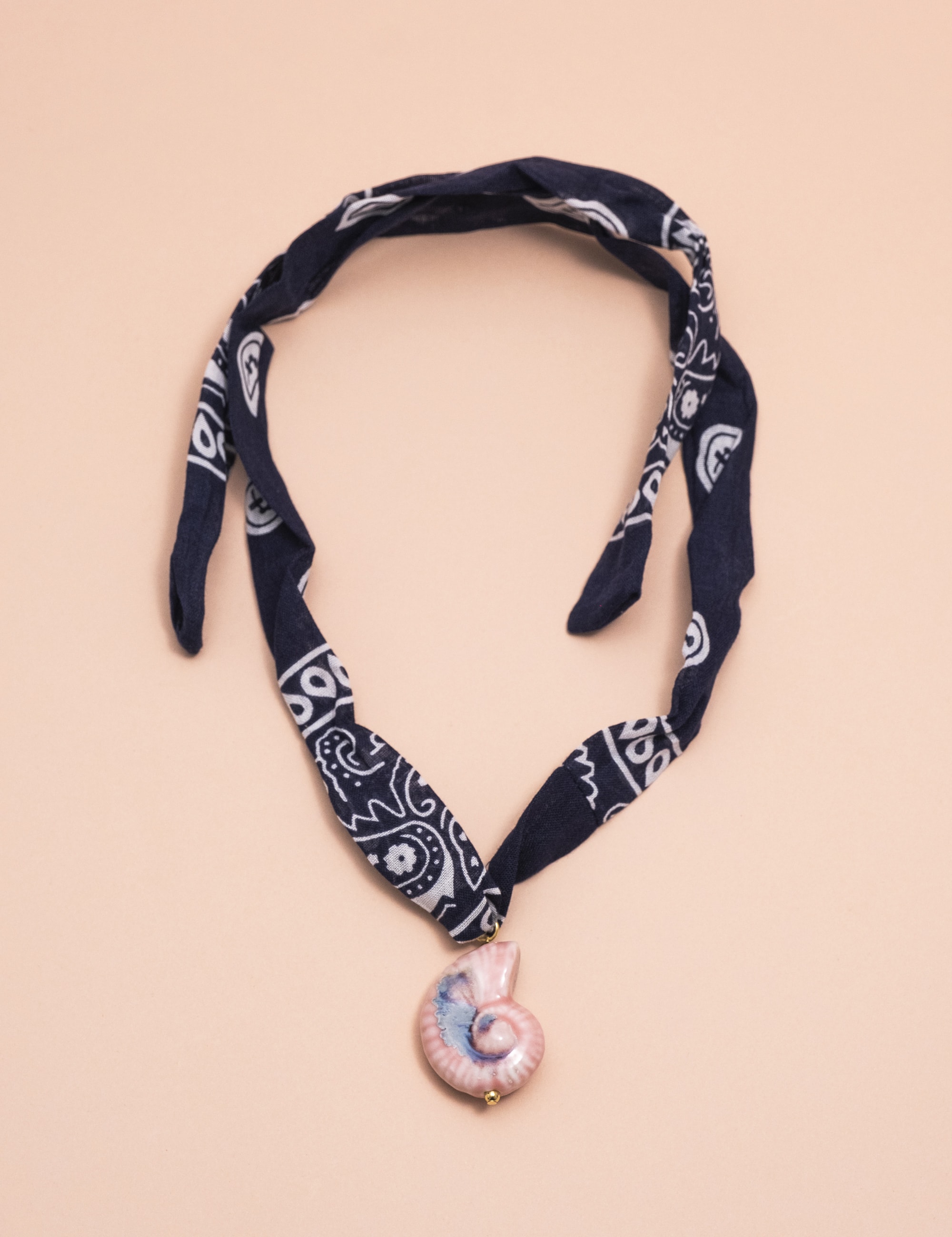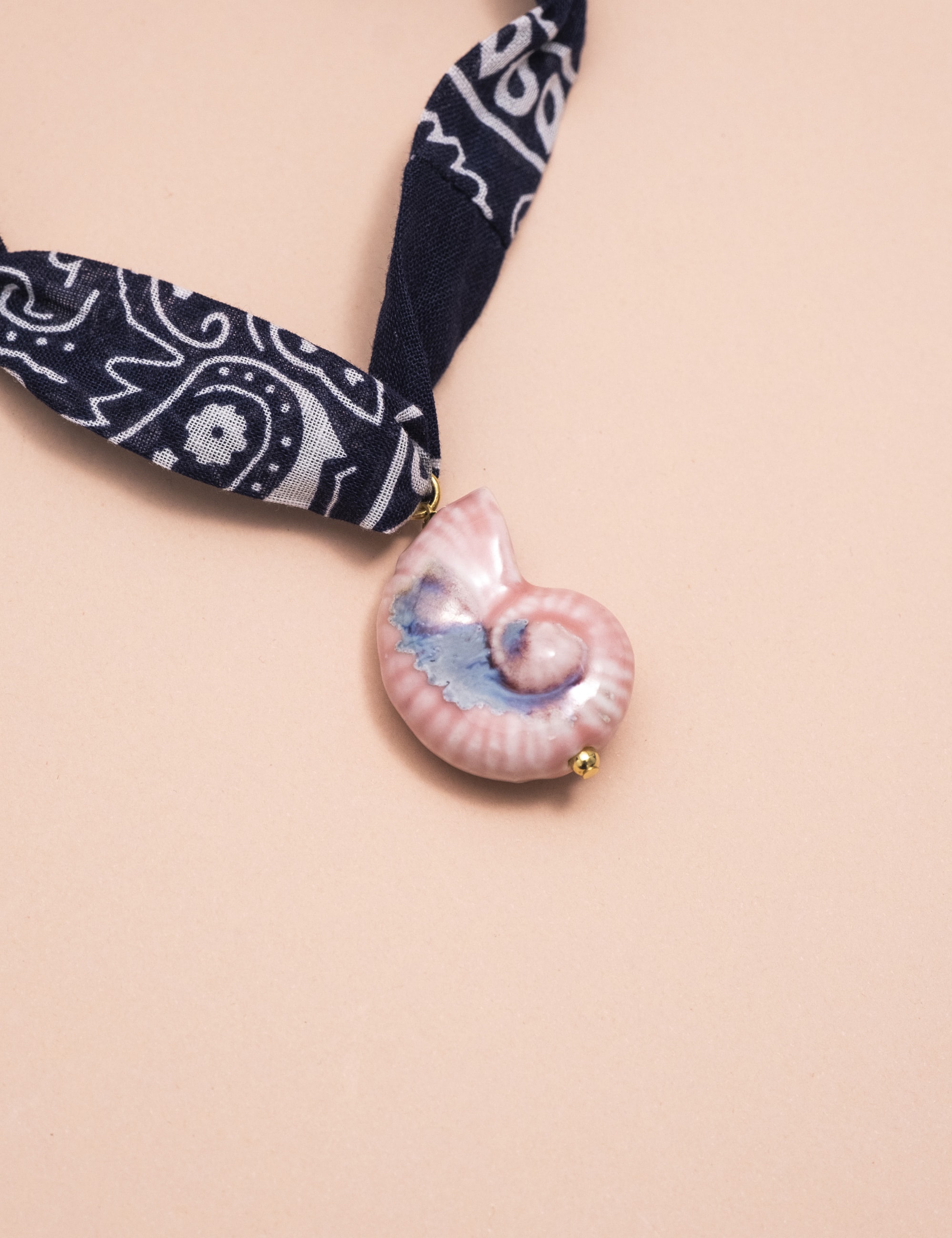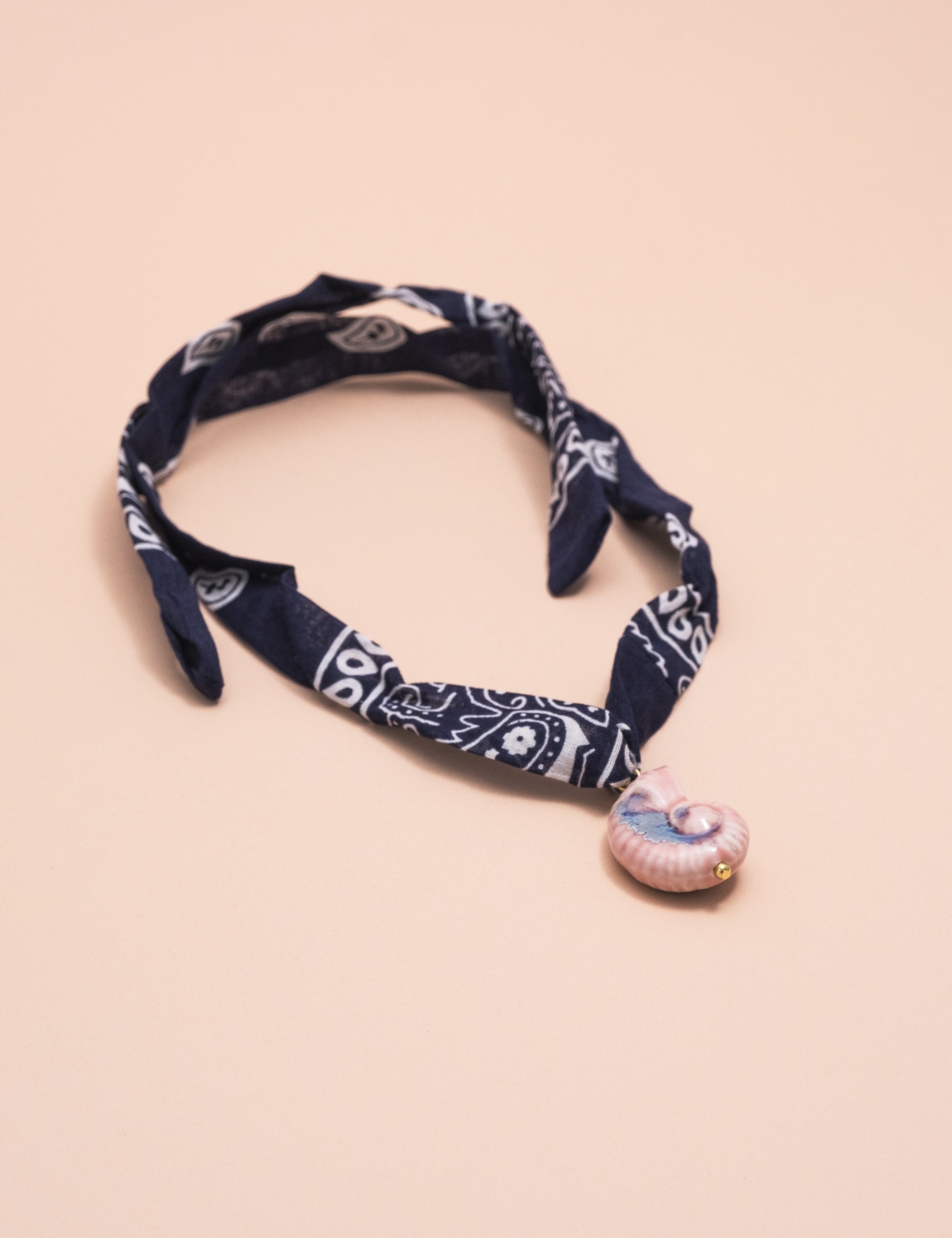 Peça: Colar bandana com tecido de algodão, com detalhes de pingente no formato de concha resinada. Perfeito para adicionar um toque de elegância e feminilidade a qualquer visual. Proporcionando um charme delicado e sofisticado que complementa tanto trajes formais quanto casuais.
