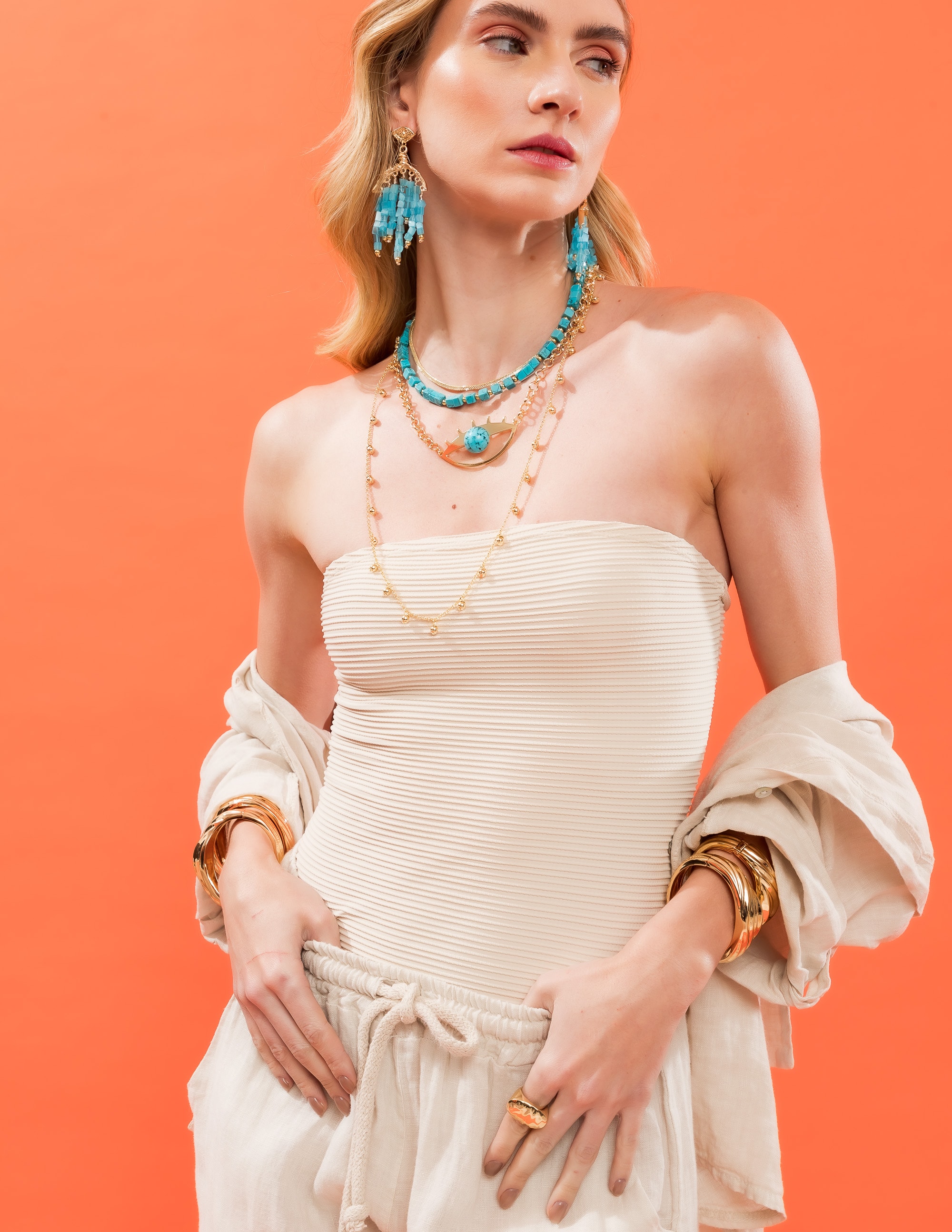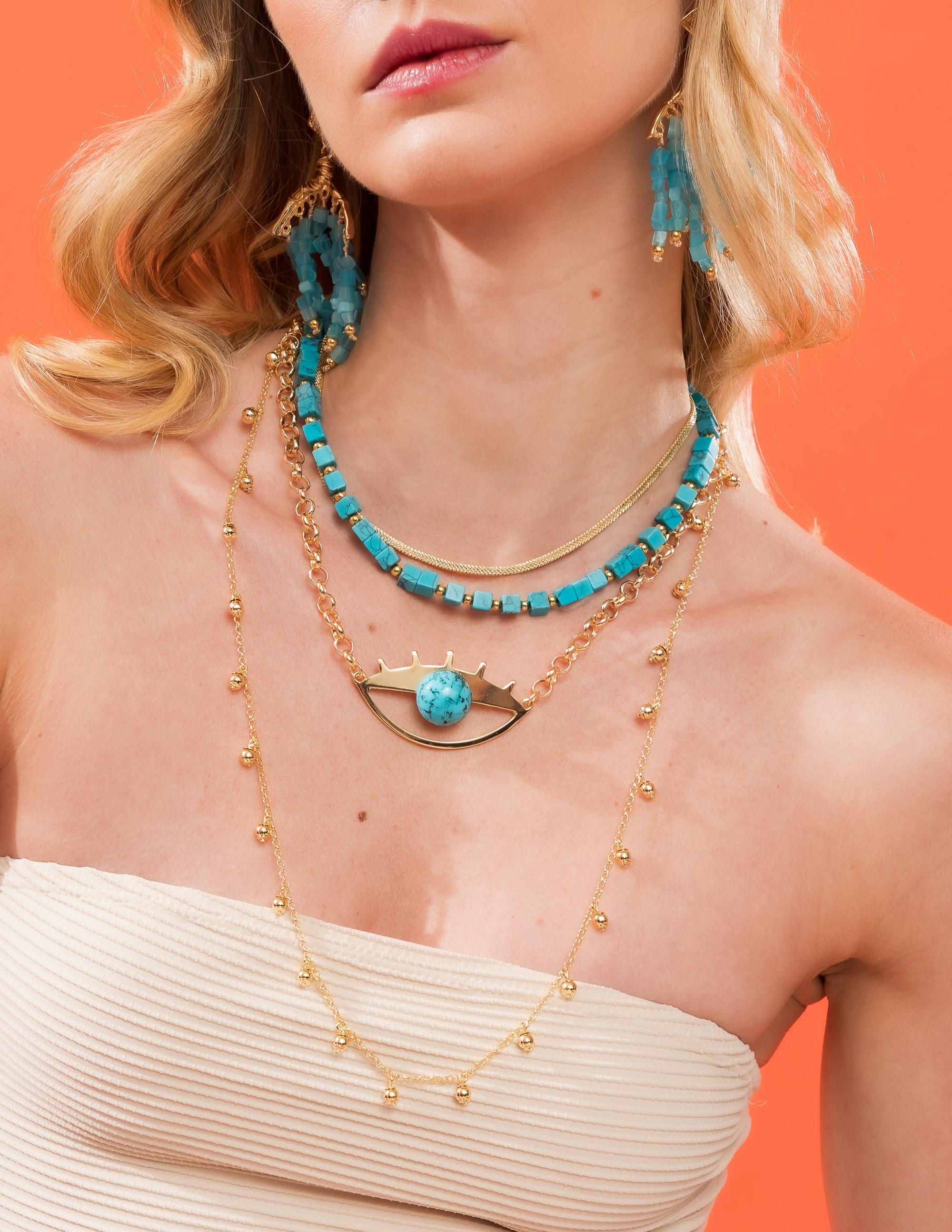 Todos os nossos metais são banhados a ouro, possuem camada protetiva para bijuterias finas e também possuem camada de metal precioso em sua composição. As bijuterias precisam de cuidados, limpe-as com flanela seca e macia, evite contato direto com cosméticos, areia, praia e piscina.