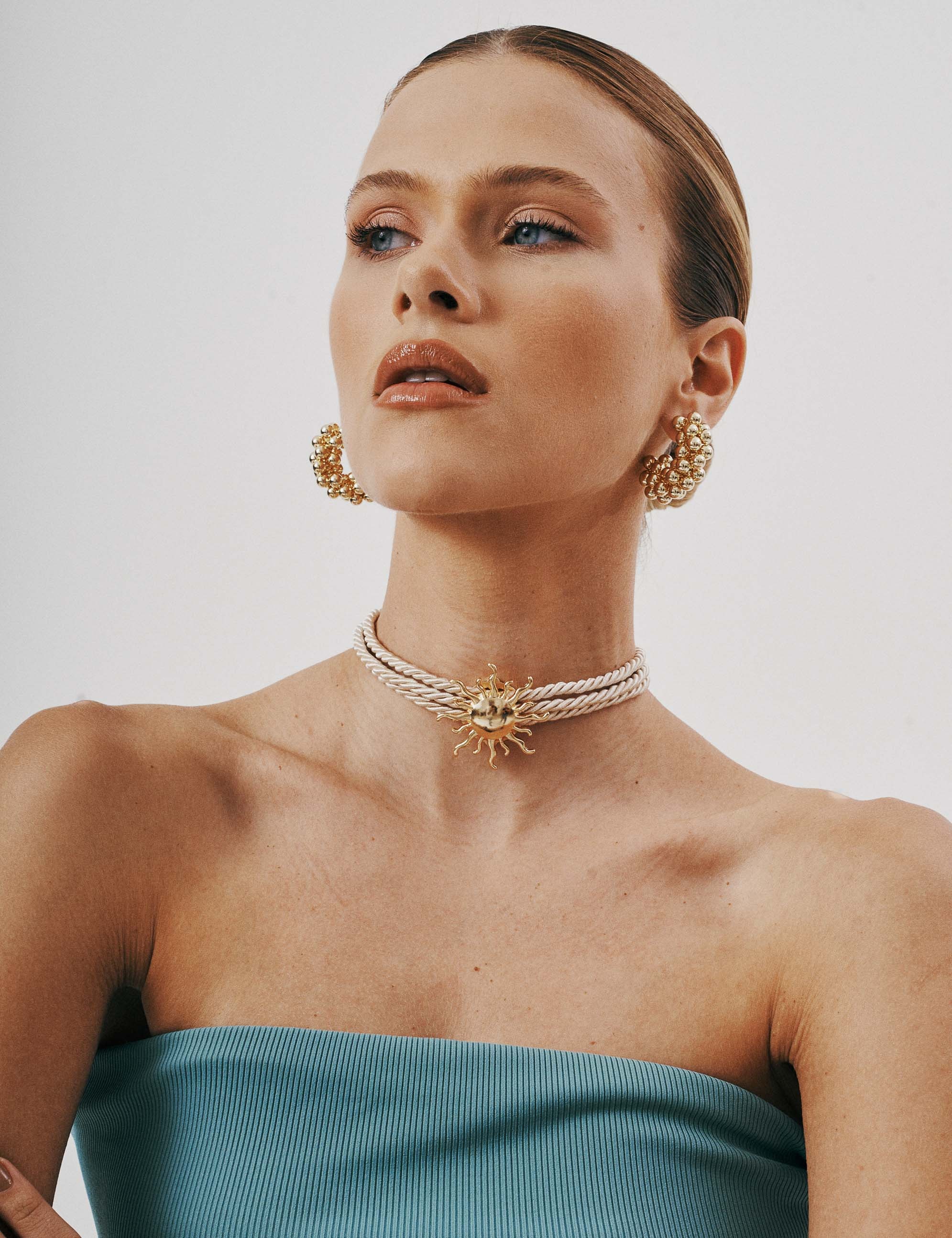 Choker off white com pingente de sol, delicada e radiante. Ideal para iluminar o visual com charme e elegância.