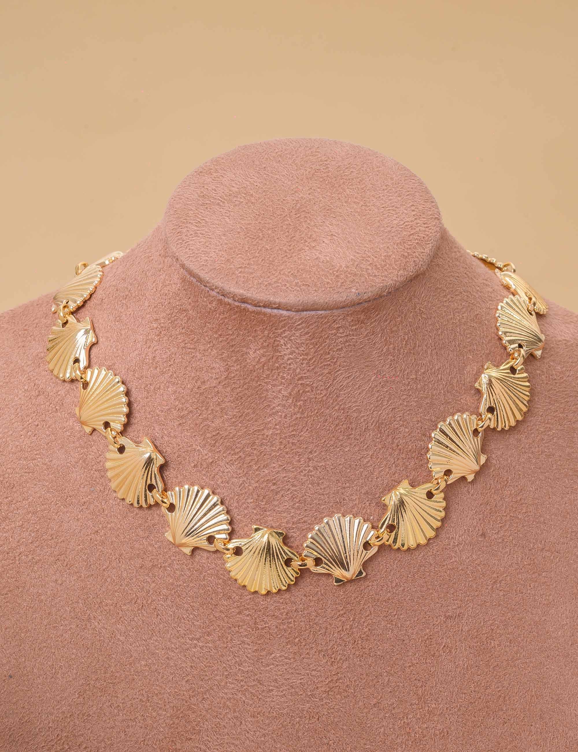 "Colar Choker dourada com pingentes de concha, símbolo de elegância e exclusividade, unindo o charme do mar ao luxo atemporal do ouro.