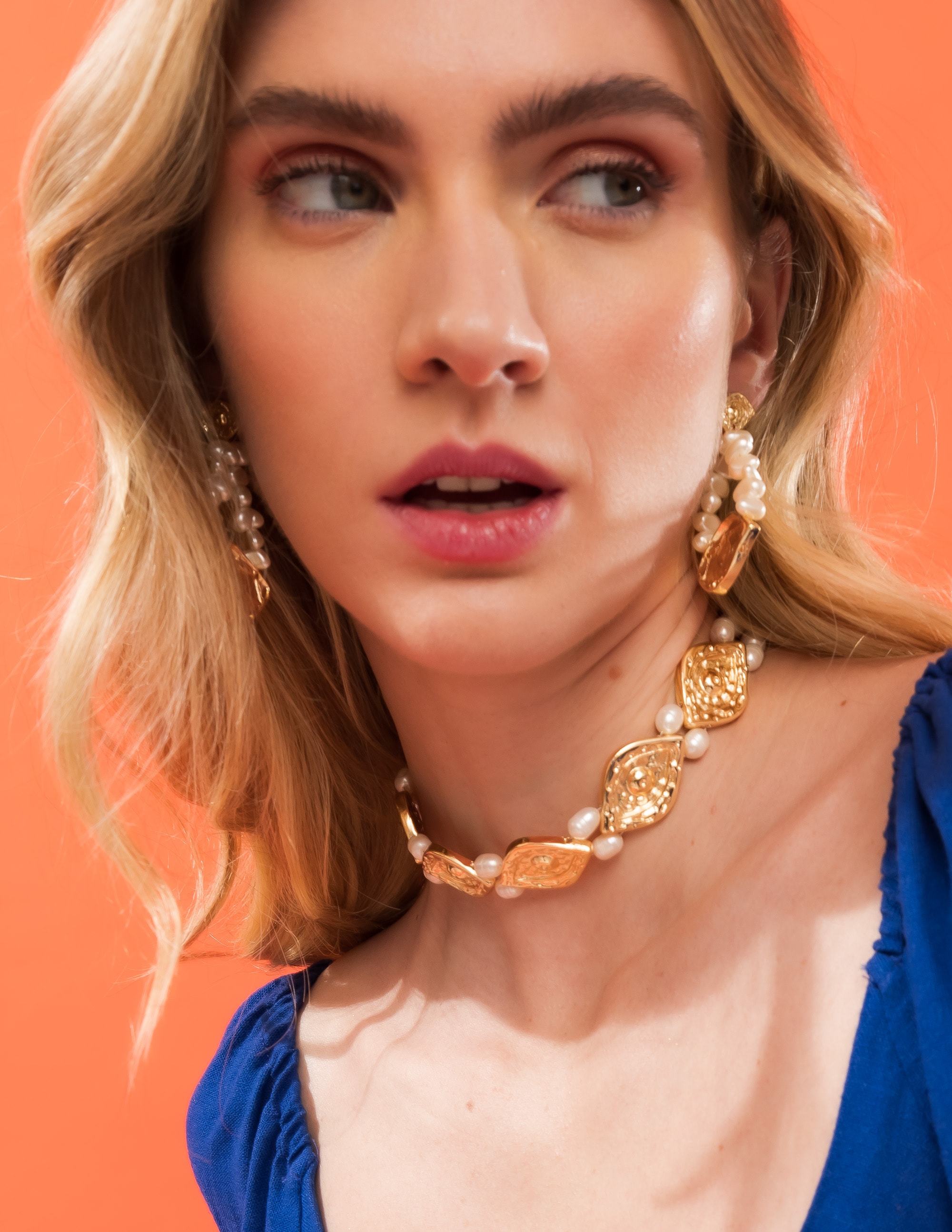 Colar com design marcante composto por pérolas e placas orgânicas texturizadas em acabamento ouro, inspiradas no formato de olho. A combinação das pérolas com os elementos em formato amendoado cria um visual sofisticado e contemporâneo, trazendo elegância e personalidade à peça.