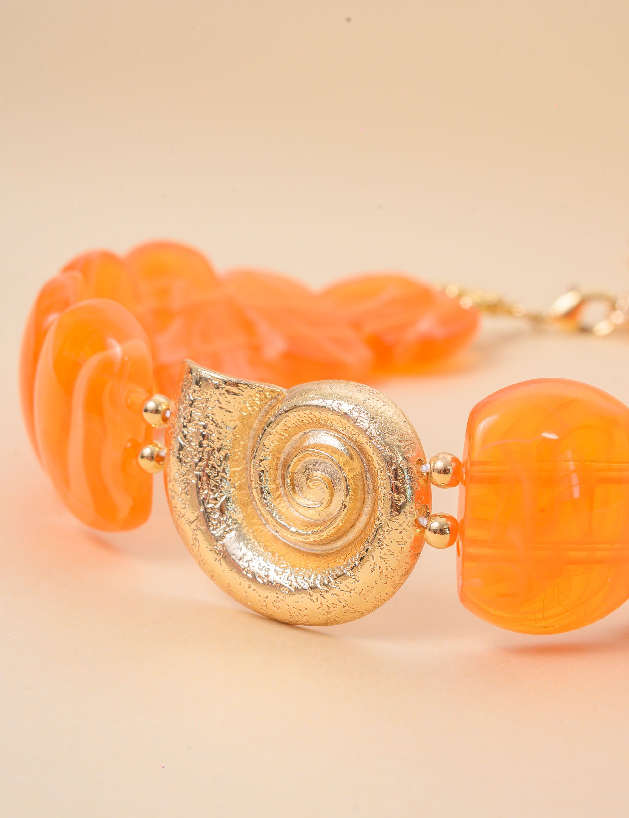 Colar choker concha com pedras laranja, elegante e natural. Perfeito para iluminar o visual com um toque de frescor.