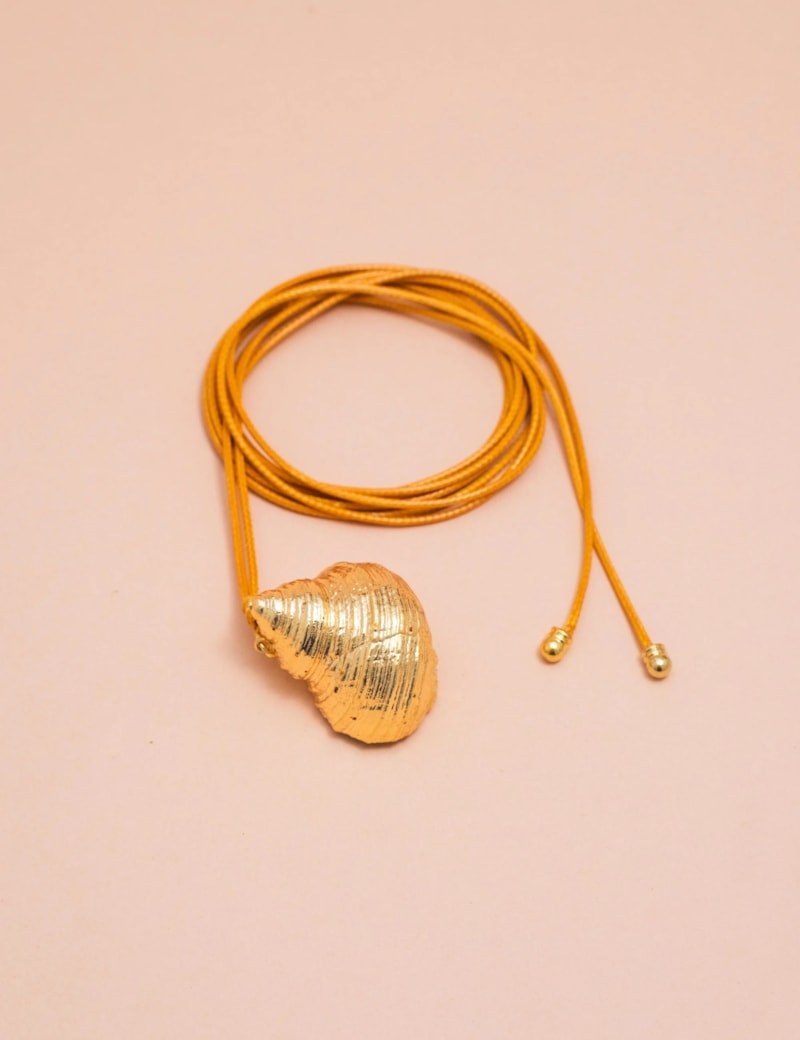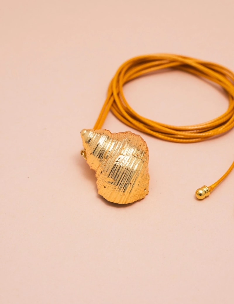 Colar com concha natural banhada a ouro, peça que combina elementos naturais com acabamento sofisticado. Fio de algodão na cor castor que traz estilo e personalidade ao visual.