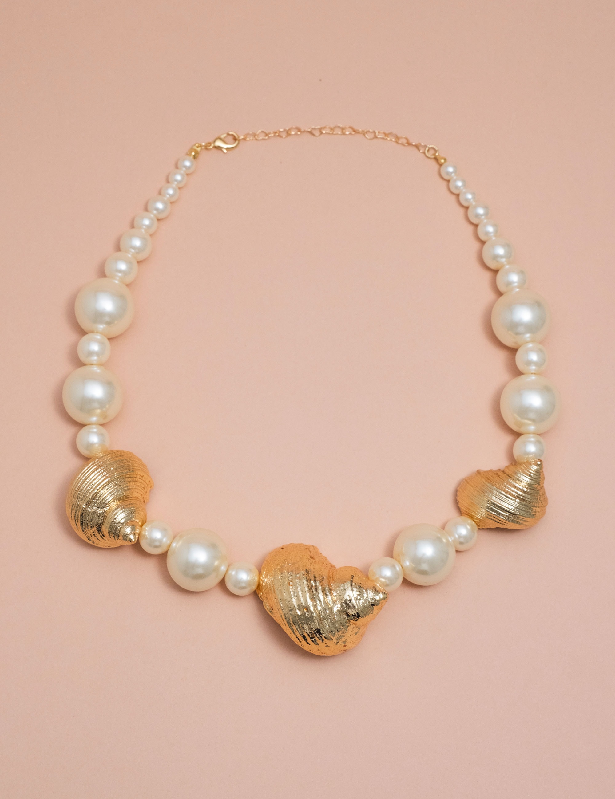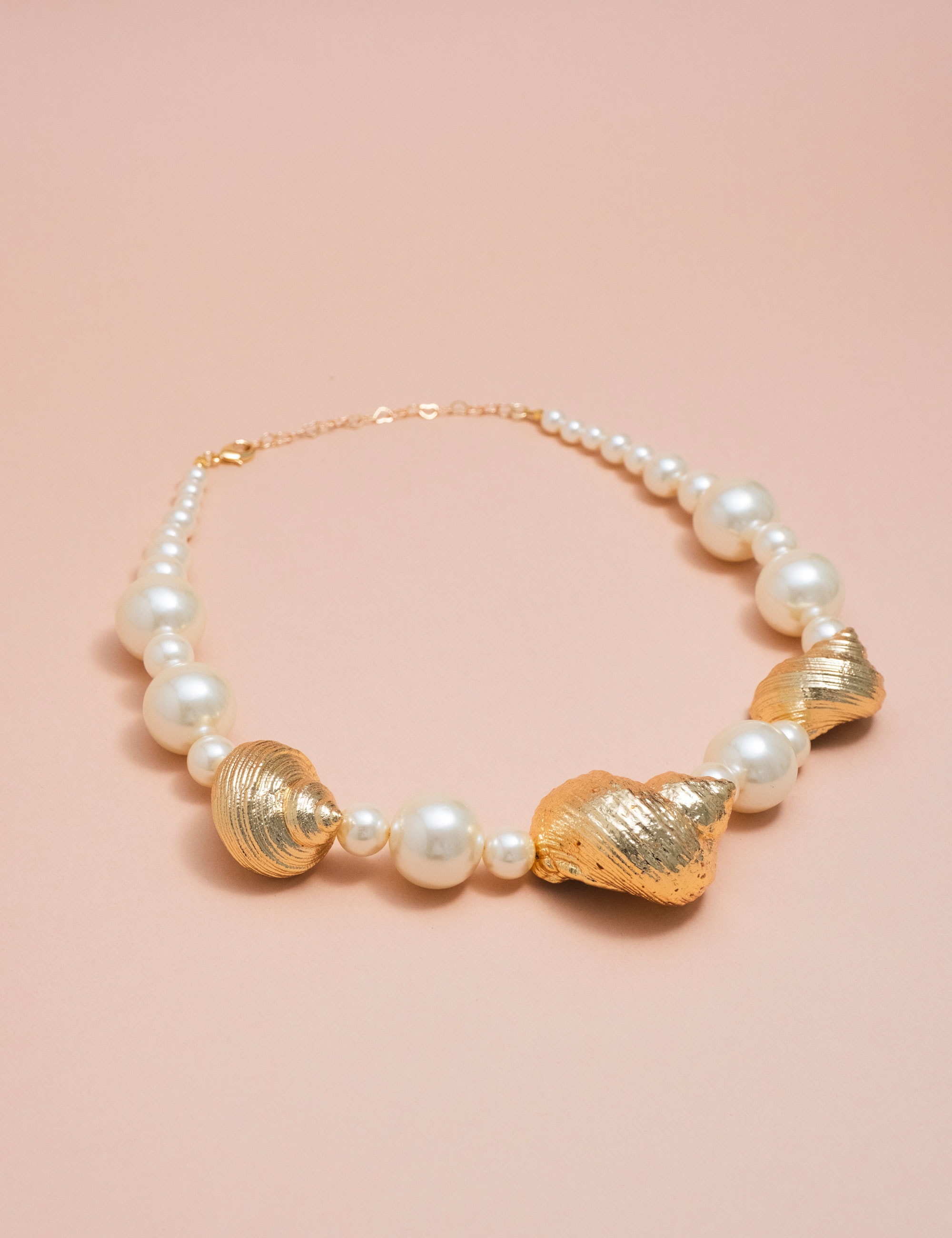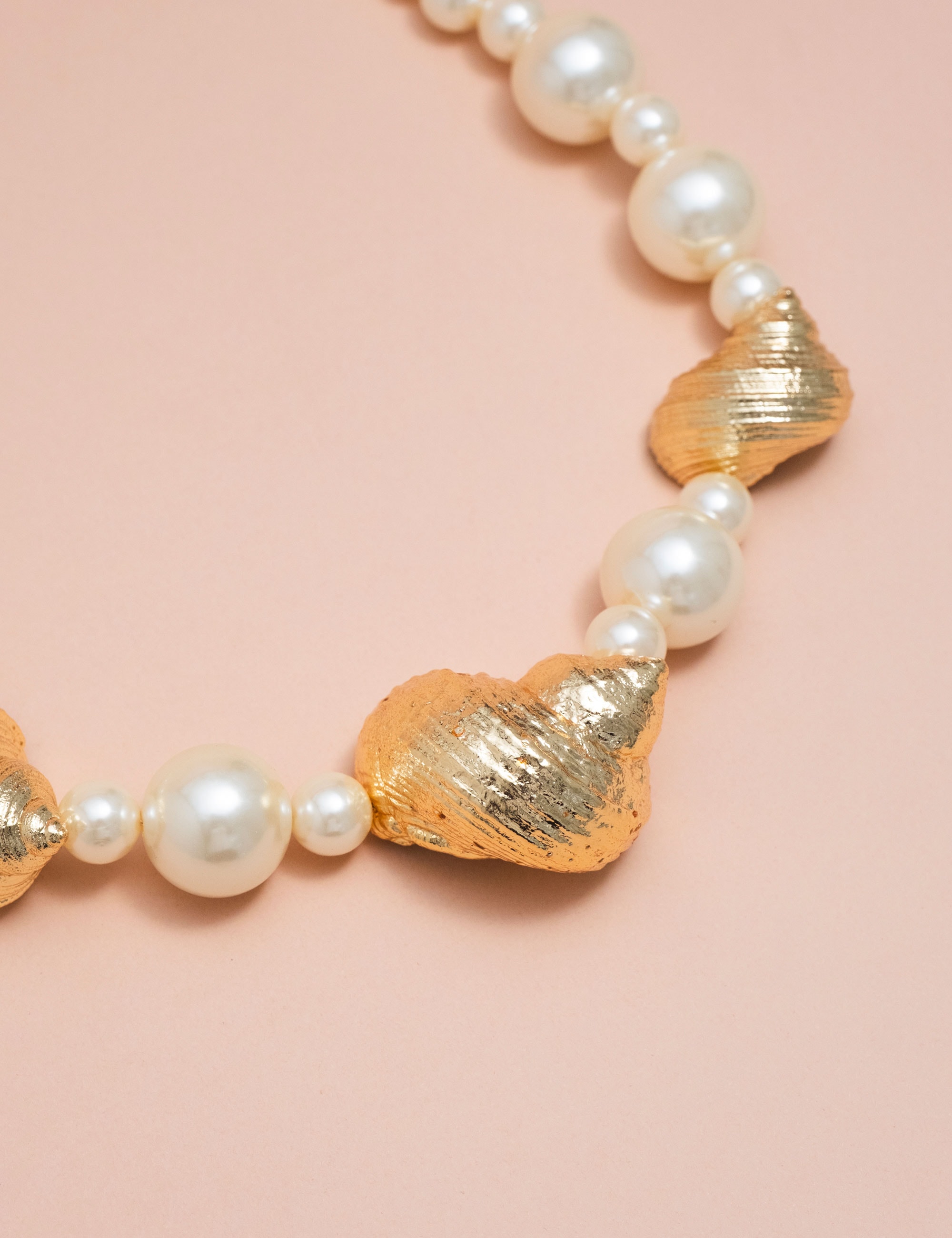 Peça: Colar banhado a ouro, pérola resinada e detalhes de concha natural banhada a ouro. Esta peça única combina a sofisticação dos canutilhos delicadamente entrelaçados com a vibrante beleza da concha natural, criando um acessório que exala charme e elegância.