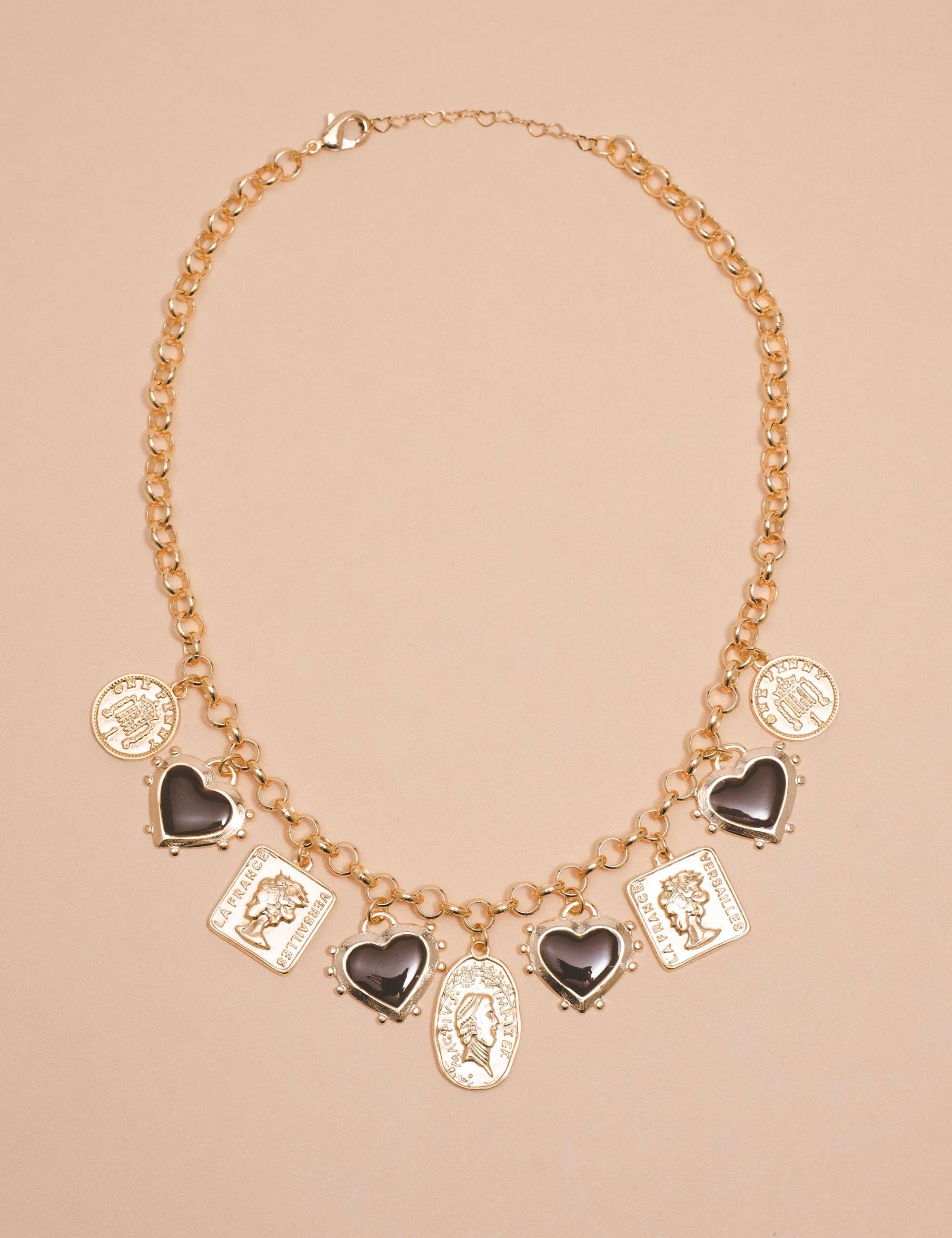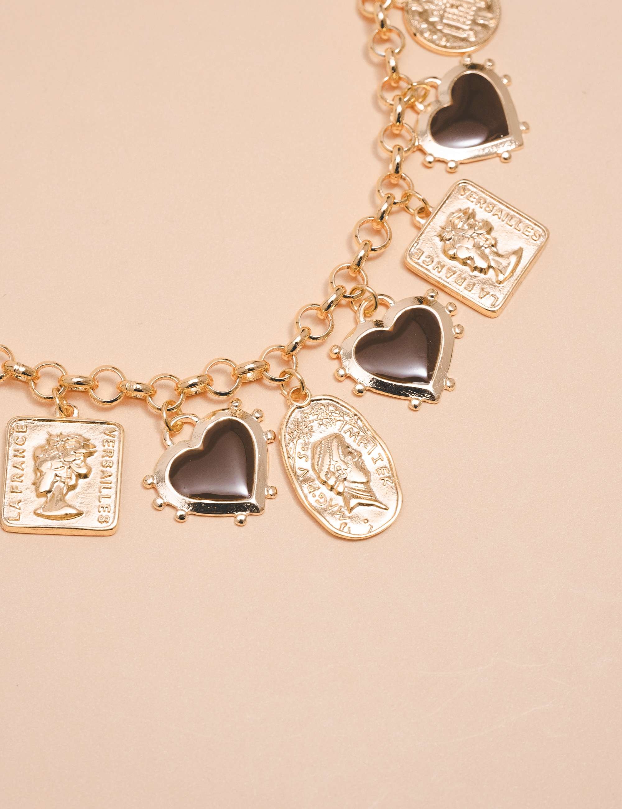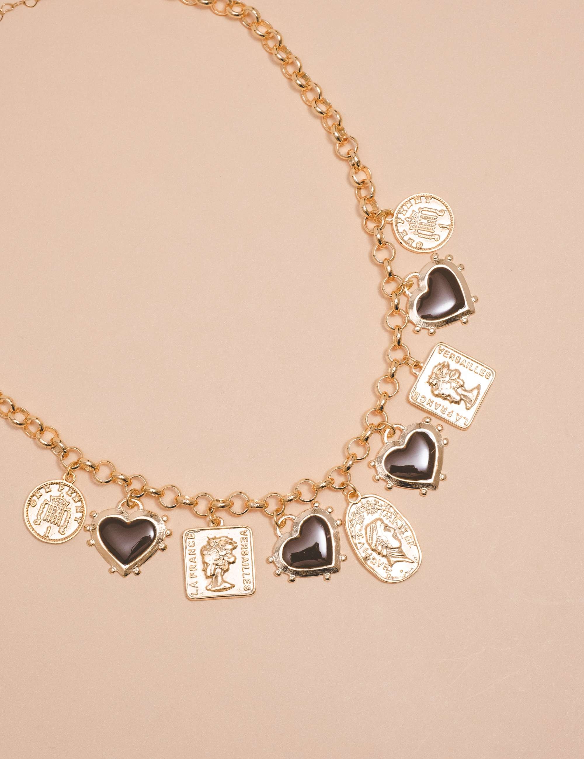 Peça: Colar com detalhes em corações e medalhas com uma textura orgânica. Ideal para aqueles que buscam acrescentar um toque de estilo exclusivo ao seu visual. Esses acessórios orgânicos são a escolha perfeita para expressar sua personalidade com sofisticação.