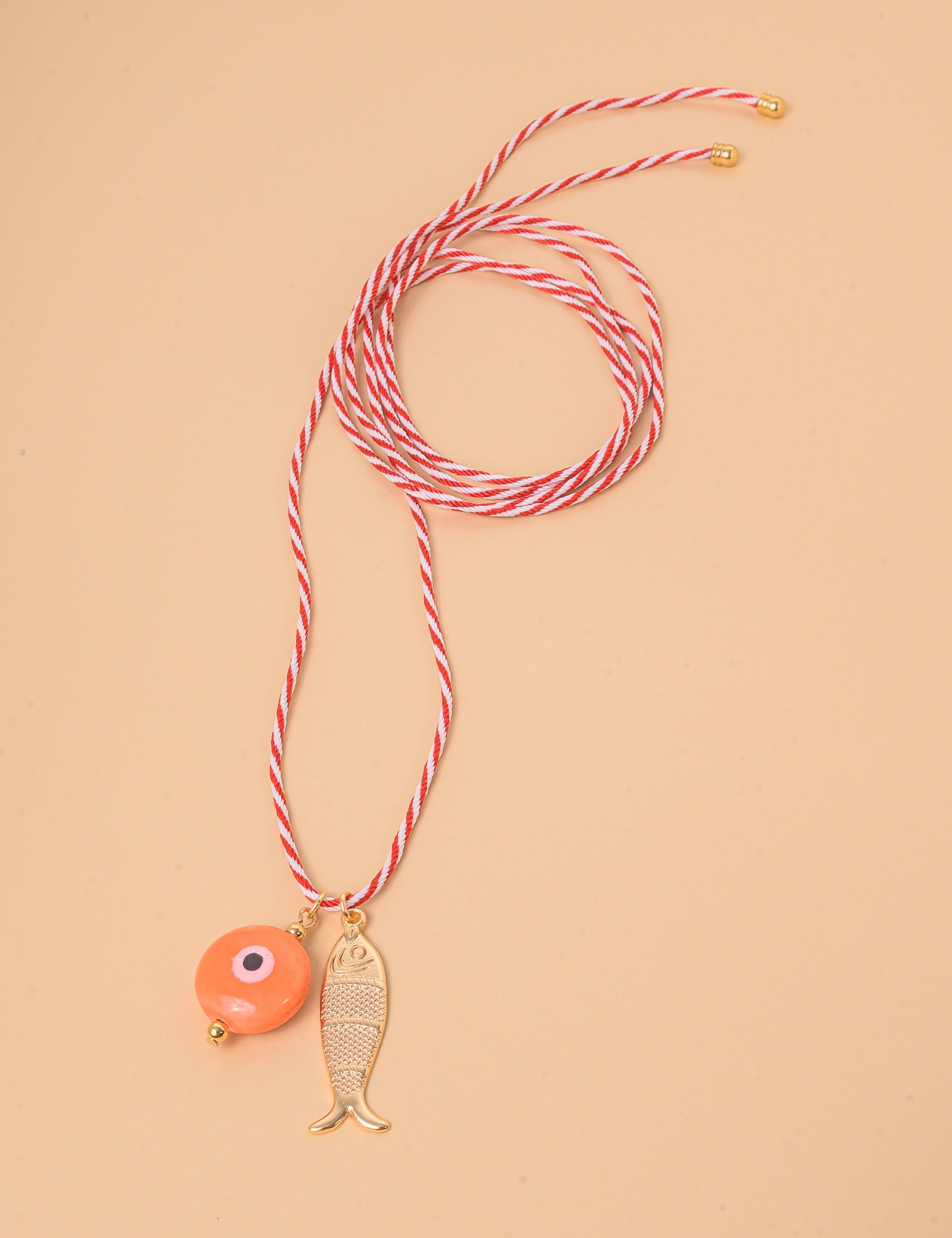 Colar com cordão torcido e pingente de peixe banhado a ouro com detalhe de olho grego laranja. Uma peça moderna e vibrante, ideal para destacar o visual com elegância e um toque de proteção.